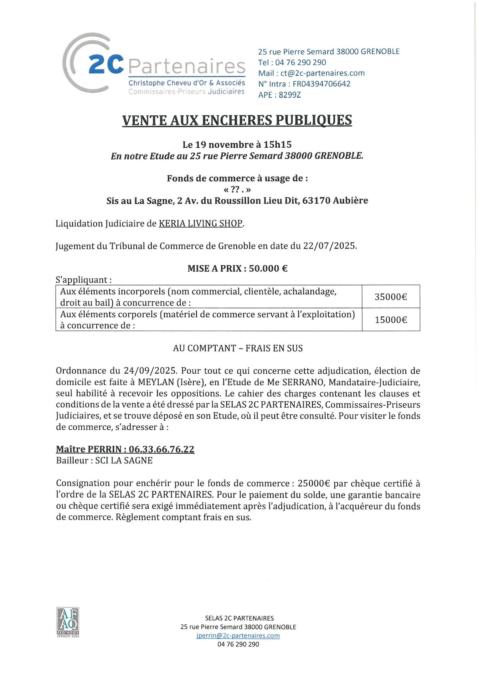 Order of 24/09/2025. For all matters relating to this auction, an address for service is given at MEYLAN (Isère), in the office of Me SERRANO, Judicial Representative, the only person authorised to receive objections. The specifications containing the clauses and conditions of the sale have been drawn up by SELAS 2C PARTENAIRES, Judicial Auctioneers, and are on file at their office, where they may be consulted. To visit the business, please contact :