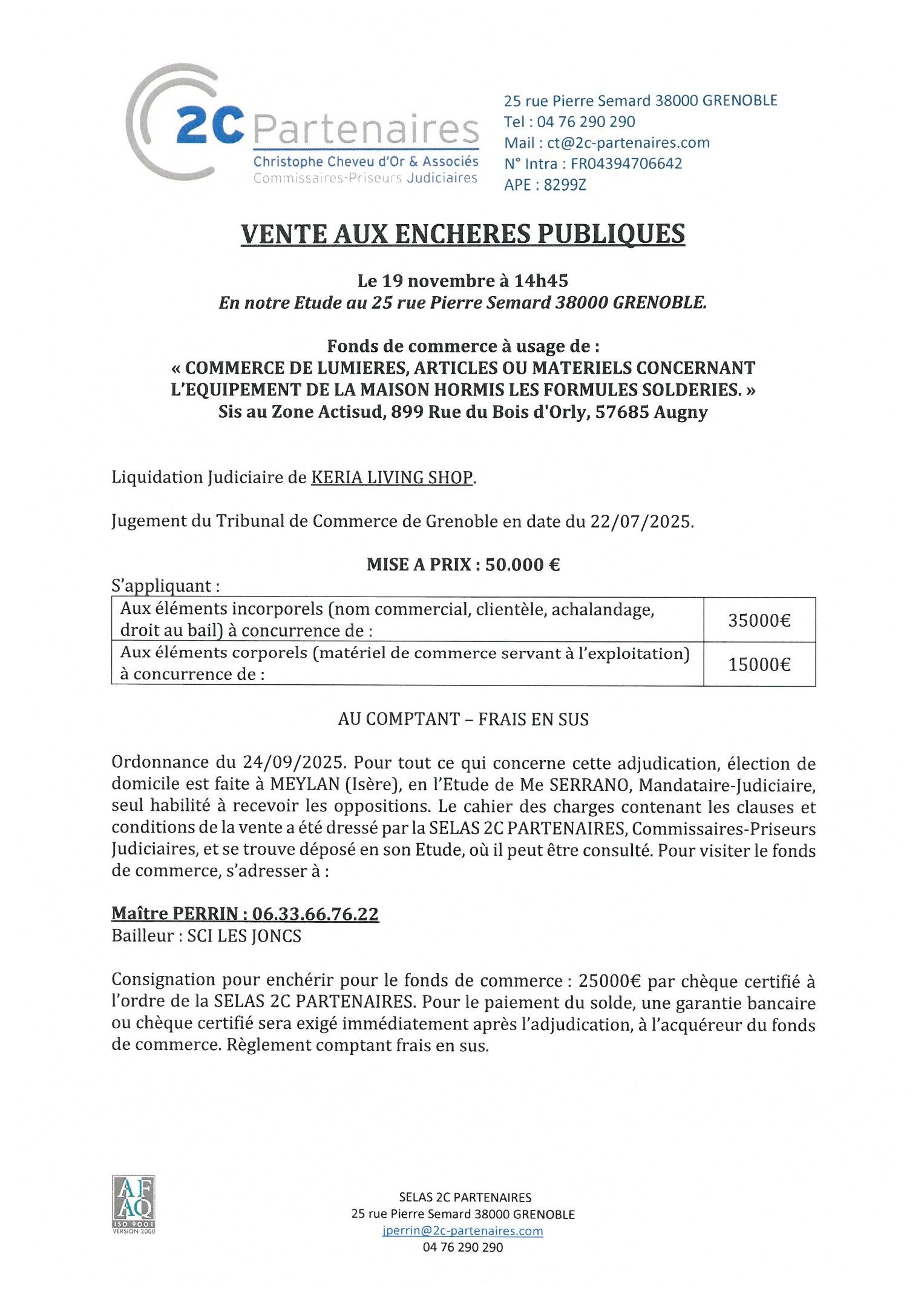 Order of 24/09/2025. For all matters relating to this auction, an address for service is given at MEYLAN (Isère), in the office of Me SERRANO, Judicial Representative, the only person authorised to receive objections. The specifications containing the terms and conditions of the sale have been drawn up by SELAS 2C PARTENAIRES, Judicial Auctioneers, and are on file at their office, where they may be consulted. To visit the business, please contact :