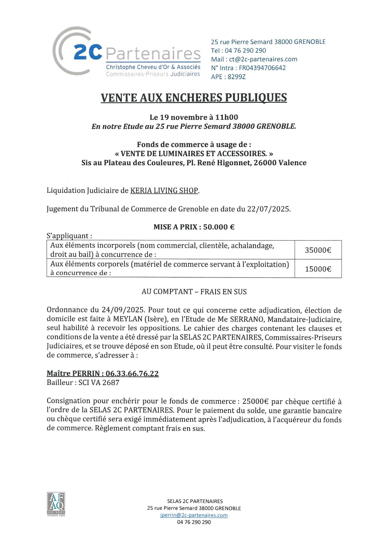 PUBLIC AUCTION November 19th at 11:00 am In our office at 25 rue Pierre Semard 38000 GRENOBLE. Business for the sale of : "SALE OF LIGHT FITTINGS AND ACCESSORIES". Located at Plateau des Couleures, Pl. René Higonnet, 26000 Valence. Judicial liquidation of KERIA LIVING SHOP. Judgement of the Grenoble Commercial Court dated 22/07/2025. RESERVE PRICE: €50,000 Applying to : Intangible assets (business name, customer base, goodwill, leasehold rights) up to: €35,000 Tangible assets (business equipment used in the business): €15,000 CASH - PLUS COSTS Order of 24/09/2025. For all matters relating to this auction, an address for service is given at MEYLAN (Isère), in the office of Me SERRANO, Judicial Representative, the only person authorised to receive objections. The specifications containing the clauses and conditions of the sale have been drawn up by SELAS 2C PARTENAIRES, Judicial Auctioneers, and are on file at their office, where they may be consulted. To visit the business, please contact : Maître PERRIN : 06.33.66.76.22 Lessor: SCI VA 2687 Deposit to bid for the business: €25,000 by certified cheque made payable to SELAS 2C PARTENAIRES. For payment of the balance, a bank guarantee or certified cheque will be required from the purchaser of the business immediately after the auction. Cash payment plus costs. TO TAKE PART IN THE AUCTION, A BANK CHEQUE OR TRANSFER FOR THE AMOUNT OF THE DEPOSIT MUST BE DEPOSITED IN OUR OFFICE BEFORE 14/11/25.