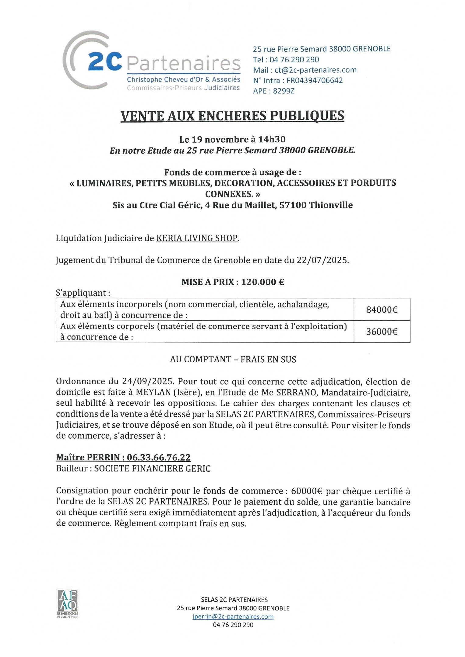 Order of 24/09/2025. For all matters relating to this auction, an address for service is given at MEYLAN (Isère), in the office of Me SERRANO, Judicial Representative, the only person authorised to receive objections. The specifications containing the terms and conditions of the sale have been drawn up by SELAS 2C PARTENAIRES, Judicial Auctioneers, and are on file at their office, where they may be consulted. To visit the business, please contact :