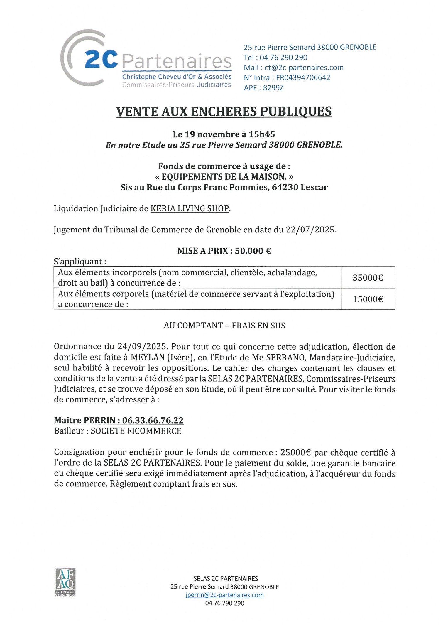 Order of 24/09/2025. For all matters relating to this auction, an address for service is given at MEYLAN (Isère), in the office of Me SERRANO, Judicial Representative, the only person authorised to receive objections. The specifications containing the clauses and conditions of the sale have been drawn up by SELAS 2C PARTENAIRES, Judicial Auctioneers, and are on file at their office, where they may be consulted. To visit the business, please contact :