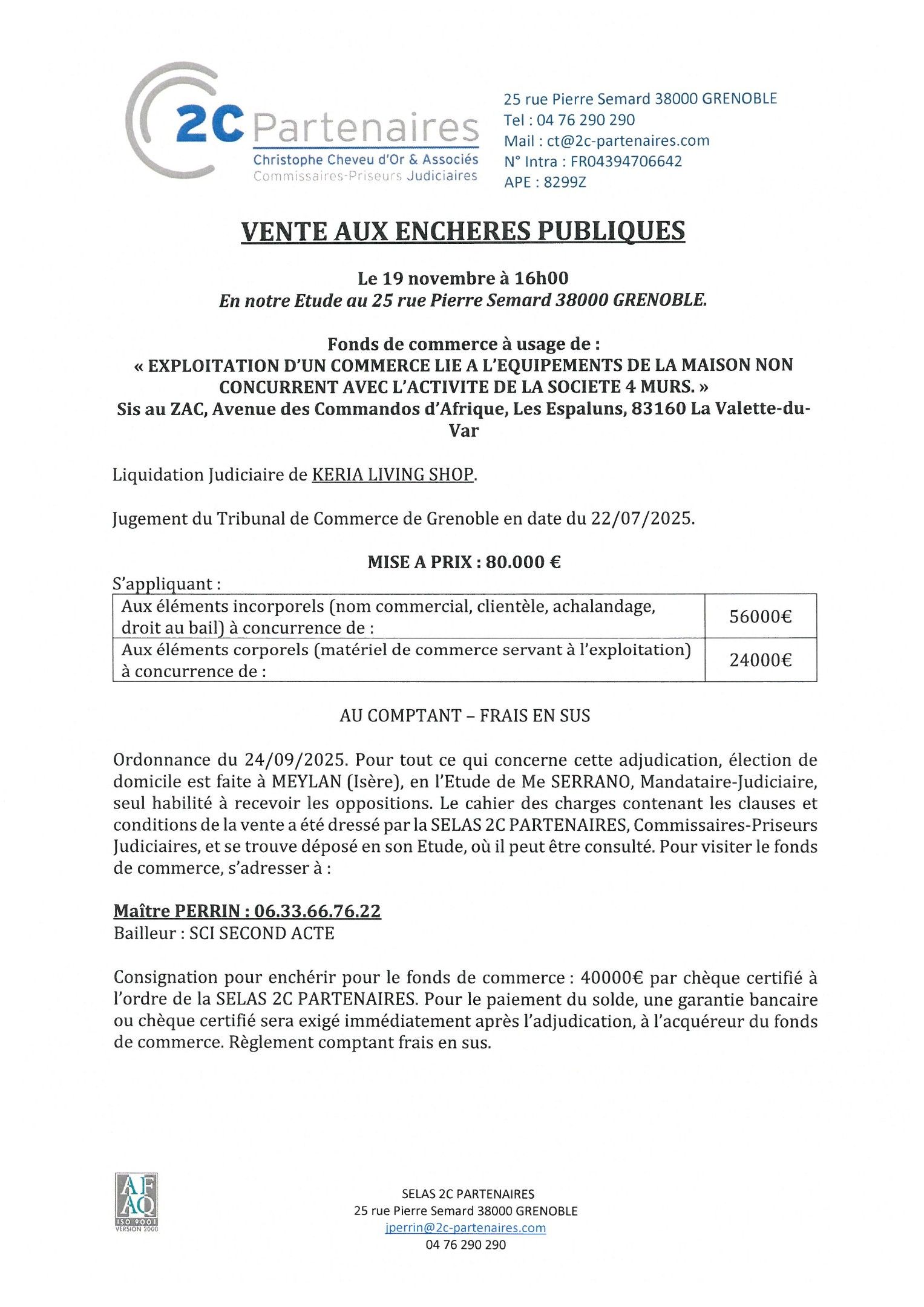 PUBLIC AUCTION November 19th at 4.00 pm In our office at 25 rue Pierre Semard 38000 GRENOBLE. Goodwill for use as : "OPERATION OF A BUSINESS RELATED TO HOME FURNISHINGS THAT IS NOT IN COMPETITION WITH THE ACTIVITY OF THE COMPANY 4 MURS. Located at ZAC, Avenue des Commandos d'Afrique, Les Espaluns, 83160 La Valette-du-Var. Judicial liquidation of KERIA LIVING SHOP. Judgement of the Grenoble Commercial Court dated 22/07/2025. PRICE: €80,000 Applying to : Intangible assets (business name, customer base, goodwill, leasehold rights): €56,000 Tangible assets (business equipment used in the business): €24,000 CASH - PLUS COSTS Order of 24/09/2025. For all matters relating to this auction, an address for service is given at MEYLAN (Isère), in the office of Me SERRANO, Judicial Representative, the only person authorised to receive objections. The specifications containing the clauses and conditions of the sale have been drawn up by SELAS 2C PARTENAIRES, Judicial Auctioneers, and are on file at their office, where they may be consulted. To visit the business, please contact : Maître PERRIN : 06.33.66.76.22 Lessor: SCI SECOND ACTE Deposit to bid for the business: €40,000 by certified cheque made payable to SELAS 2C PARTENAIRES. For payment of the balance, a bank guarantee or certified cheque will be required from the purchaser of the business immediately after the auction. Cash payment plus costs.