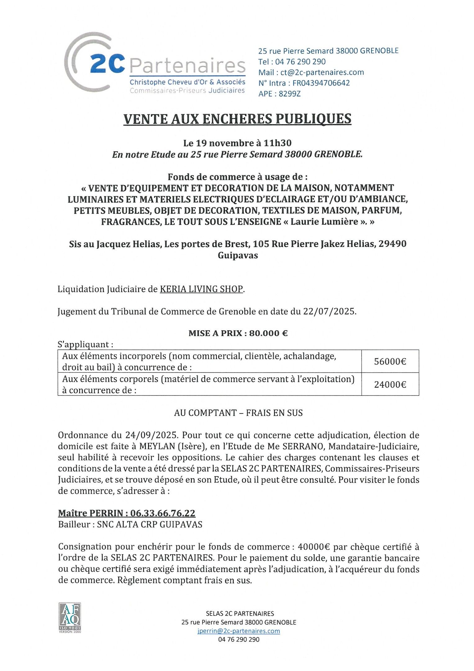 PUBLIC AUCTION 19th November at 11.30am In our office at 25 rue Pierre Semard 38000 GRENOBLE. Goodwill for use as : "SALE OF HOME EQUIPMENT AND DECORATION, IN PARTICULAR LIGHTING AND ELECTRICAL EQUIPMENT FOR LIGHTING AND/OR AMBIANCE, SMALL FURNITURE, DECORATION OBJECTS, HOME TEXTILES, PERFUM, FRAGRANCES, ALL UNDER THE BRAND "Laurie Lumière". Located at Jacquez Helias, Les portes de Brest, 105 Rue Pierre Jakez Helias, 29490 Guipavas Judicial liquidation of KERIA LIVING SHOP. Judgement of the Grenoble Commercial Court dated 22/07/2025. PRICE: €80,000 Applying to : Intangible assets (business name, customer base, goodwill, leasehold rights): €56,000 Tangible assets (business equipment used in the business): €24,000 CASH - PLUS COSTS Order of 24/09/2025. For all matters relating to this auction, an address for service is given at MEYLAN (Isère), in the office of Me SERRANO, Judicial Representative, the only person authorised to receive objections. The specifications containing the terms and conditions of the sale have been drawn up by SELAS 2C PARTENAIRES, Judicial Auctioneers, and are on file at their office, where they may be consulted. To visit the business, please contact : Maître PERRIN : 06.33.66.76.22 Lessor: SNC ALTA CRP GUIPAVAS Deposit to bid for the business: €40,000 by certified cheque made payable to SELAS 2C PARTENAIRES. For payment of the balance, a bank guarantee or certified cheque will be required from the purchaser of the business immediately after the auction. Cash payment plus costs.