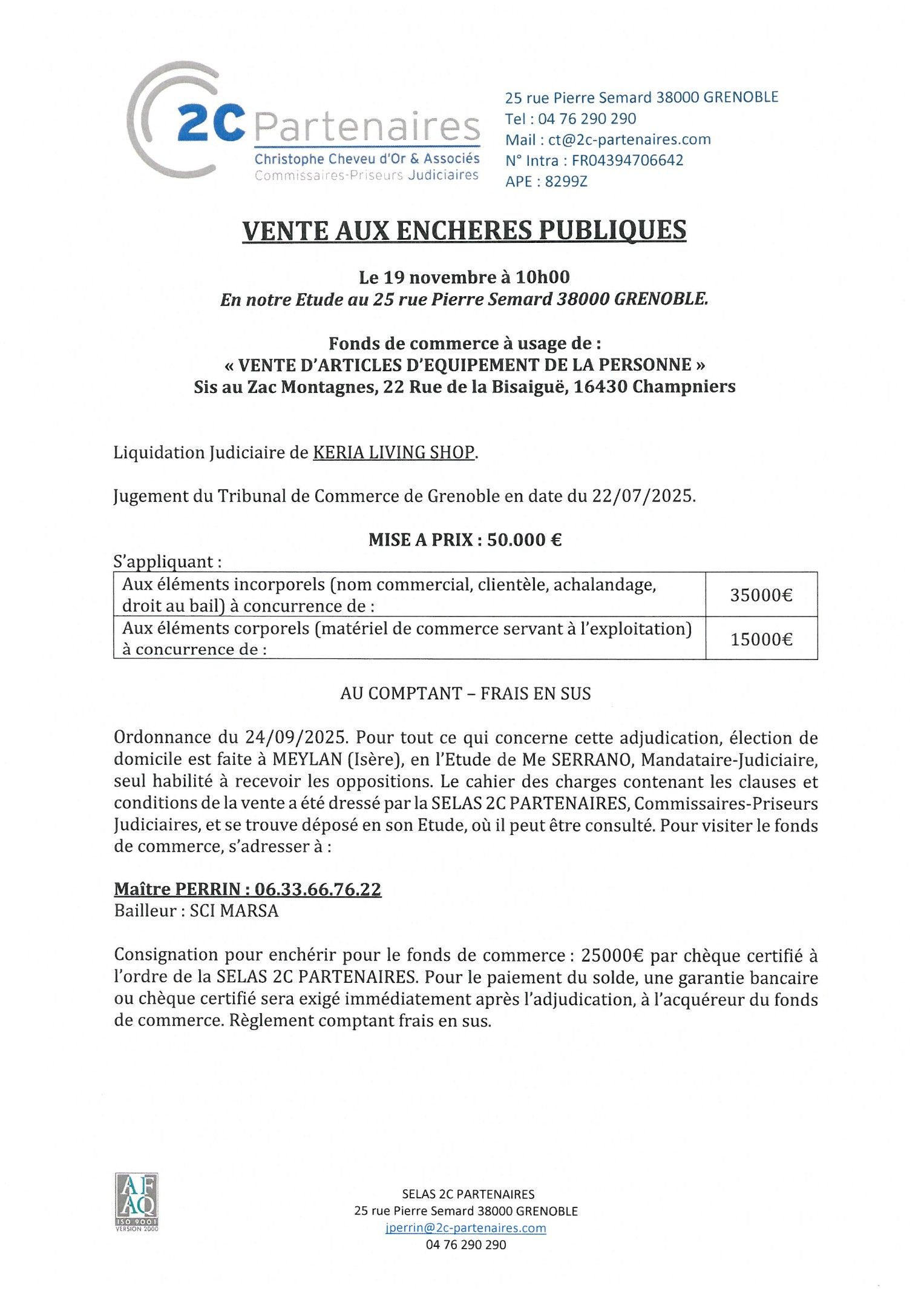 Order of 24/09/2025. For all matters relating to this auction, an address for service is given at MEYLAN (Isère), in the office of Me SERRANO, Judicial Representative, the only person authorised to receive objections. The specifications containing the terms and conditions of the sale have been drawn up by SELAS 2C PARTENAIRES, Judicial Auctioneers, and are on file at their office, where they may be consulted. To visit the business, please contact :