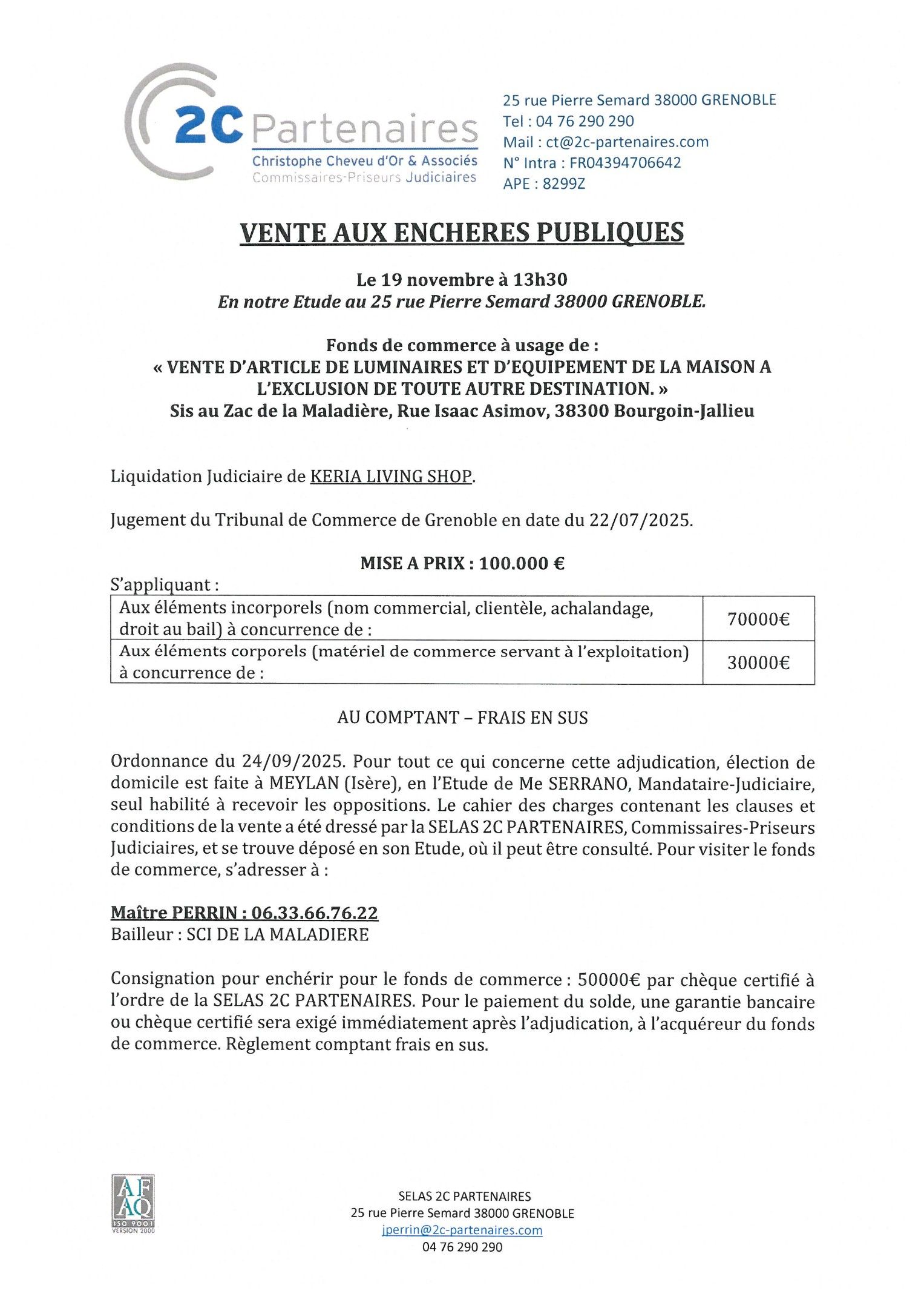 Order of 24/09/2025. For all matters relating to this auction, an address for service is given at MEYLAN (Isère), in the office of Me SERRANO, Judicial Representative, the only person authorised to receive objections. The specifications containing the terms and conditions of the sale have been drawn up by SELAS 2C PARTENAIRES, Judicial Auctioneers, and are on file at their office, where they may be consulted. To visit the business, please contact :