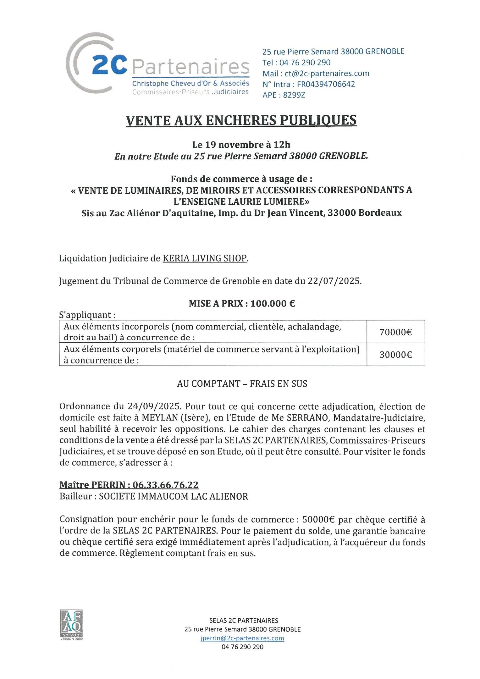 PUBLIC AUCTION 19th November at 12 noon In our office at 25 rue Pierre Semard 38000 GRENOBLE. Goodwill for use as : "SALE OF LIGHT FITTINGS, MIRRORS AND RELATED ACCESSORIES UNDER THE NAME LAURIE LUMIERE". Located at Zac Aliénor D'aquitaine, Imp. du Dr Jean Vincent, 33000 Bordeaux Judicial liquidation of KERIA LIVING SHOP. Judgment of the Grenoble Commercial Court dated 22/07/2025. RESERVE PRICE: €100,000 Applying to : Intangible assets (business name, customer base, goodwill, leasehold rights) up to: €70,000 Tangible assets (business equipment used in the business): €30,000 CASH - PLUS COSTS Order of 24/09/2025. For all matters relating to this auction, an address for service is given at MEYLAN (Isère), in the office of Me SERRANO, Judicial Representative, the only person authorised to receive objections. The specifications containing the terms and conditions of the sale have been drawn up by SELAS 2C PARTENAIRES, Judicial Auctioneers, and are on file at their office, where they may be consulted. To visit the business, please contact : Maître PERRIN : 06.33.66.76.22 Lessor: SOCIETE IMMAUCOM LAC ALIENOR Deposit to bid for the business: €50,000 by certified cheque made payable to SELAS 2C PARTENAIRES. For payment of the balance, a bank guarantee or certified cheque will be required from the purchaser of the business immediately after the auction. Cash payment plus costs.