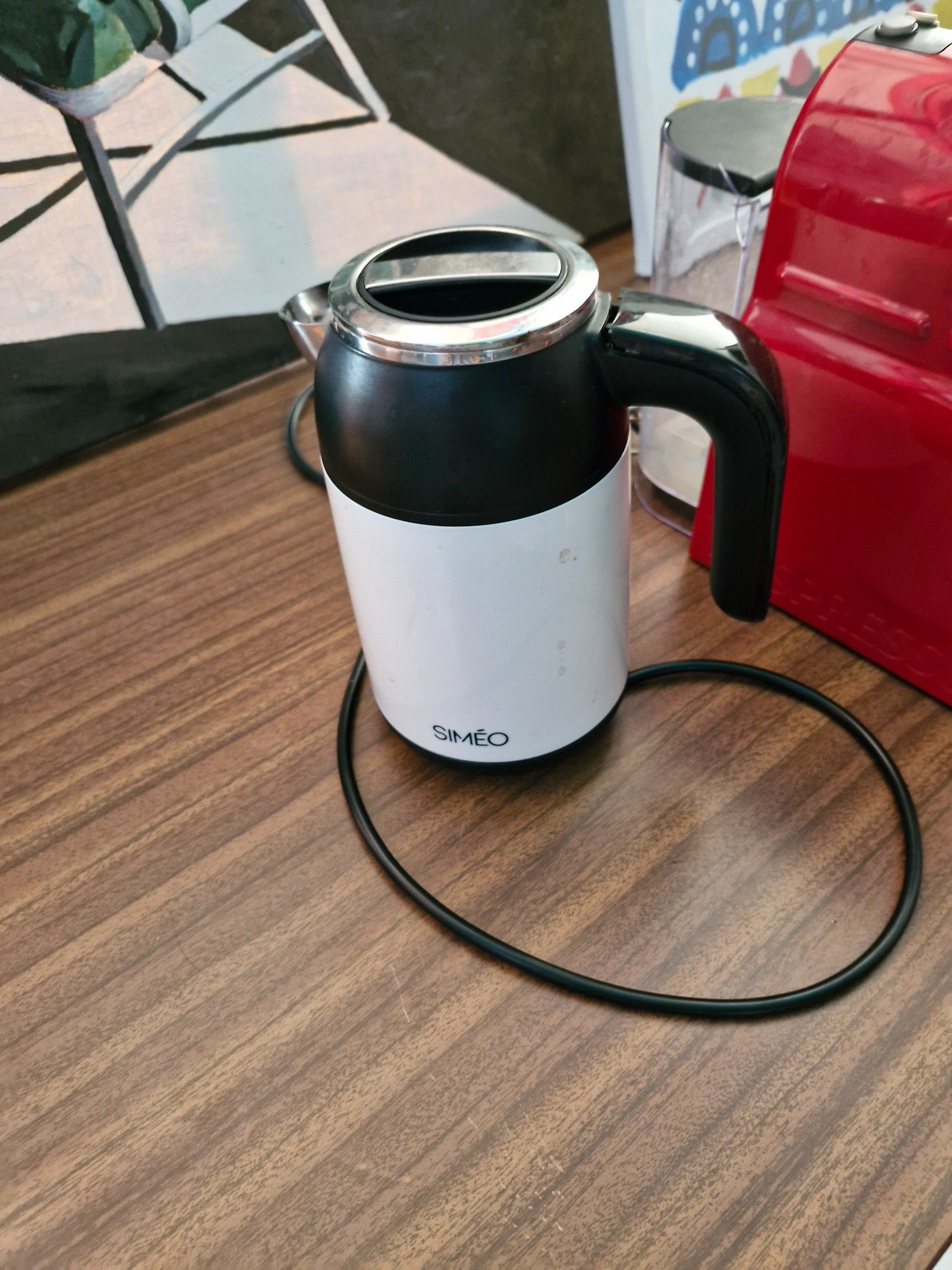 BLUESKY microwave. KRUPS coffee machine. A SIMEO kettle is included.