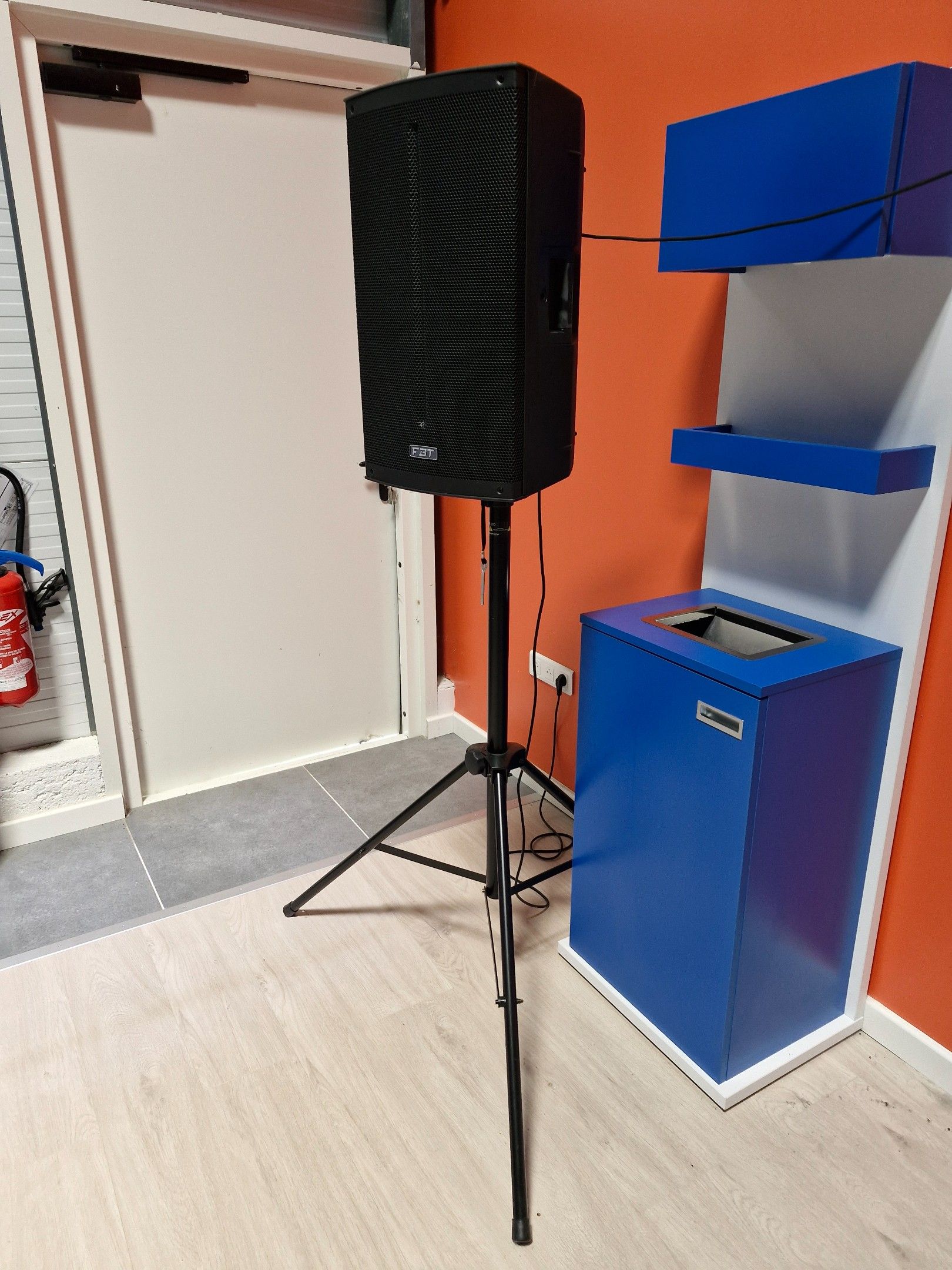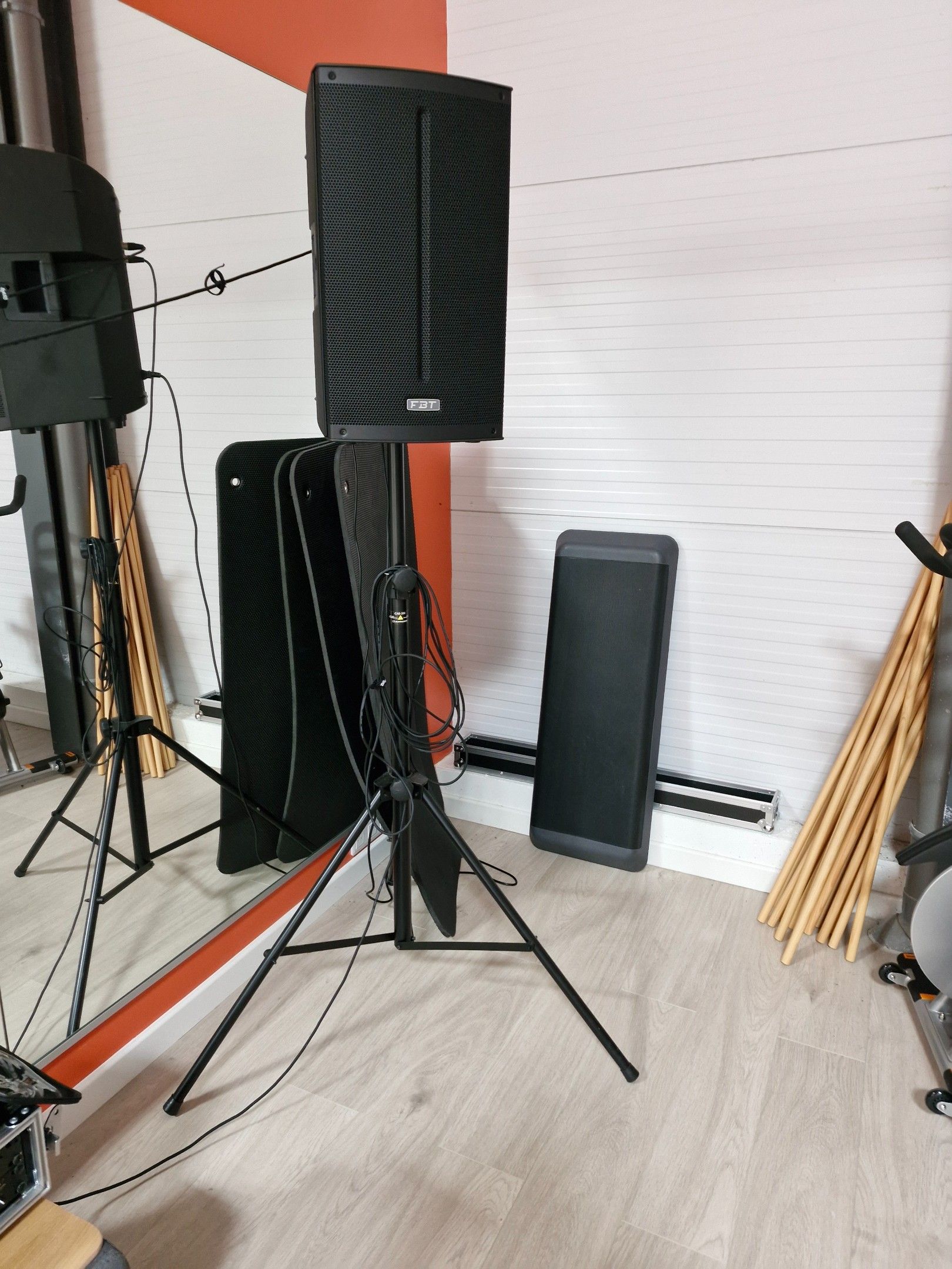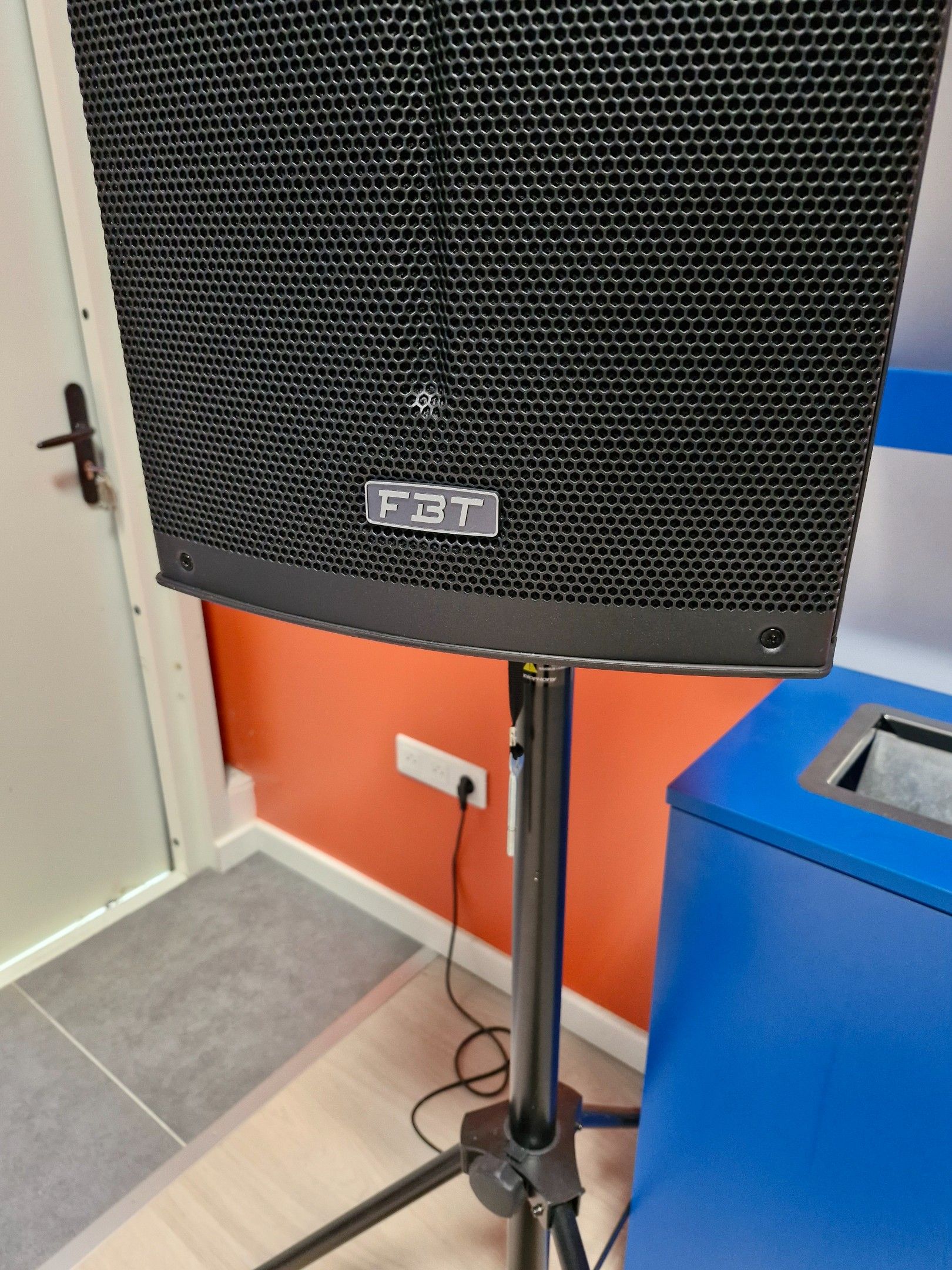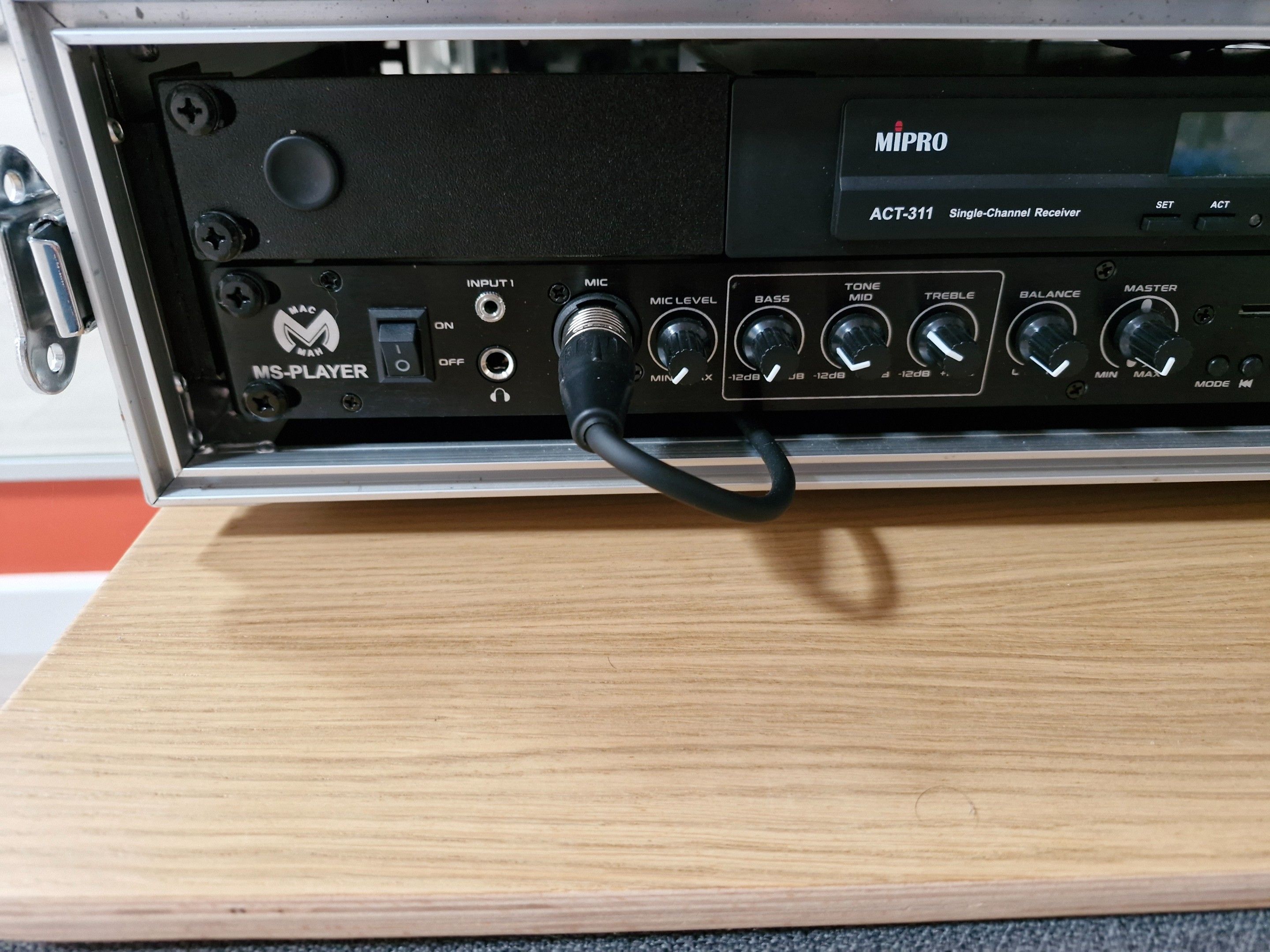 MS-PLAYER MIPRO ACT-311 group PA system with two FBT speakers on black metal stands