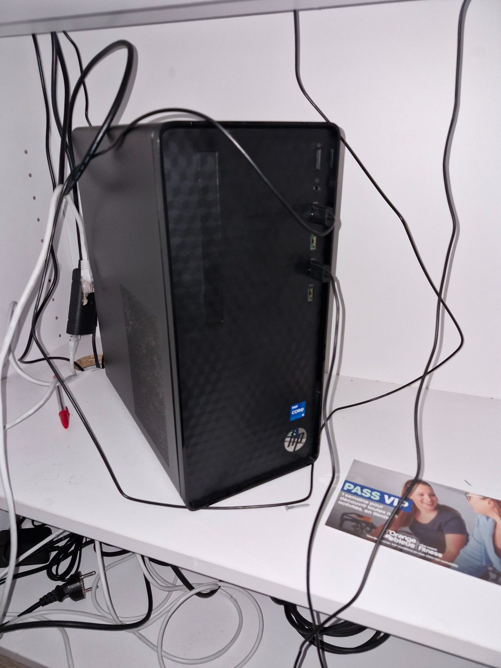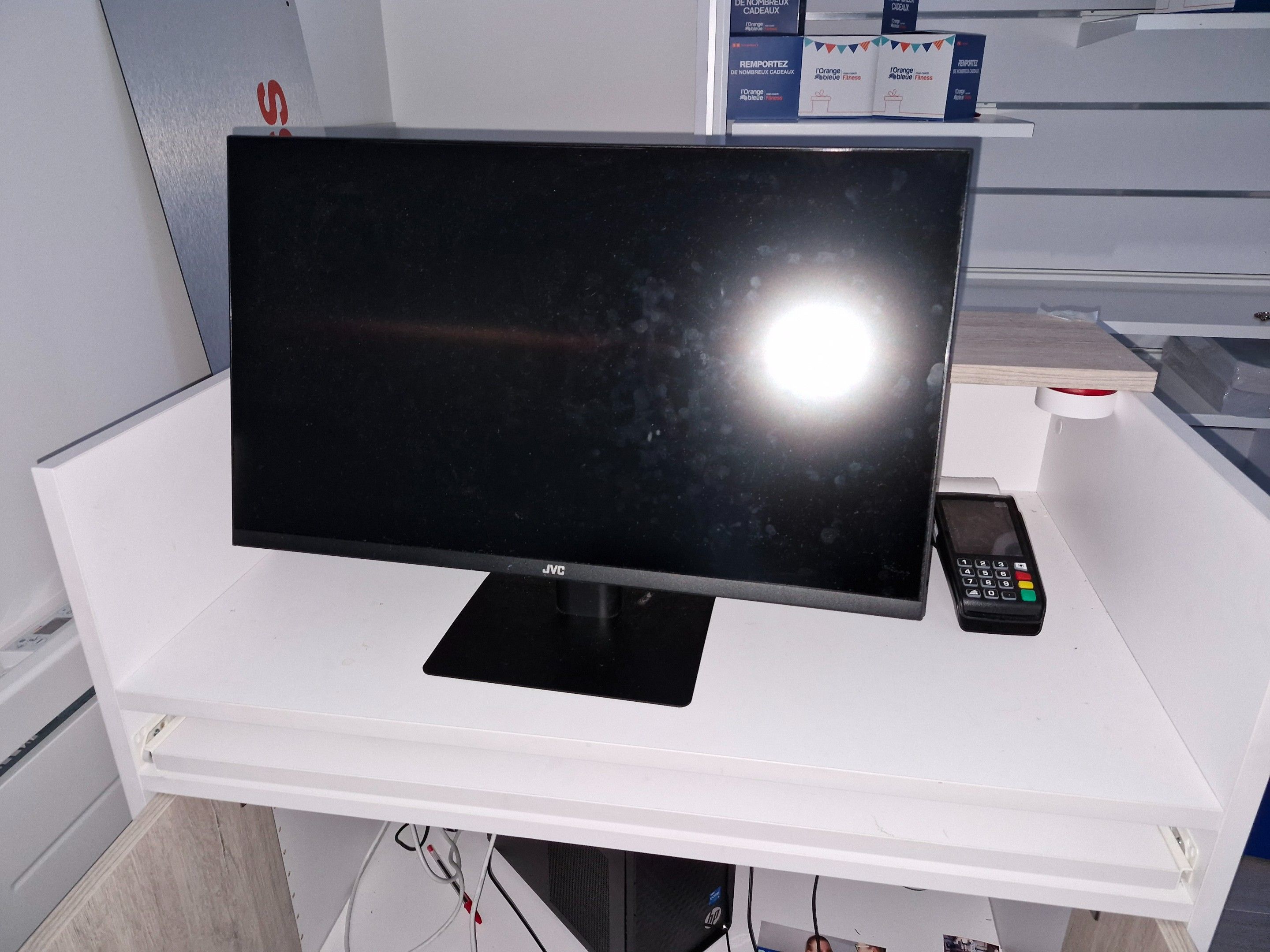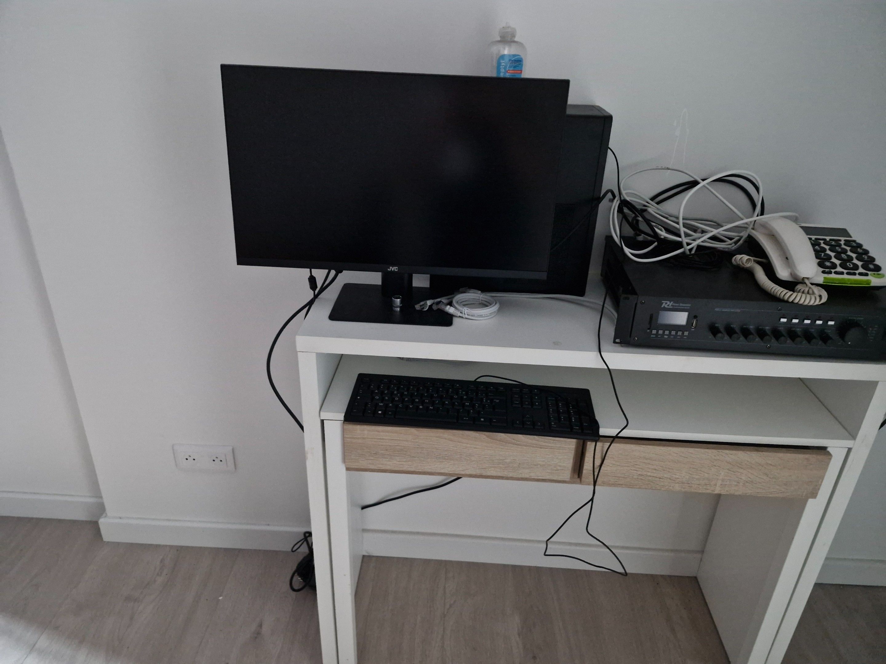 Two fixed computers including: two JVC screens, two HP towers and an HP wired keyboard