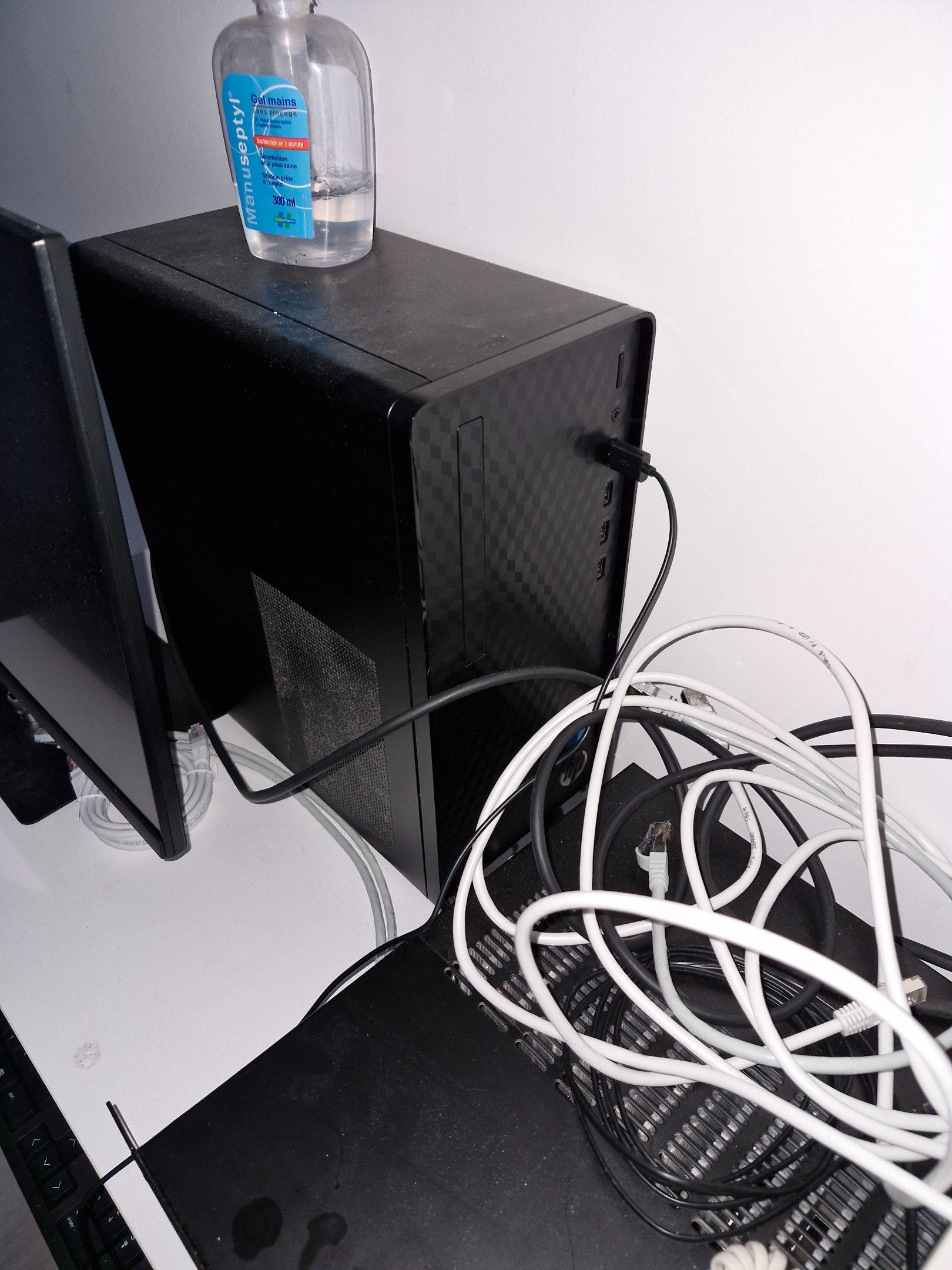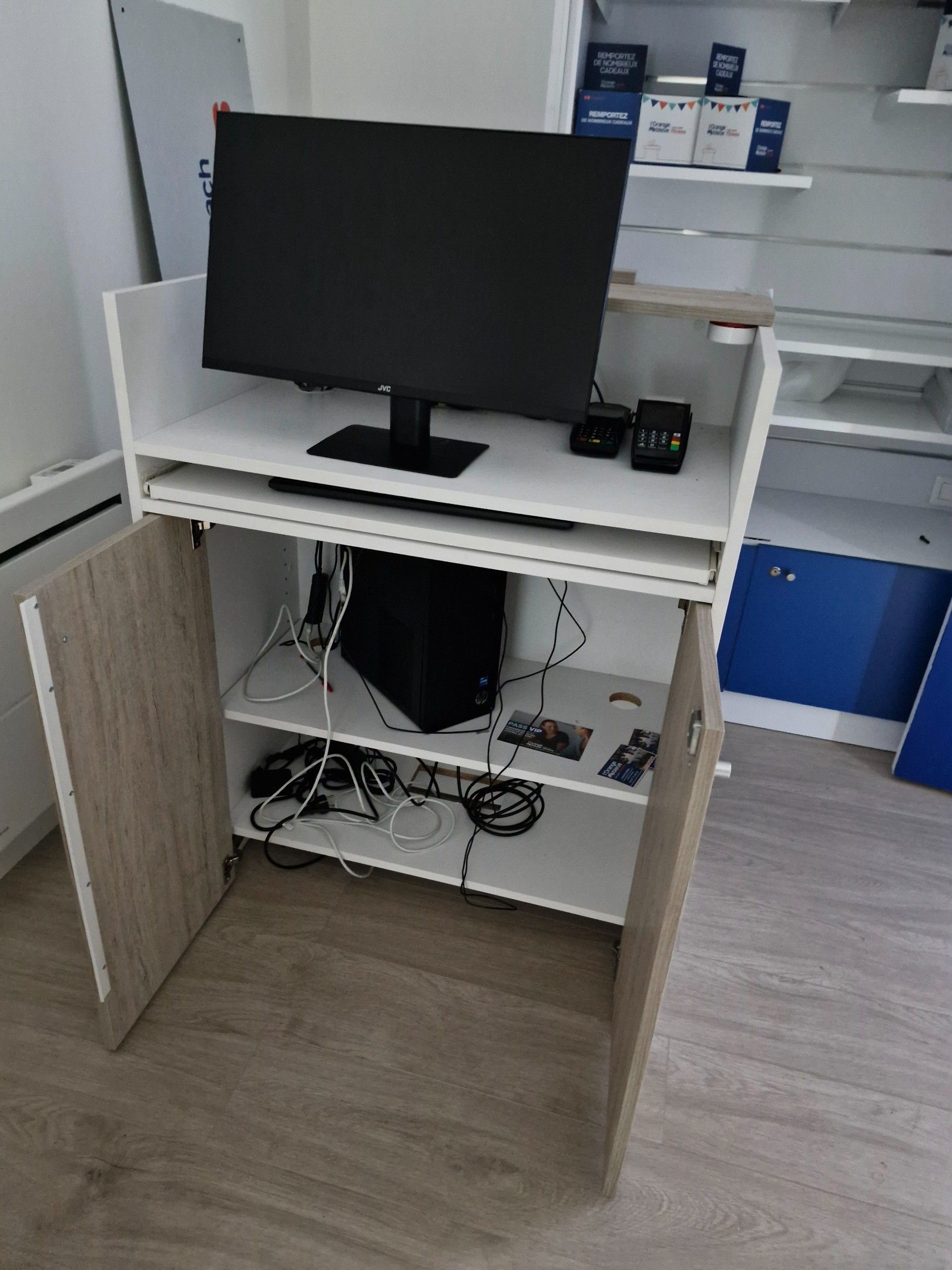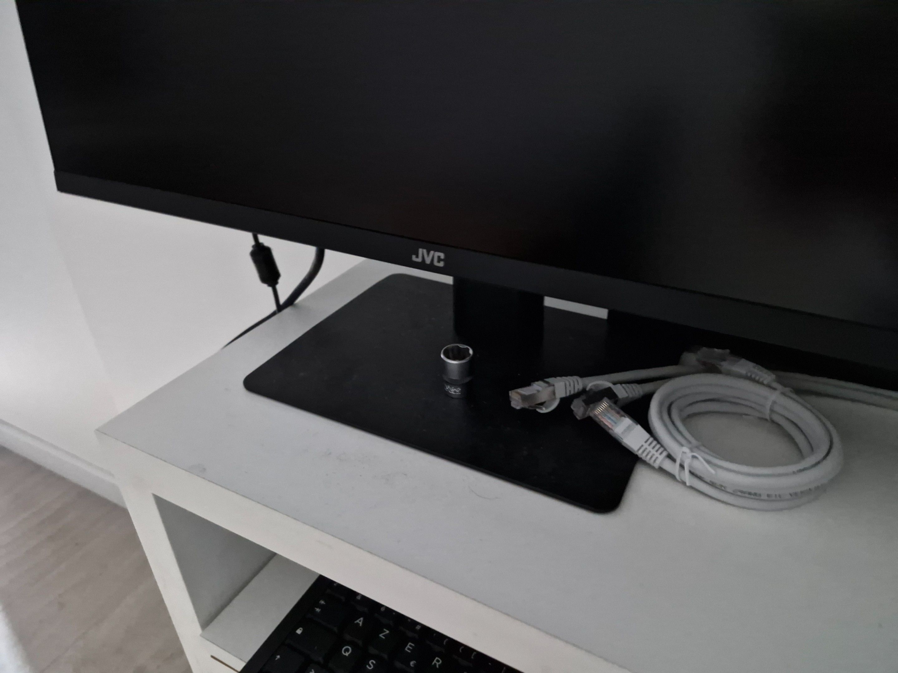 Two fixed computers including: two JVC screens, two HP towers and an HP wired keyboard