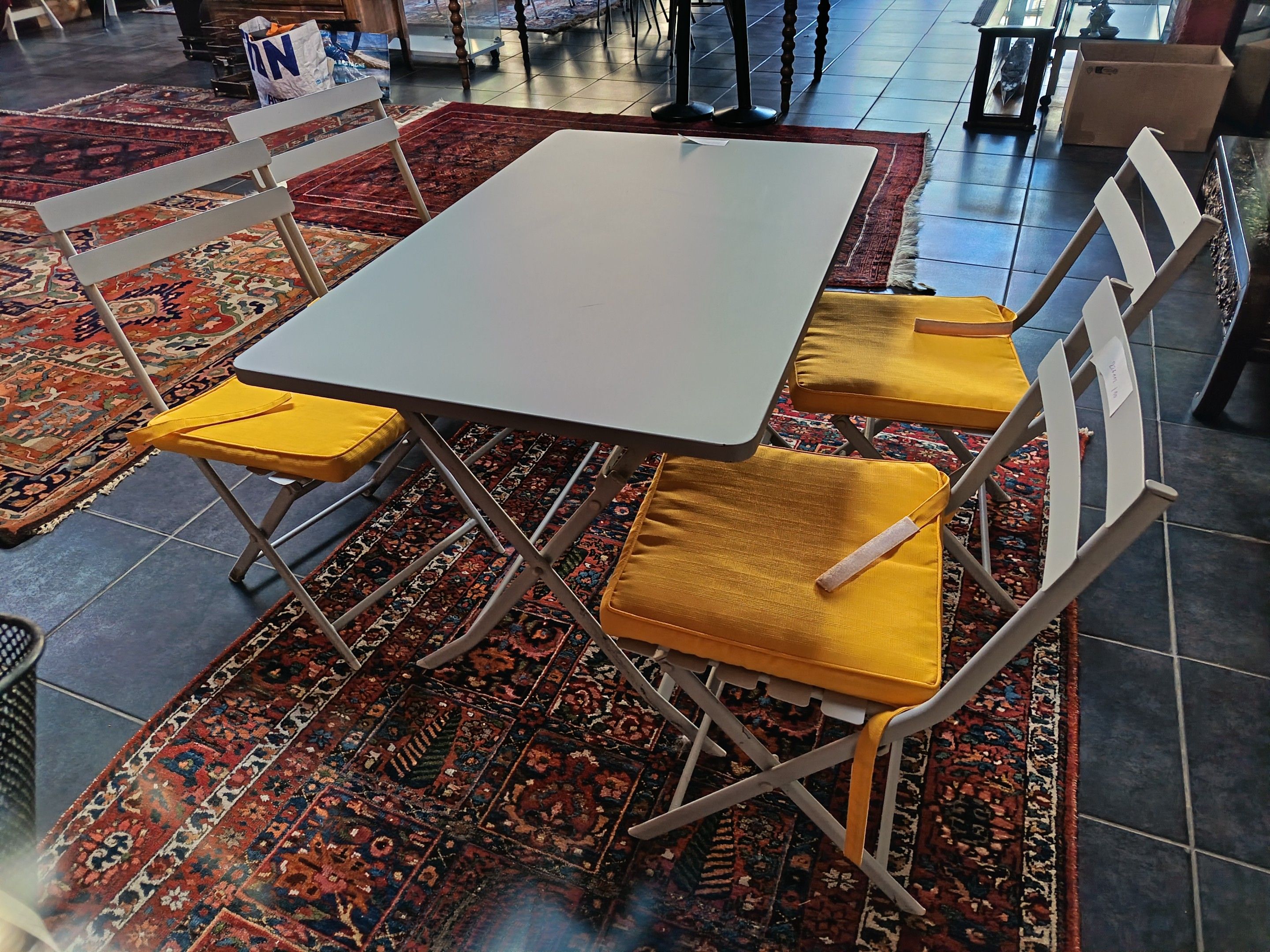 Rectangular garden table for four people (110 x 70 cm, h. 72 cm) in grey lacquered metal and its four chairs by HESPERIDE, with four yellow fabric seat cushions and a circular white lacquered metal garden table (d.77 cm).