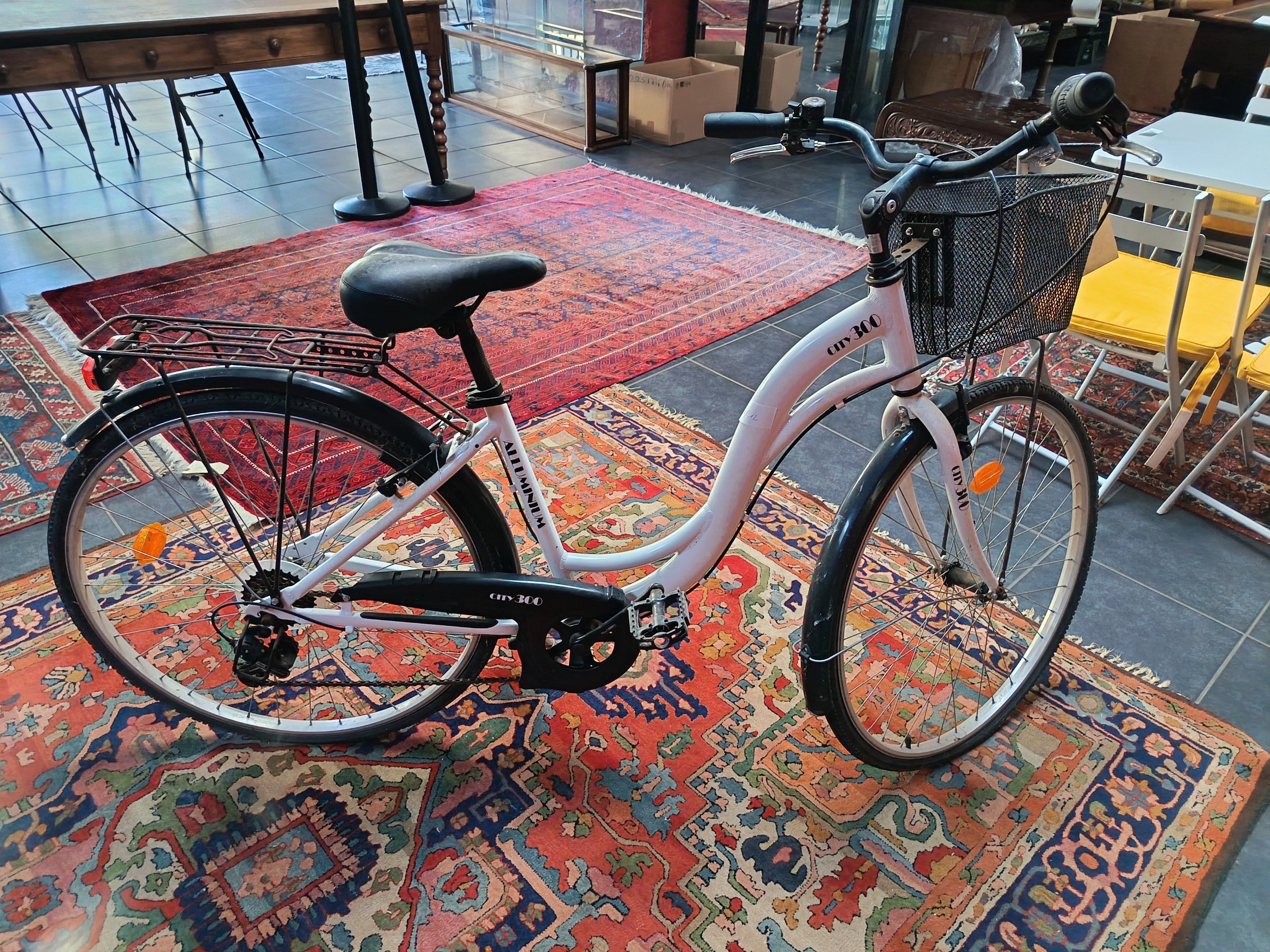 Ladies' white lacquered aluminium CITY 300 city bike, with gears, basket and bell. Rust, traces of damp, tyres need re-inflating.
