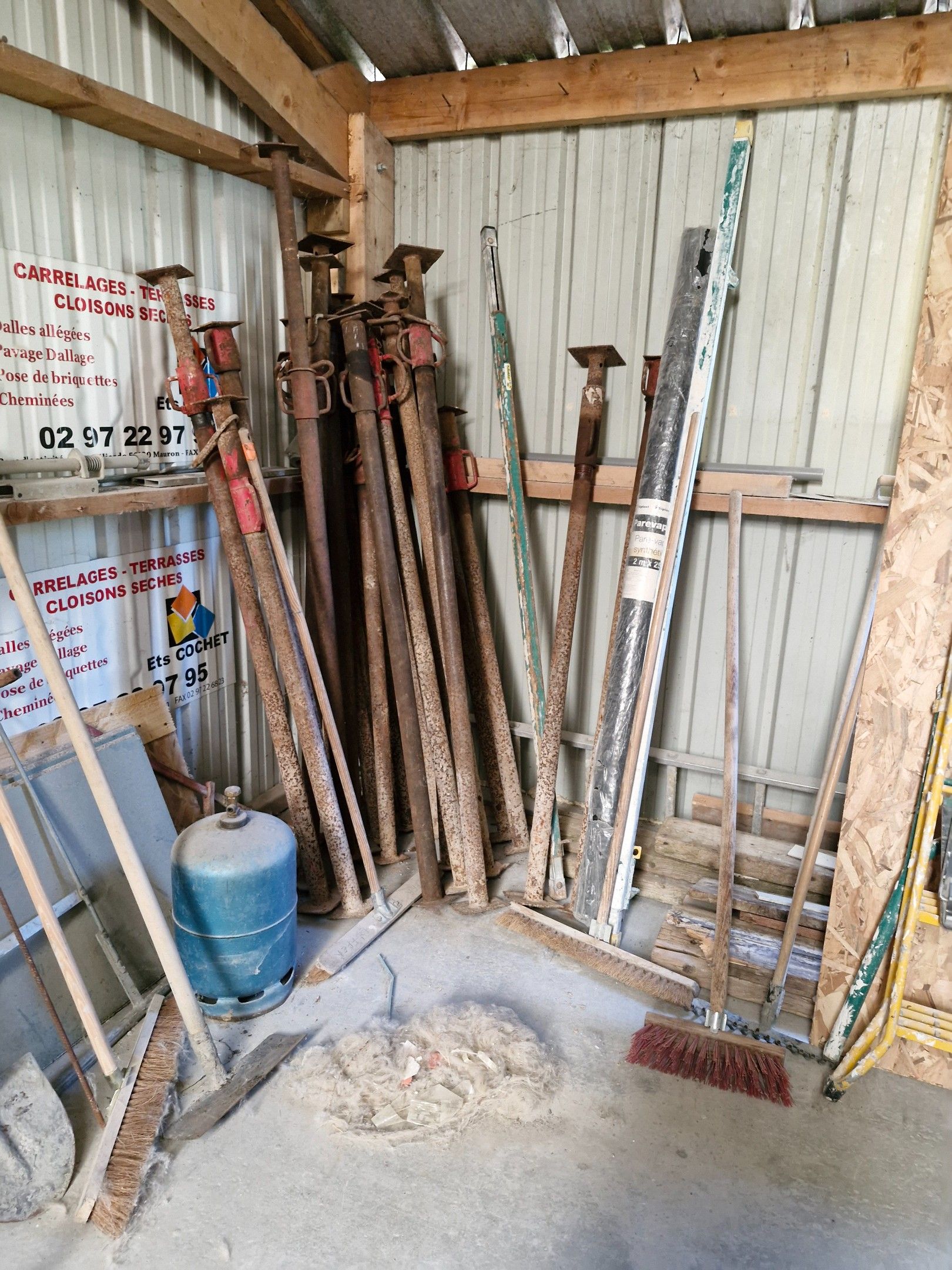 Batch of approximately twenty props, two clamps, two rakes and a shovel