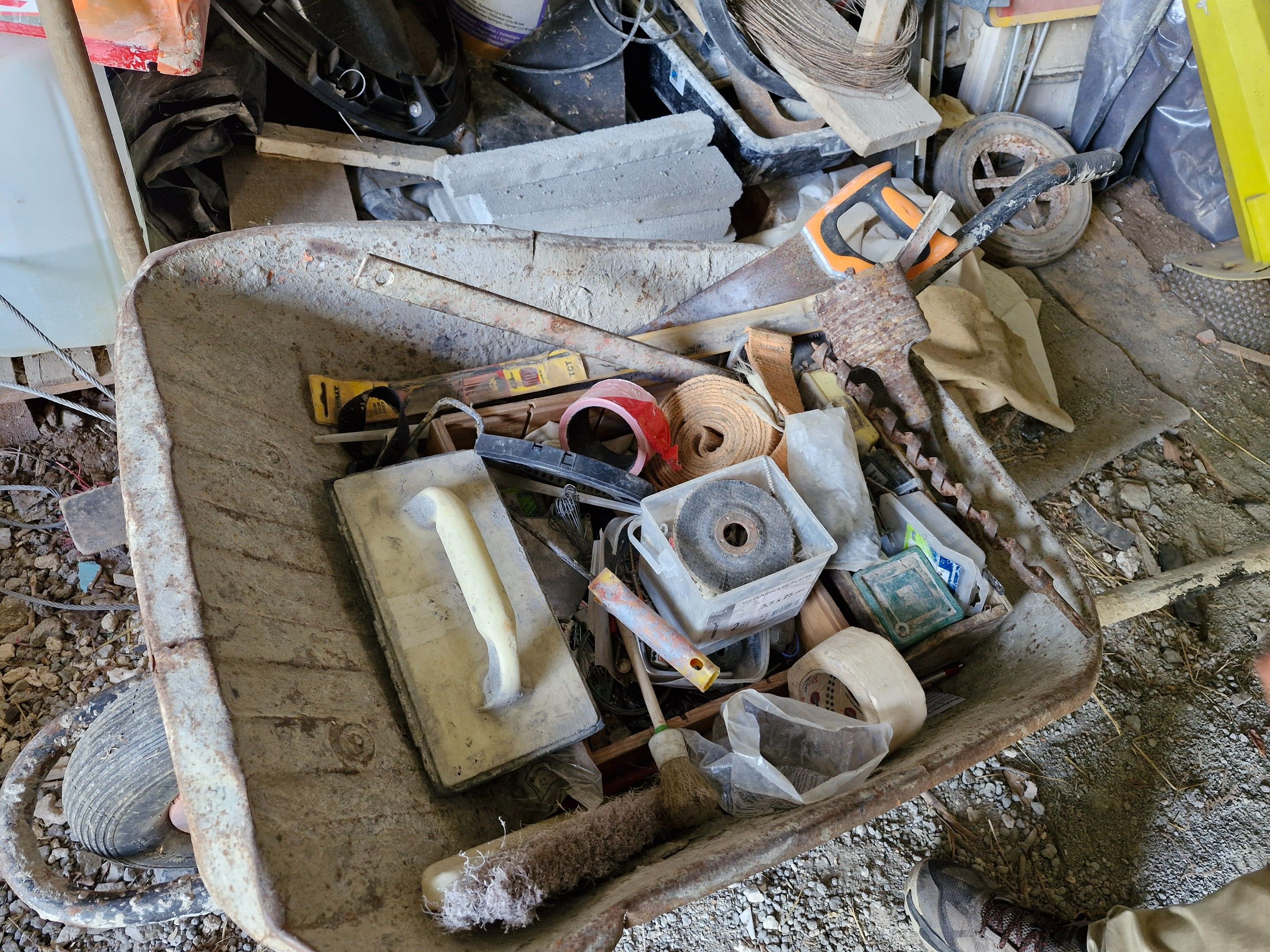 Small set of screws and bolts, saw, float, drill, strap, hole saw and miscellaneous (in wheelbarrow)