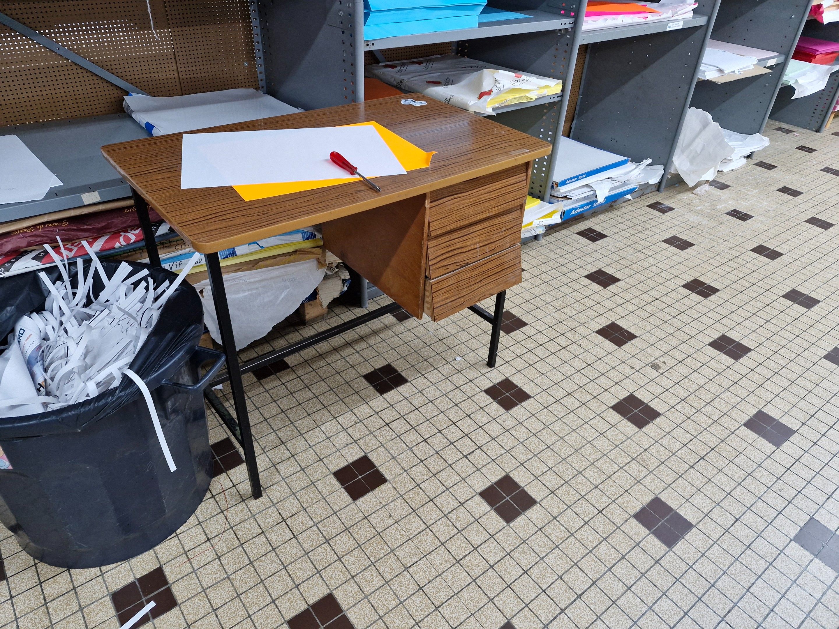 Small Formica desk with three drawers and black metal legs