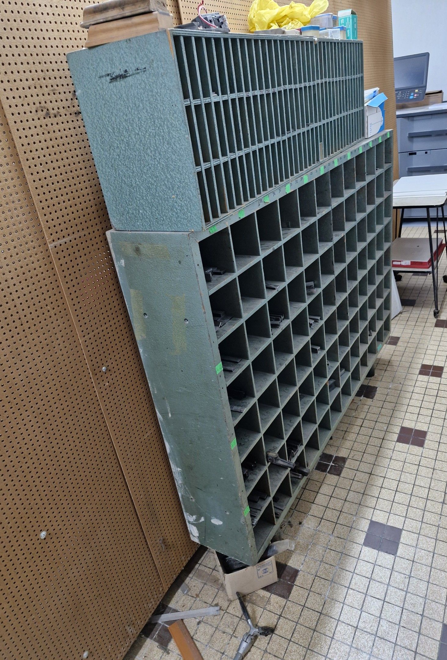 Green painted wood Lingo box with many compartments
