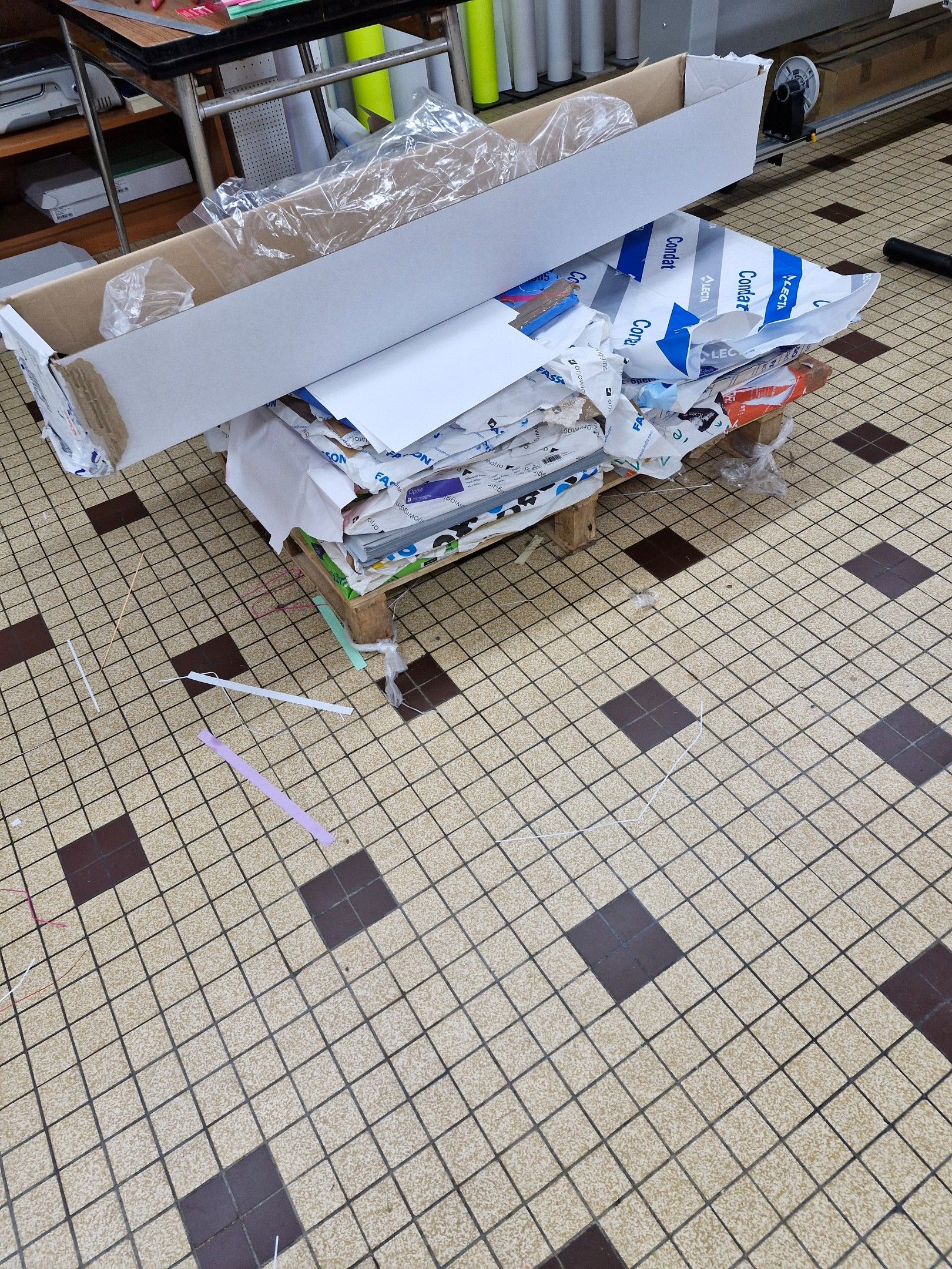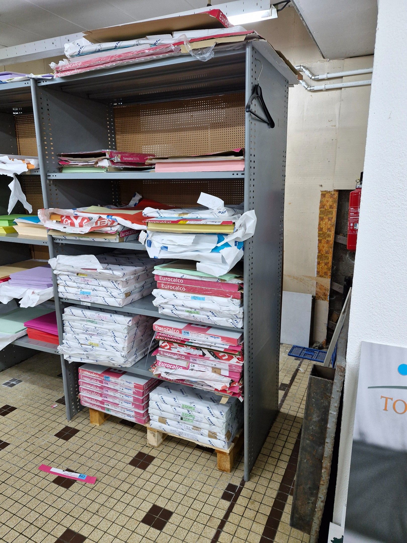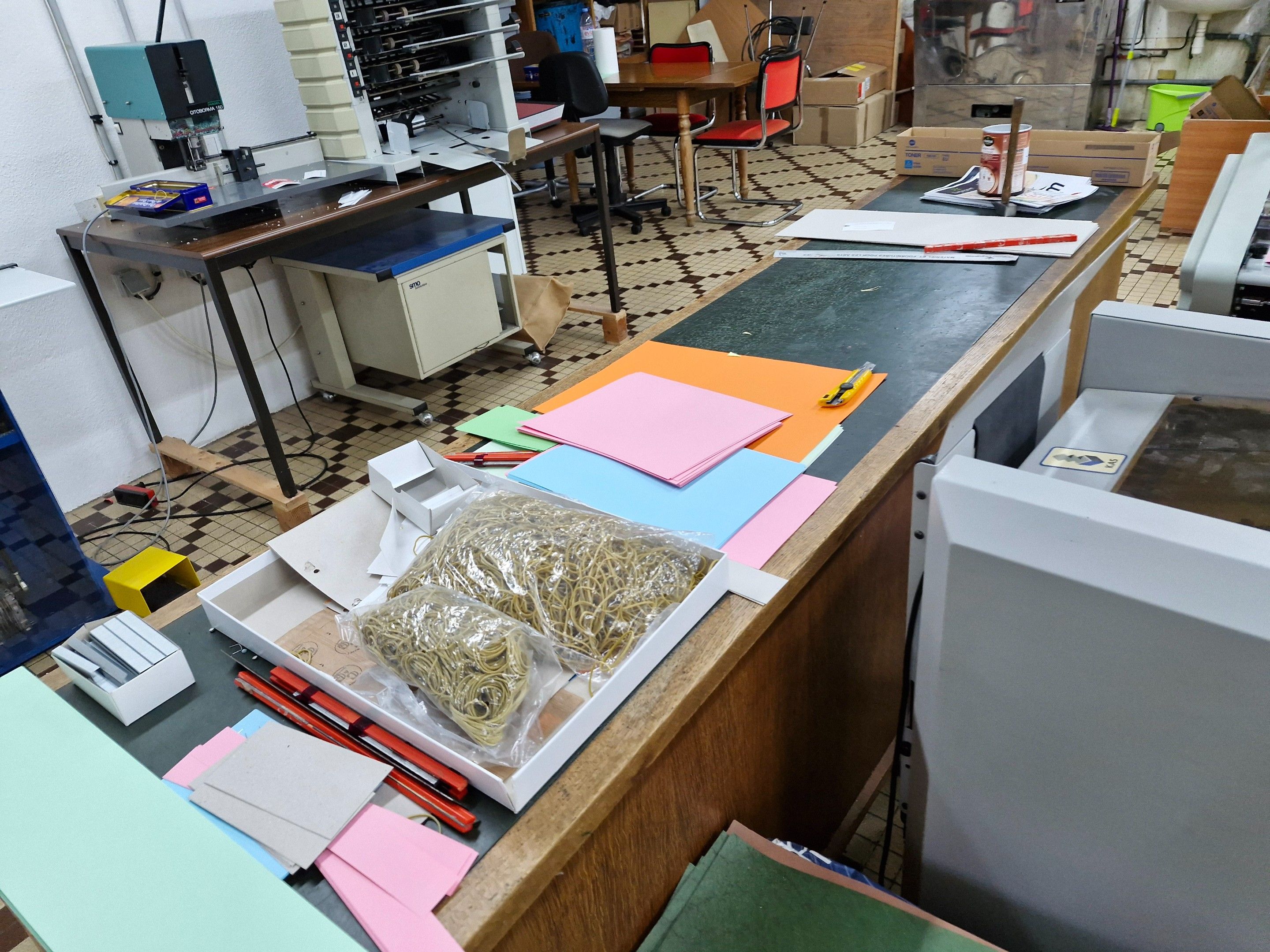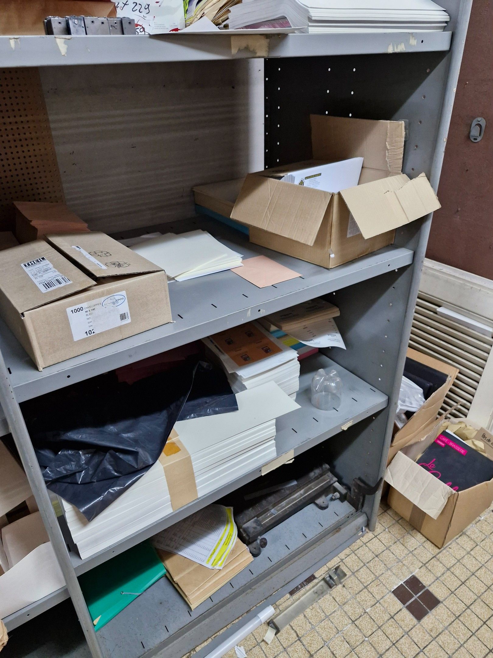 Various packaging cartons, coloured chemical papers, various coloured papers, rolls of paper and envelopes.