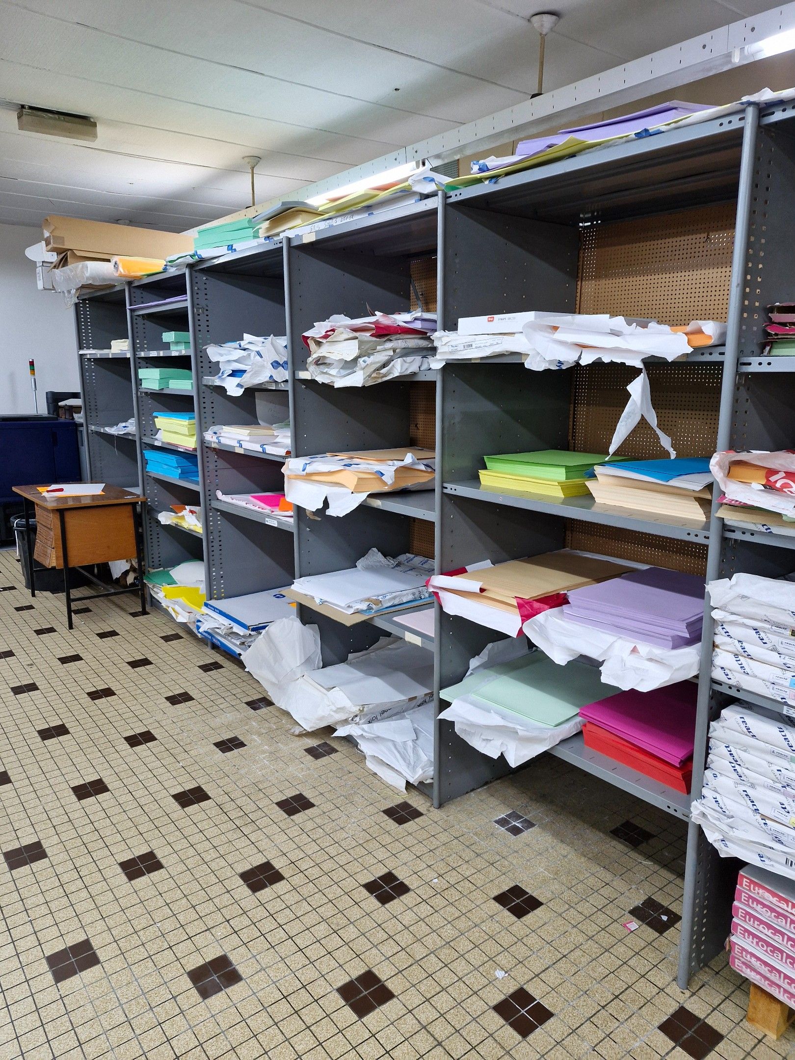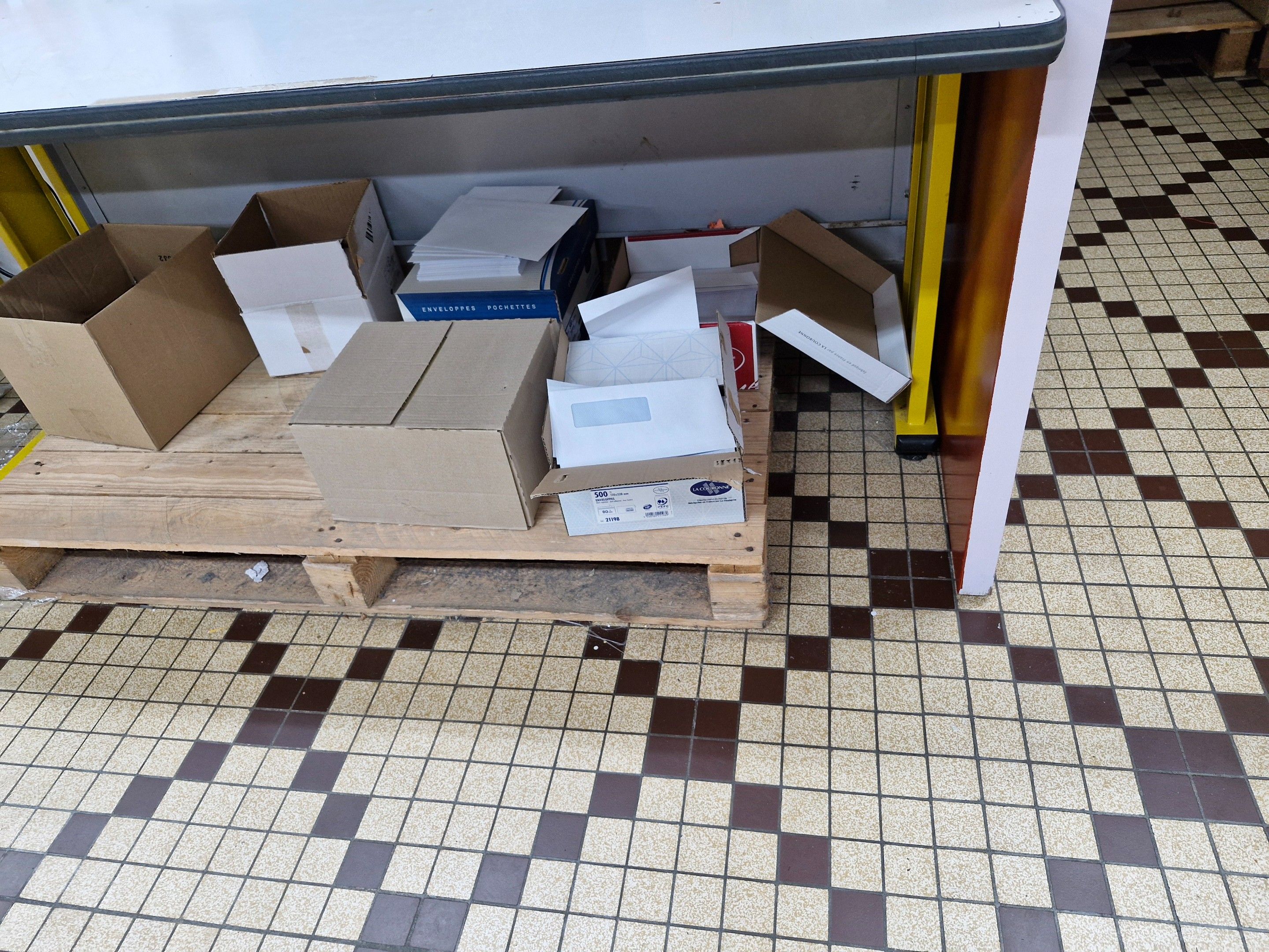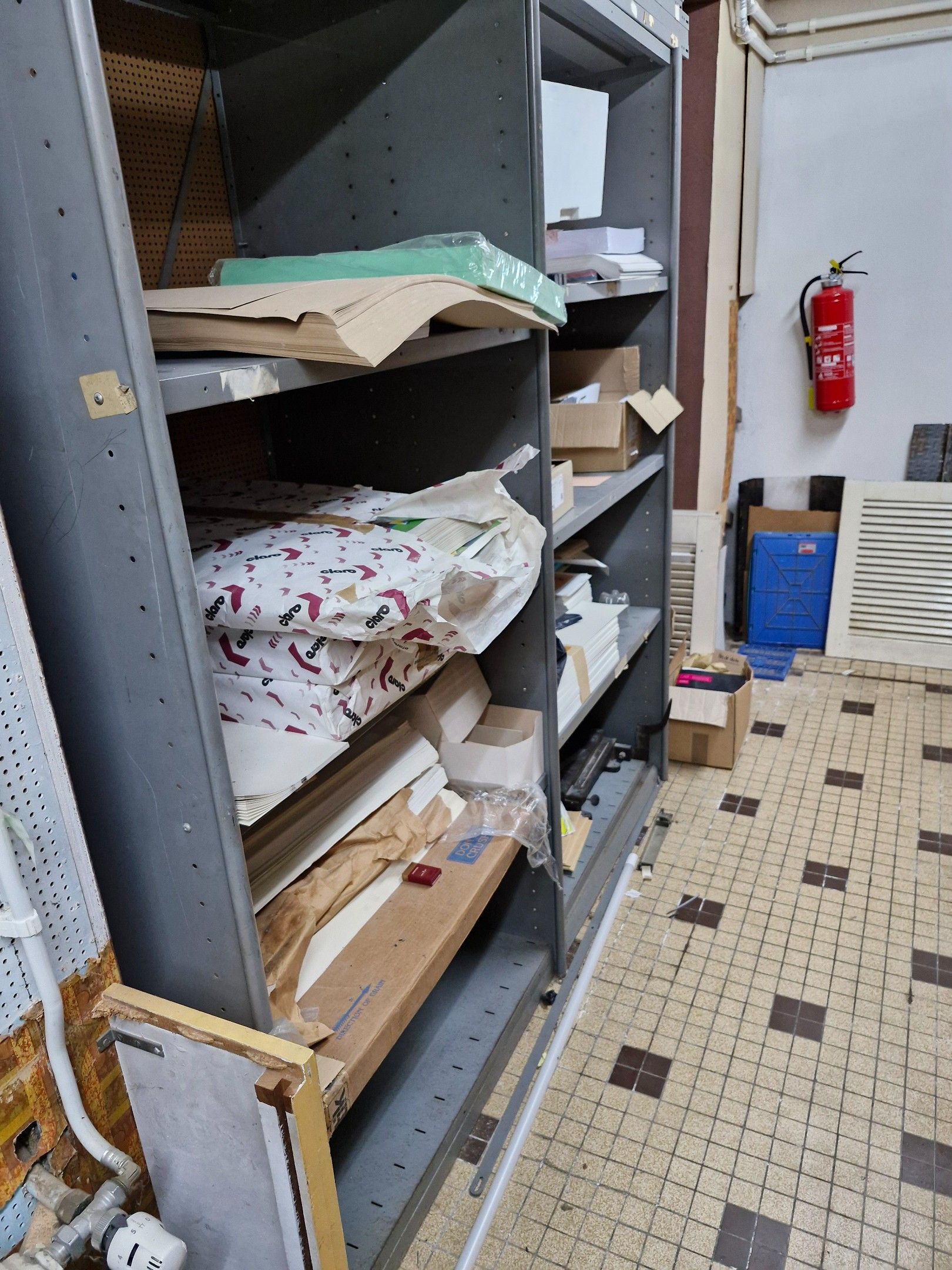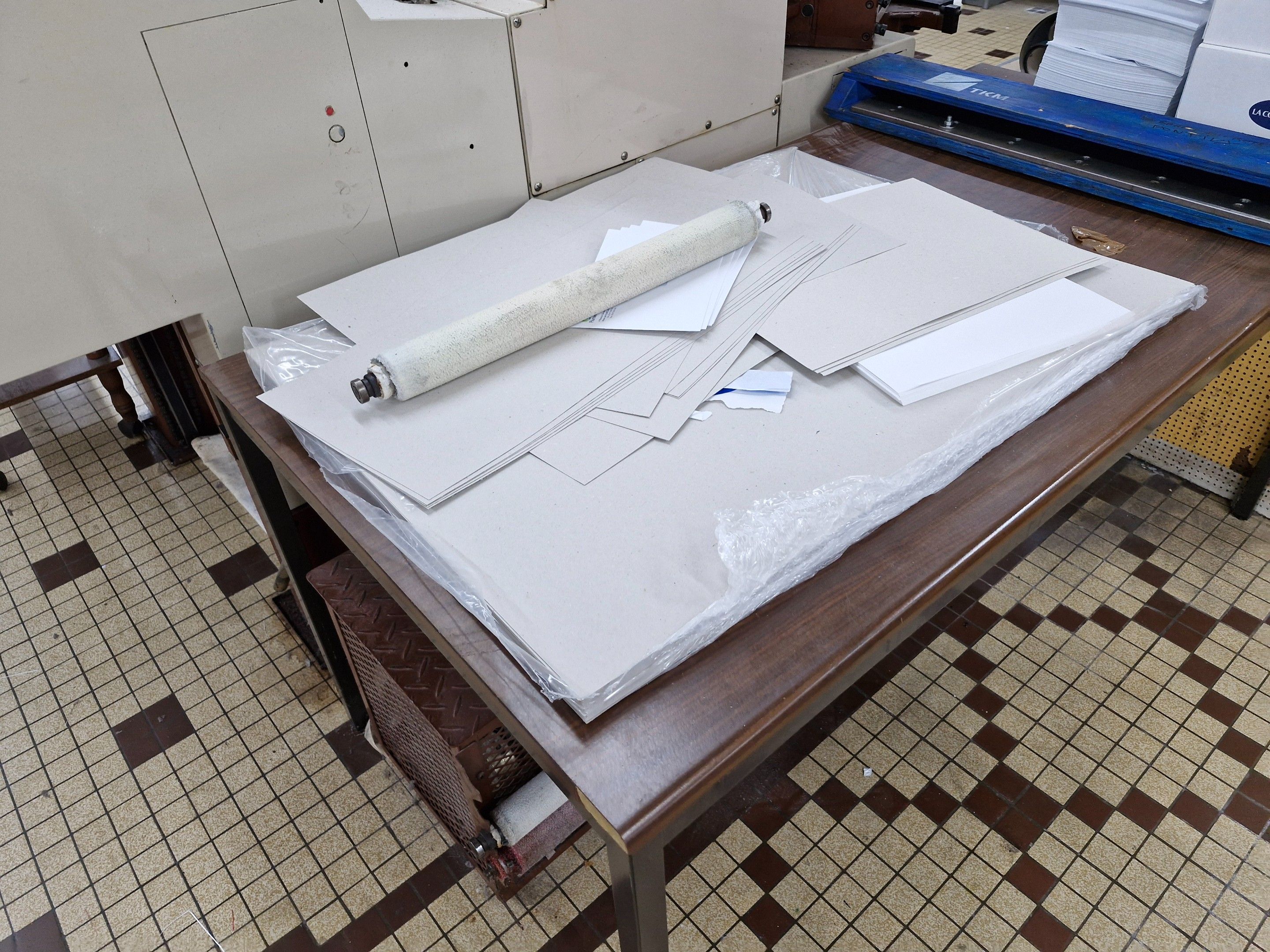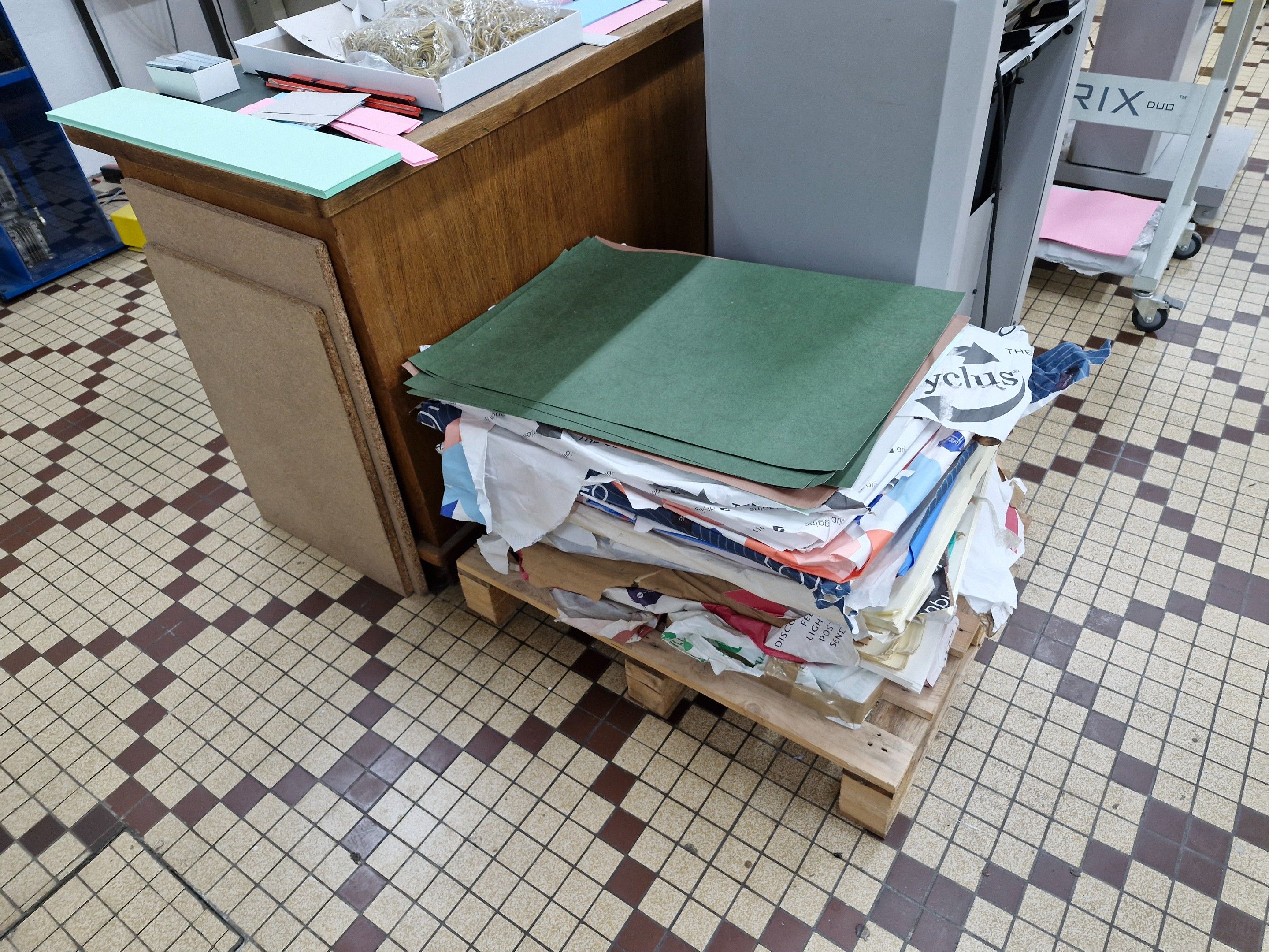 Various packaging cartons, coloured chemical papers, various coloured papers, rolls of paper and envelopes.