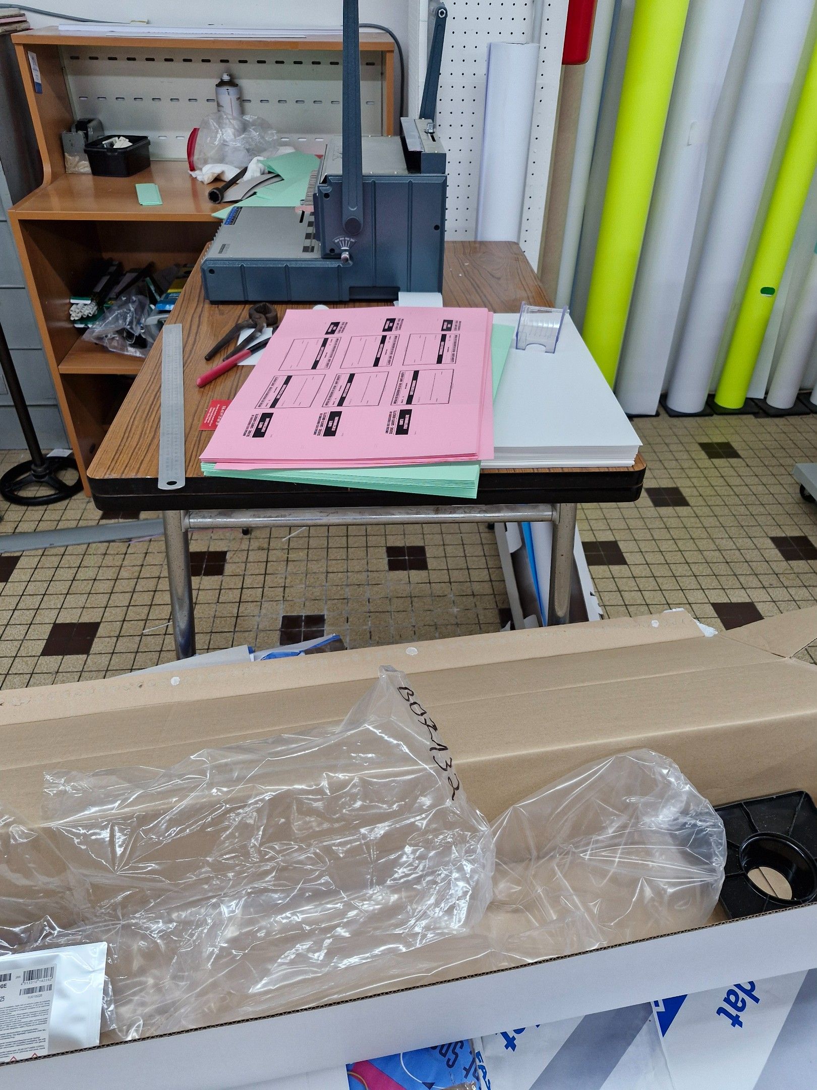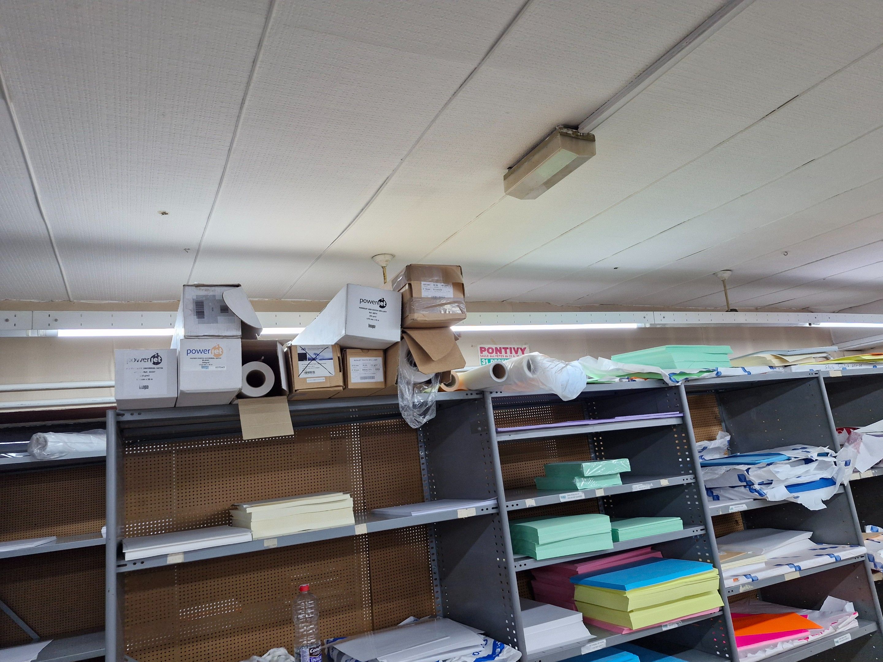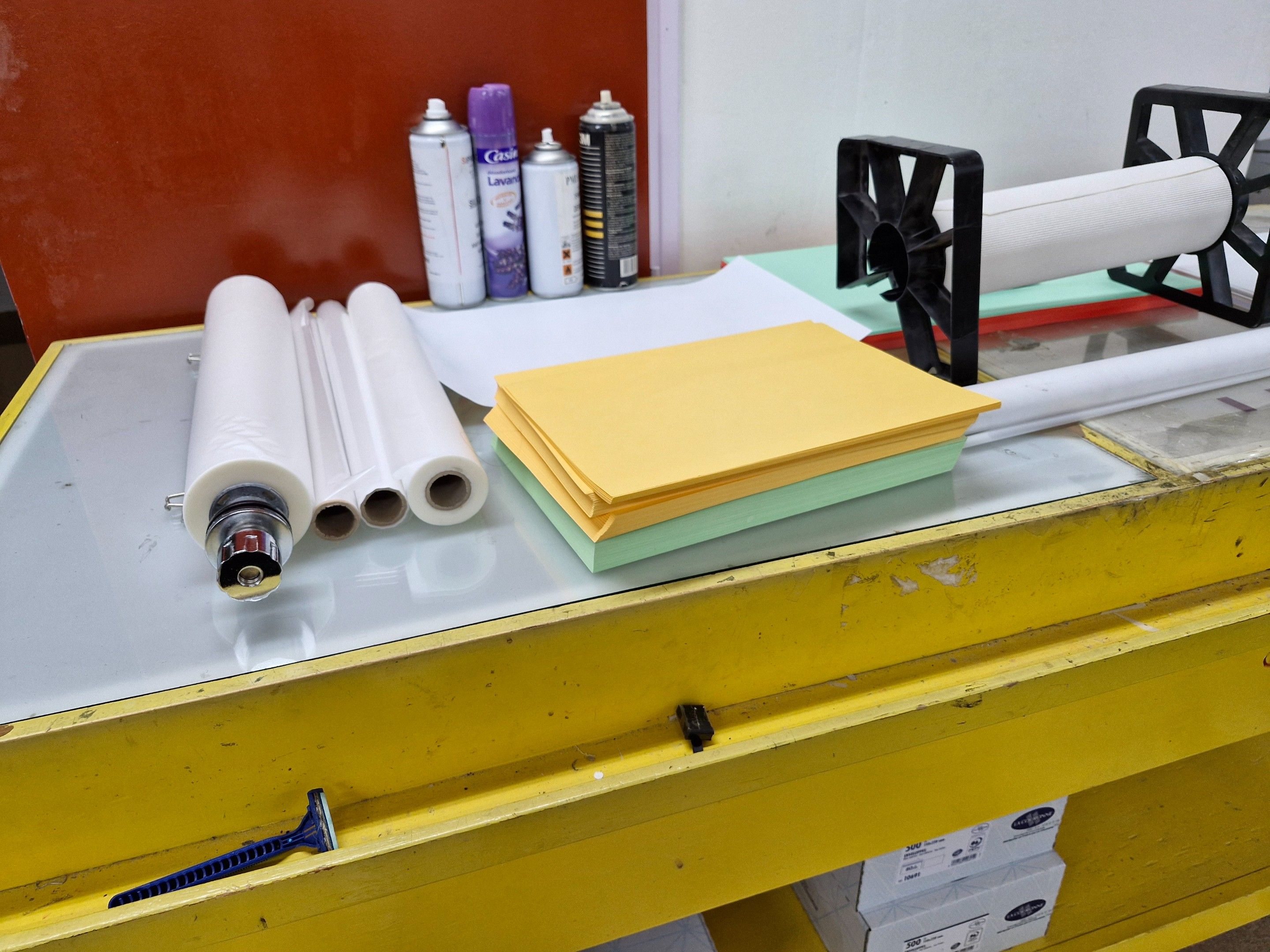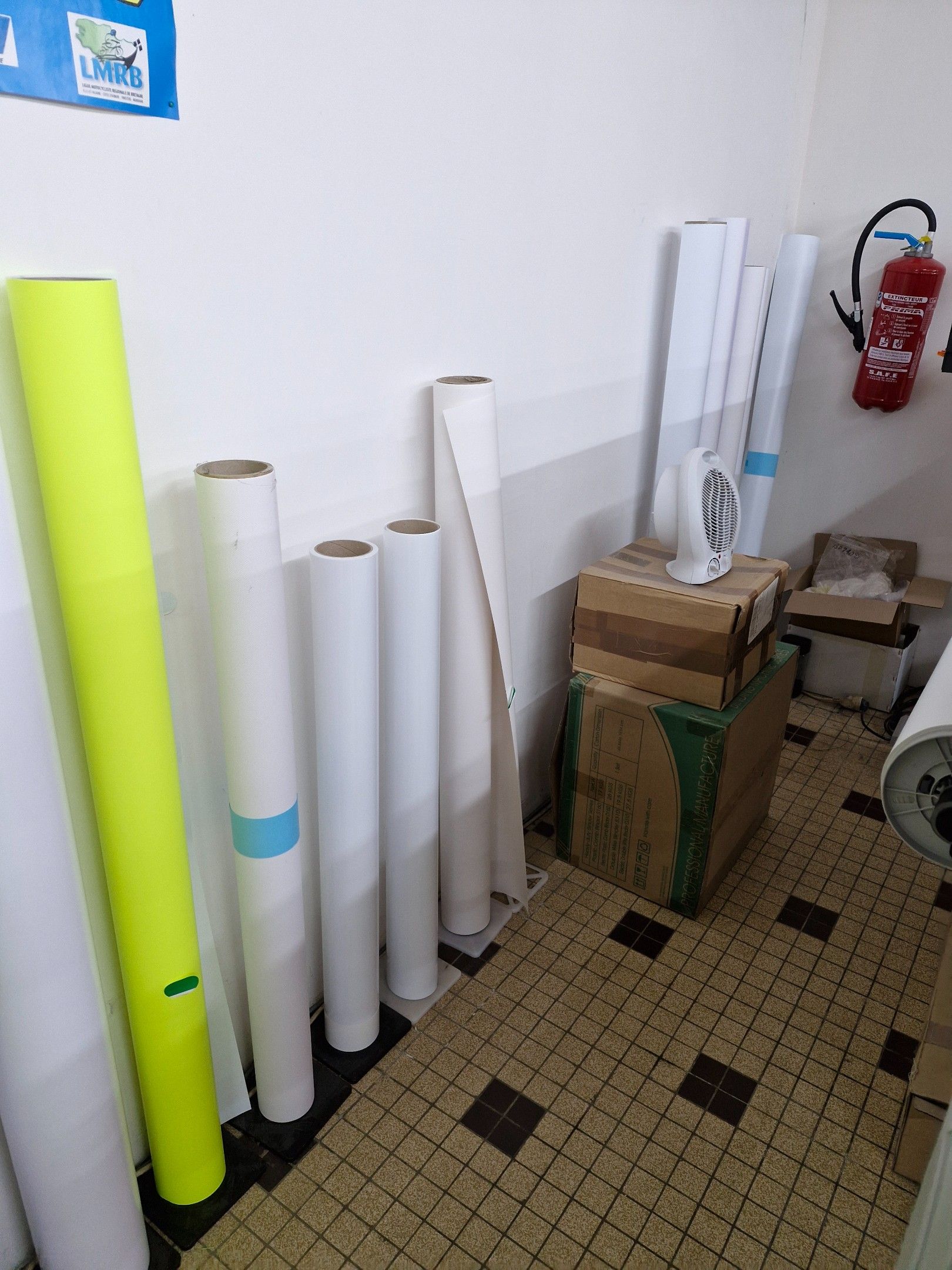Various packaging cartons, coloured chemical papers, various coloured papers, rolls of paper and envelopes.