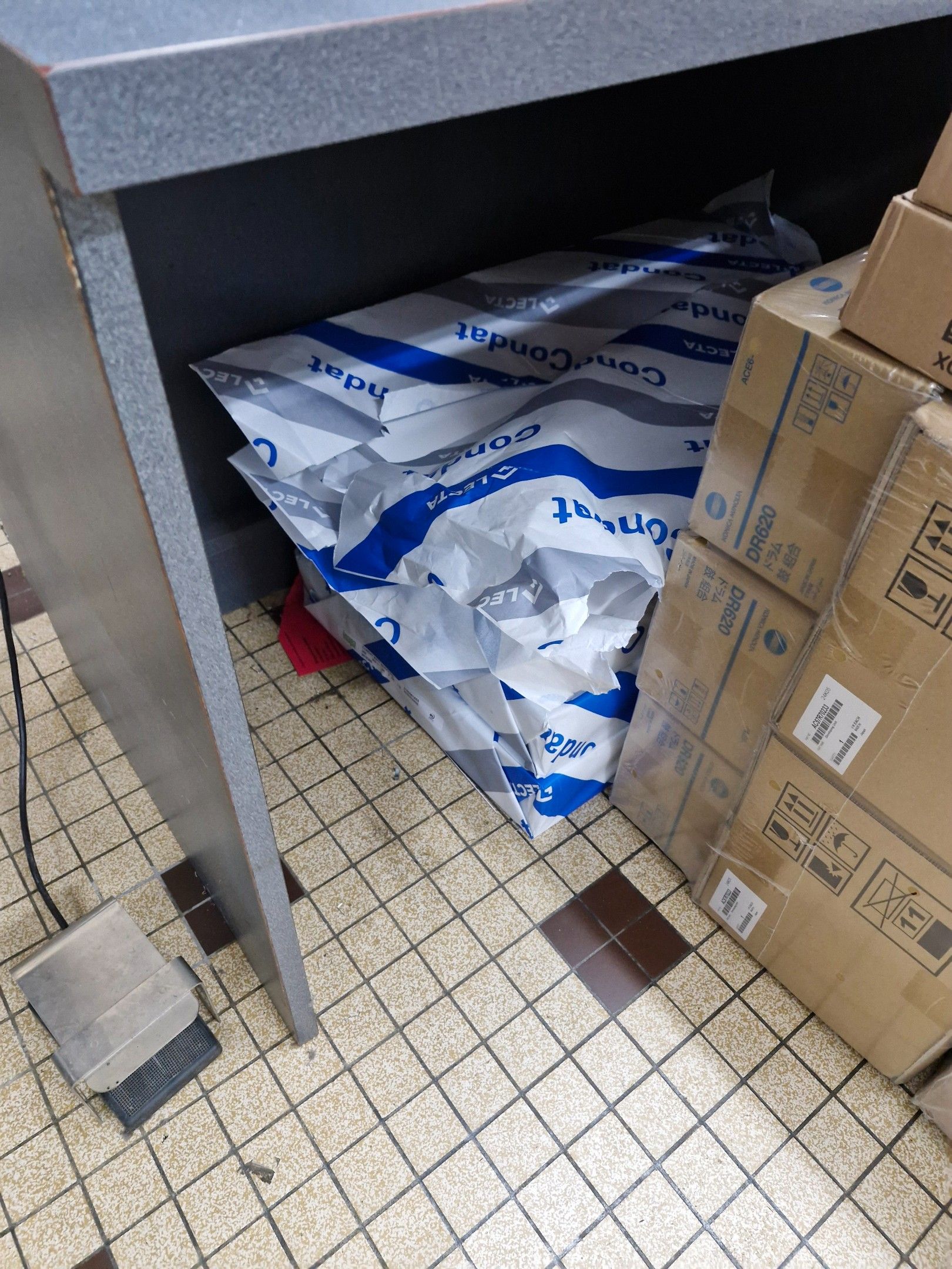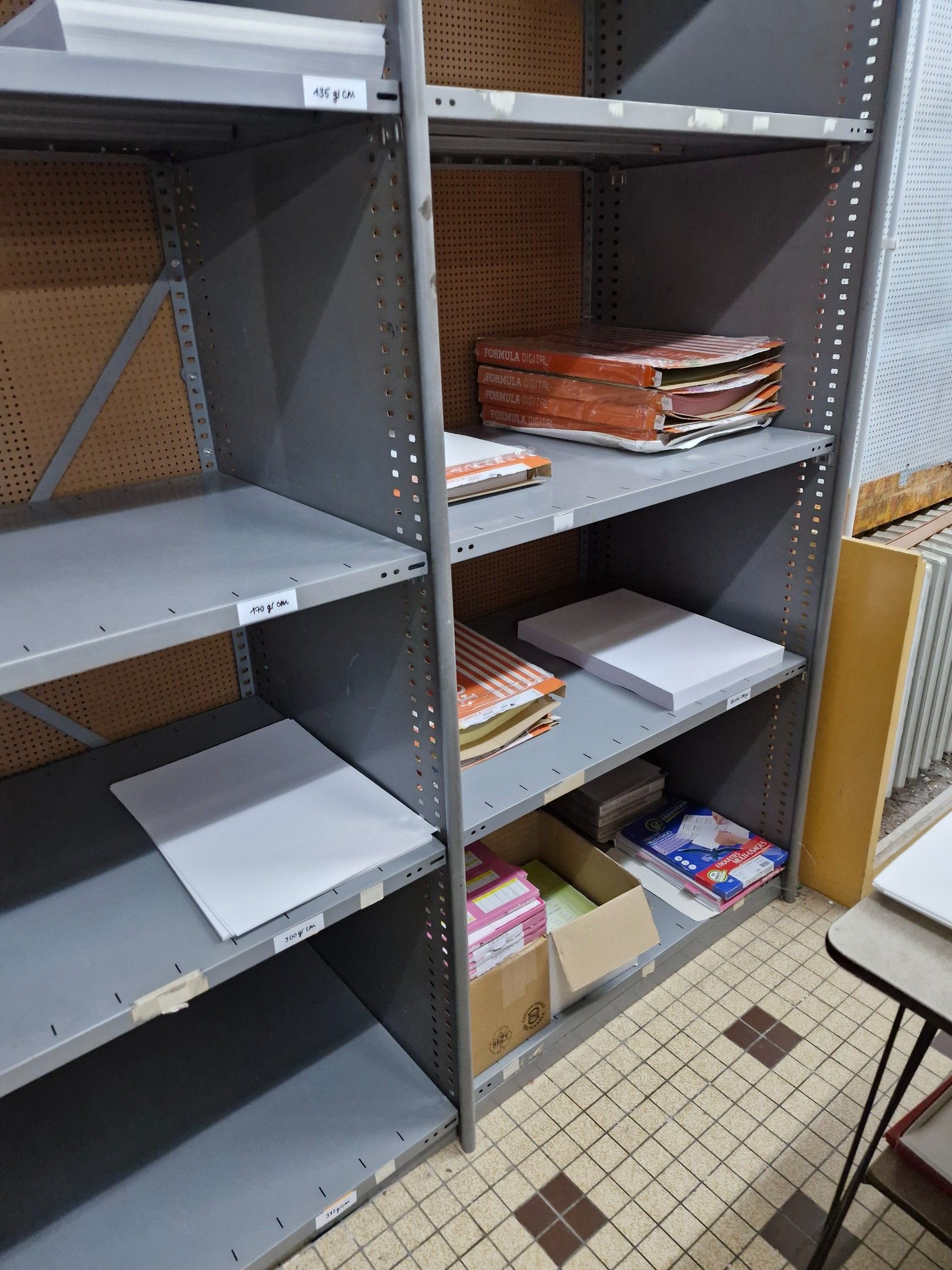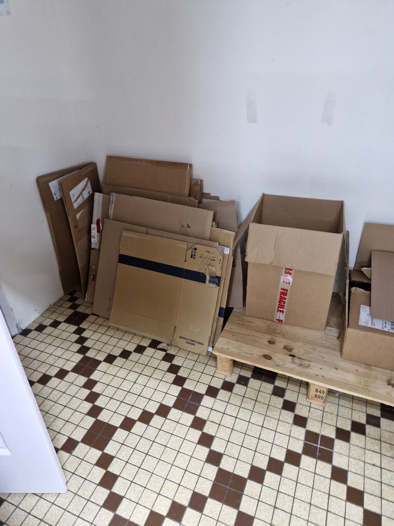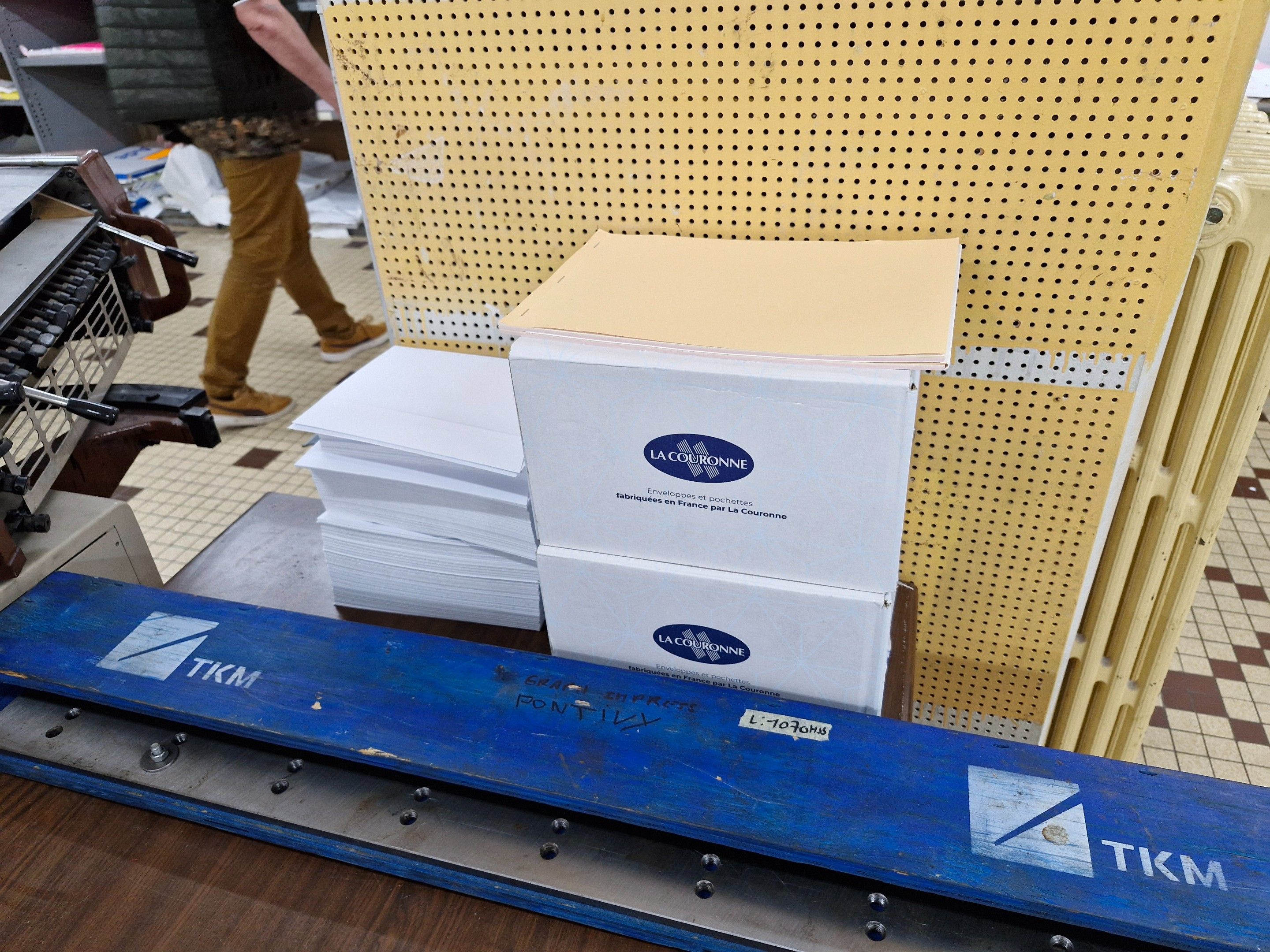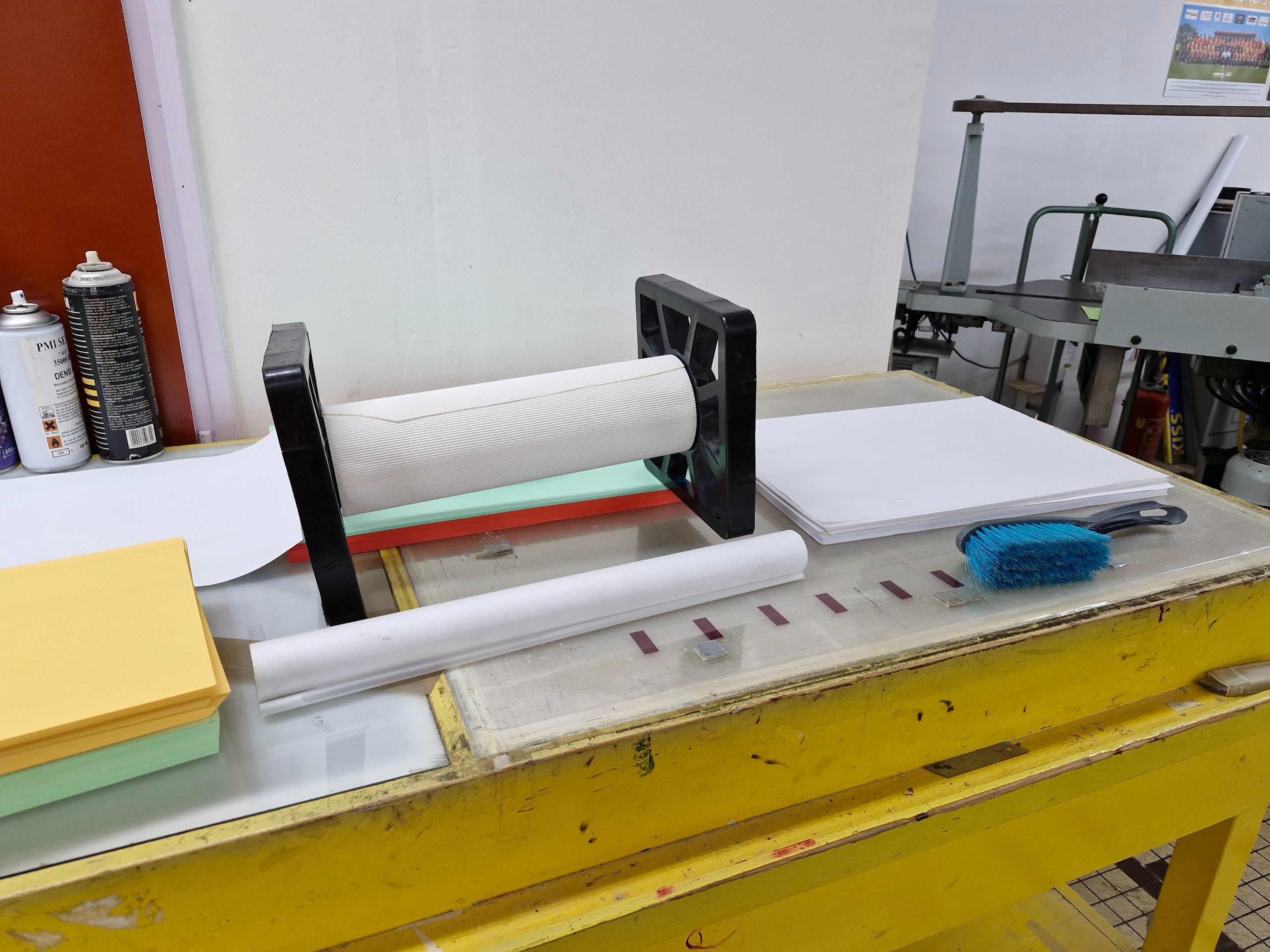 Various packaging cartons, coloured chemical papers, various coloured papers, rolls of paper and envelopes.