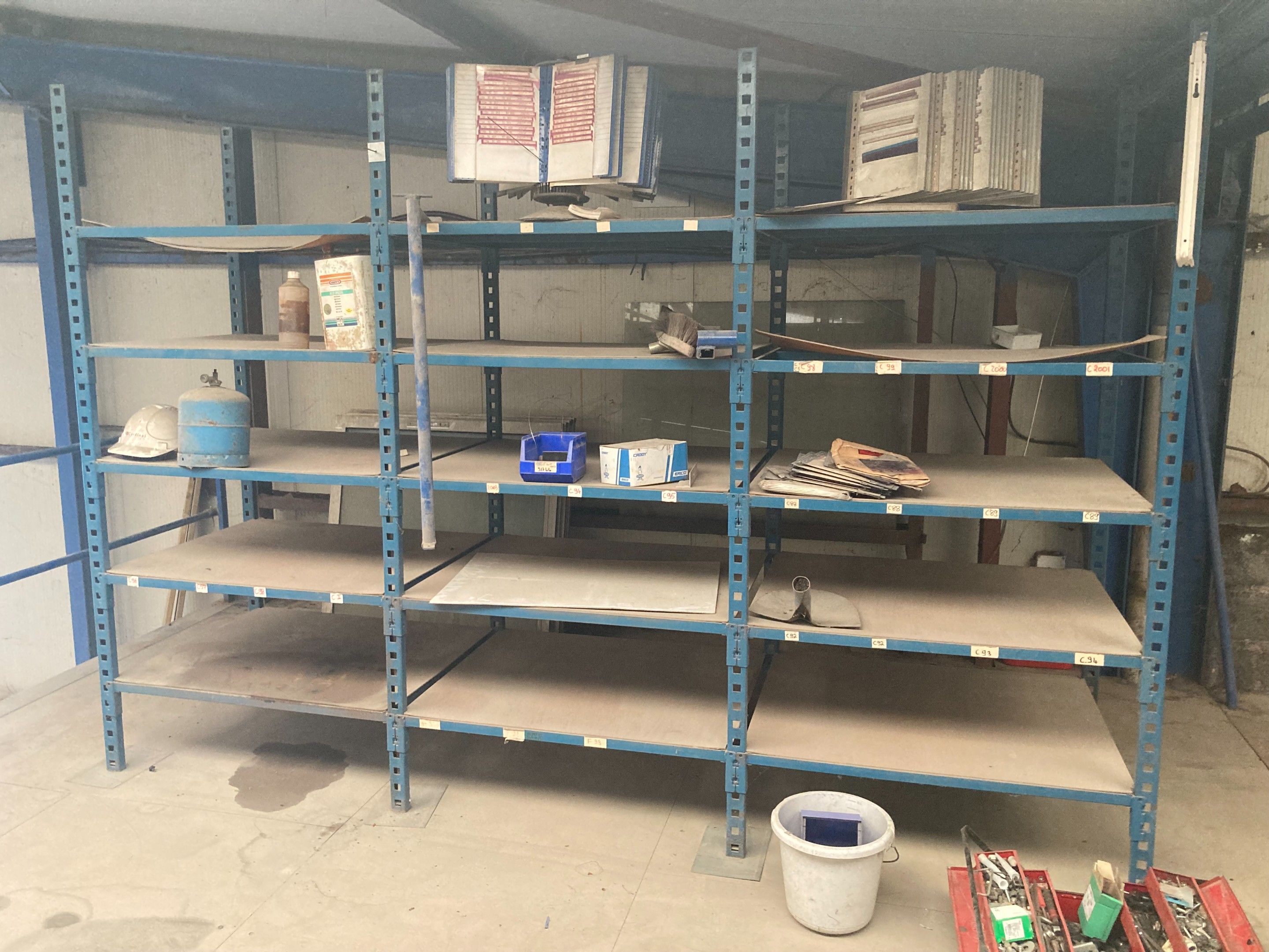 Three blue metal shelves with 12 trays, dismantled (H: 2.10m) and three assembled (smaller)
