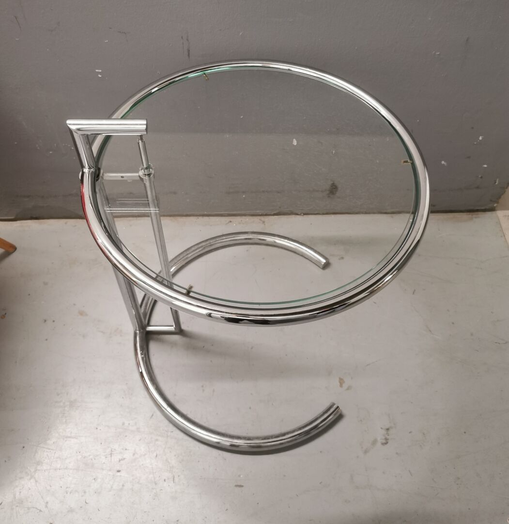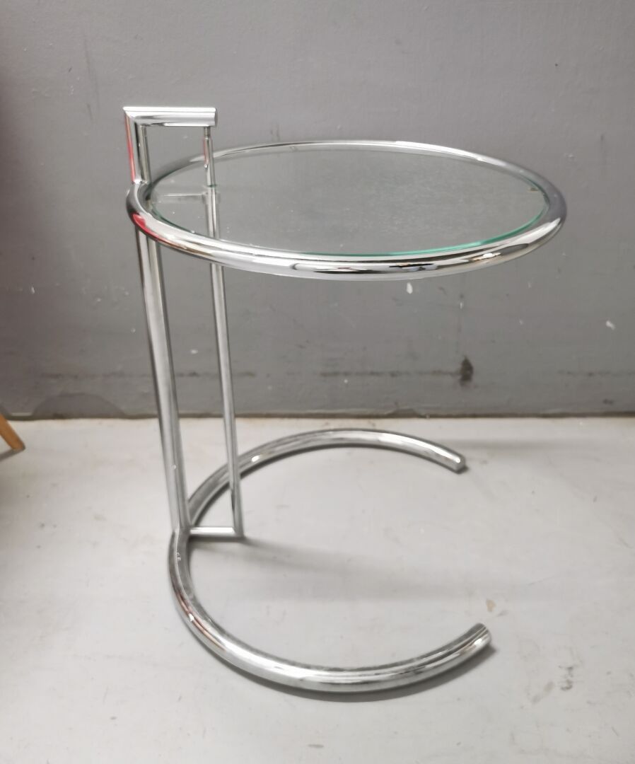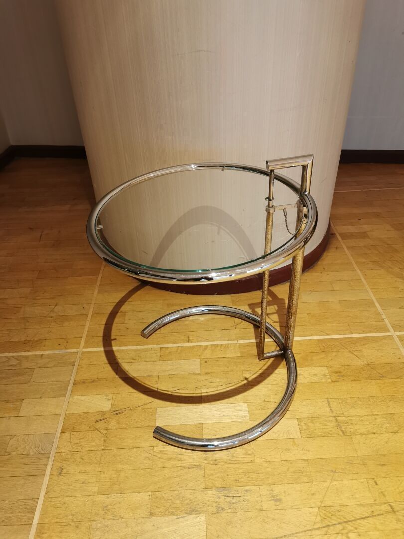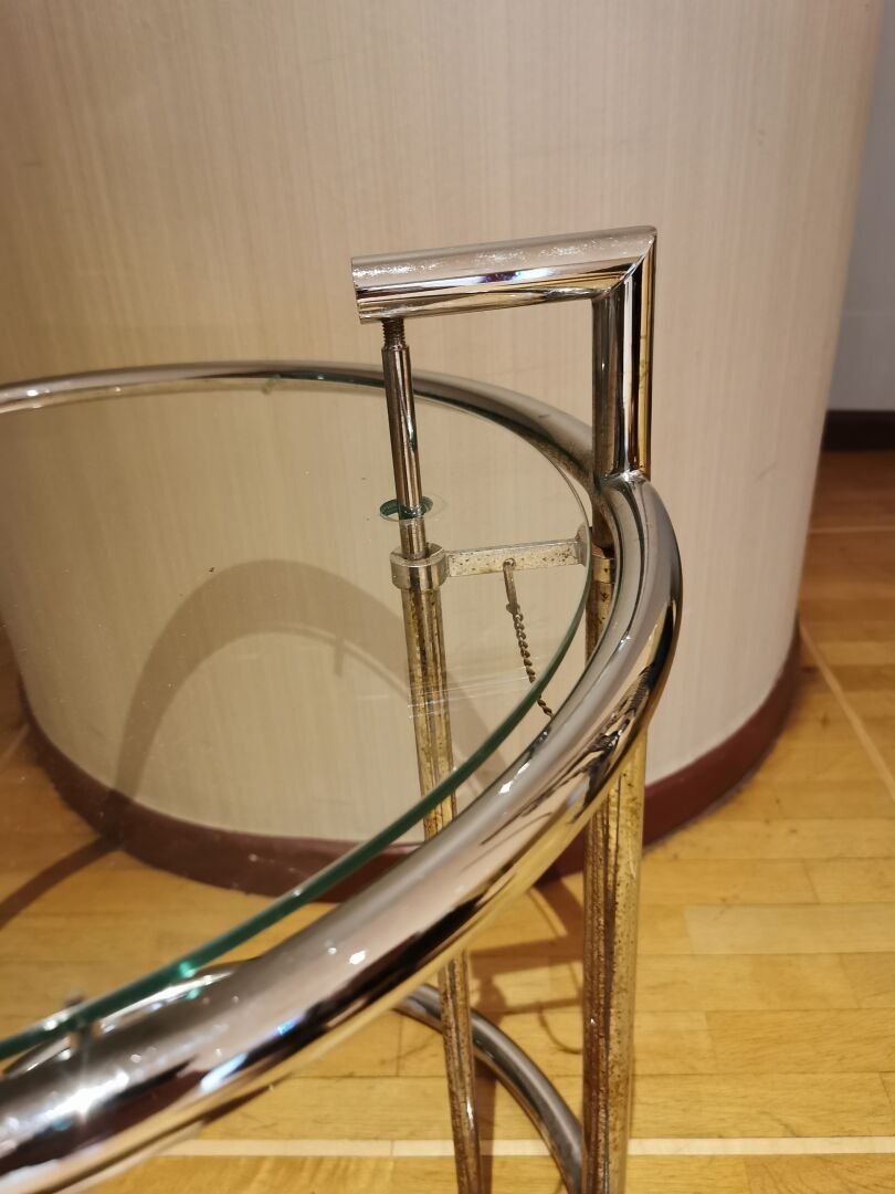 Designed by Eileen GRAY - Side table / end of sofa with adjustable height in chromed metal and glass top. Dimensions: 55 (h) x 51 (d) cm.