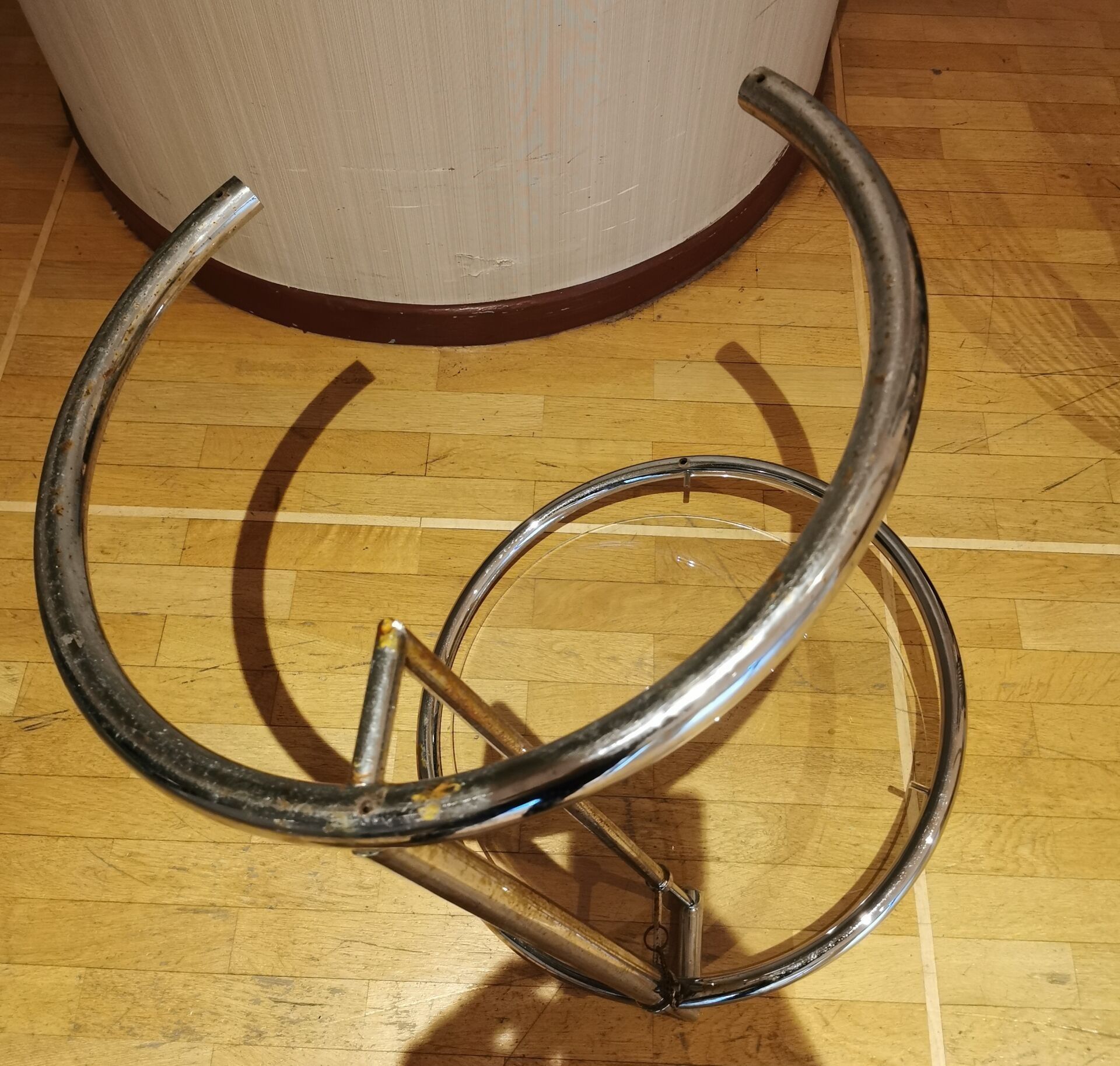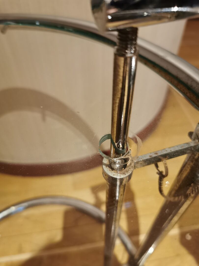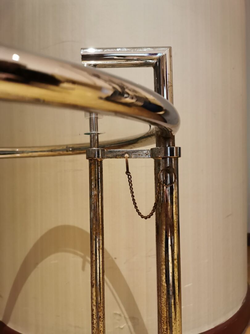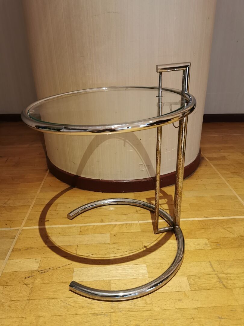 Designed by Eileen GRAY - Side table / end of sofa with adjustable height in chromed metal and glass top. Dimensions: 55 (h) x 51 (d) cm.