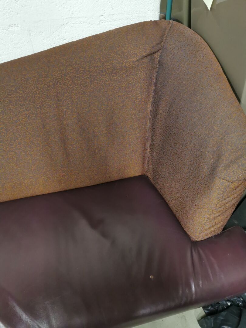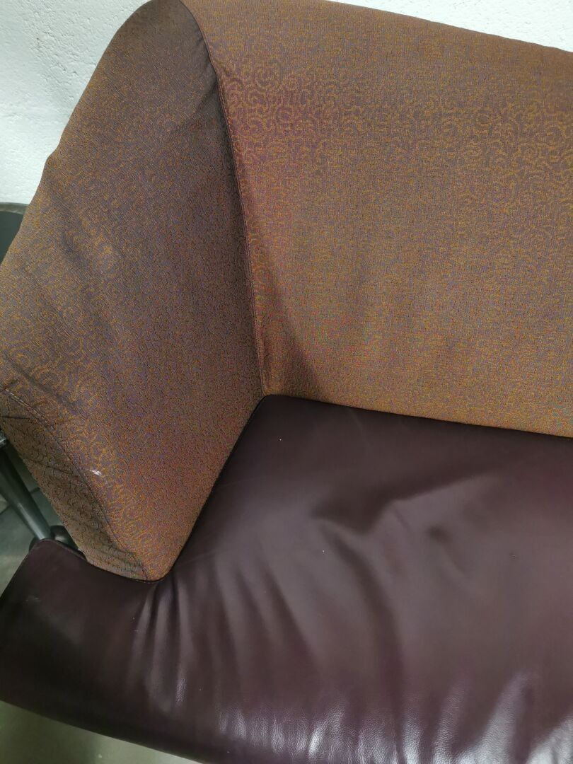 Sofa made up of two elements (two meridians) in fabric and skai resting on turned wooden legs.