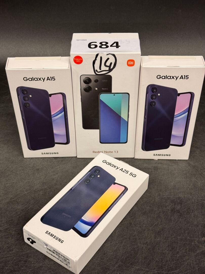 4 PORTABLE PHONES: REDMI NOTE 13 / SAMSUNG GALAXY A25 & A15 (with seals) POSSIBLE SHIPPING (this lot to you in mainland France for €27.45) Lot from unclaimed parcels: working order not guaranteed, may be blocked)
