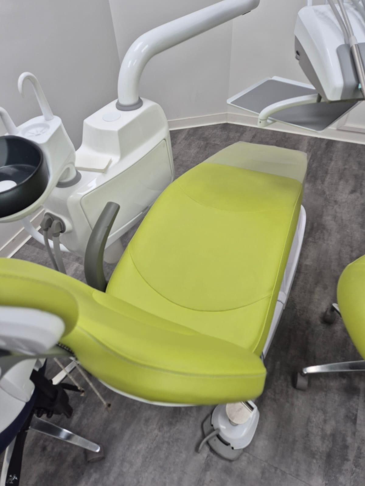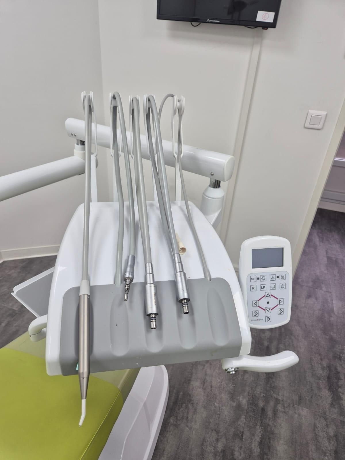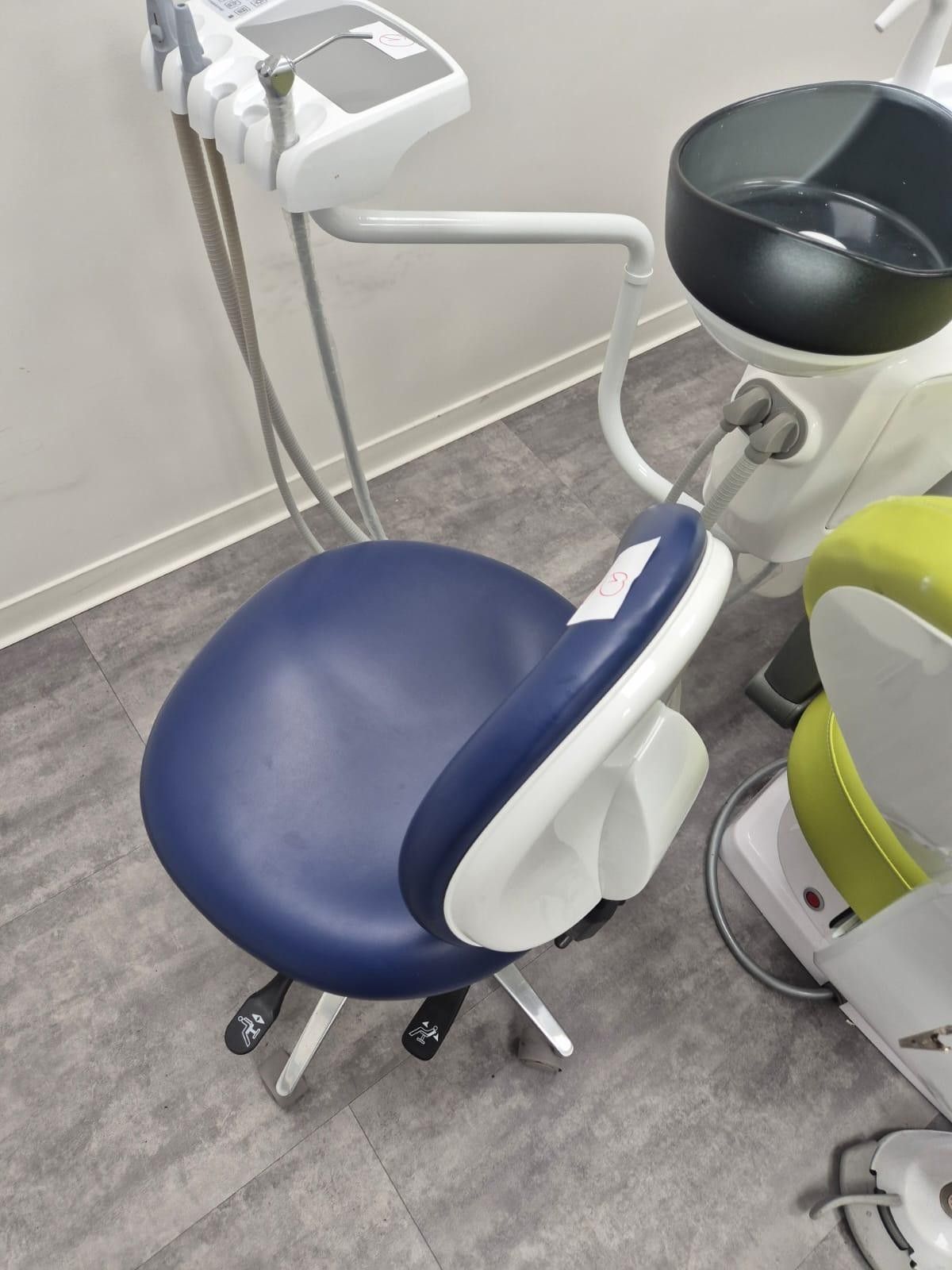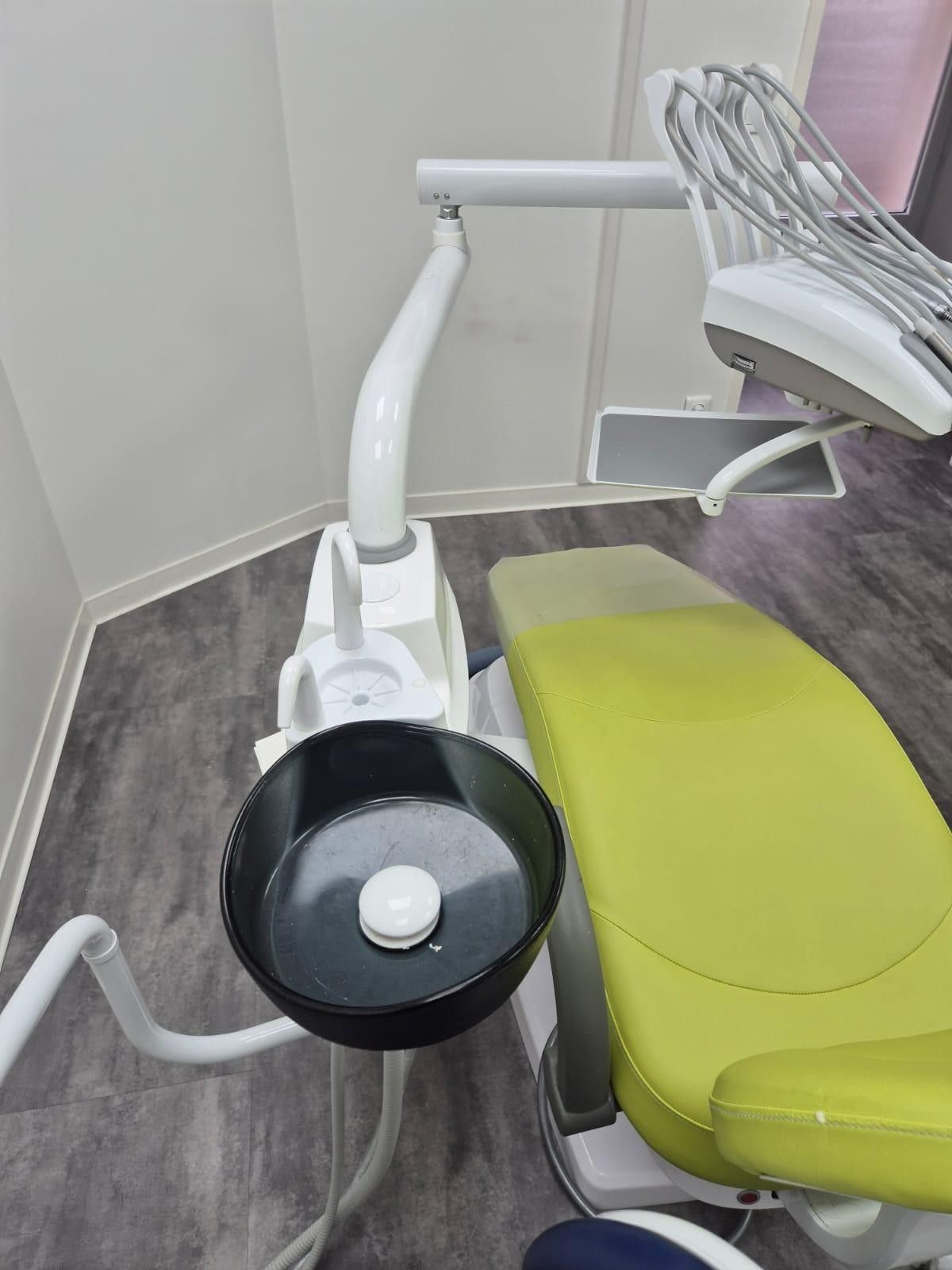 Dental chair with integrated unit comprising the following elements: instrument arm, spittoon, Faro scialytic.