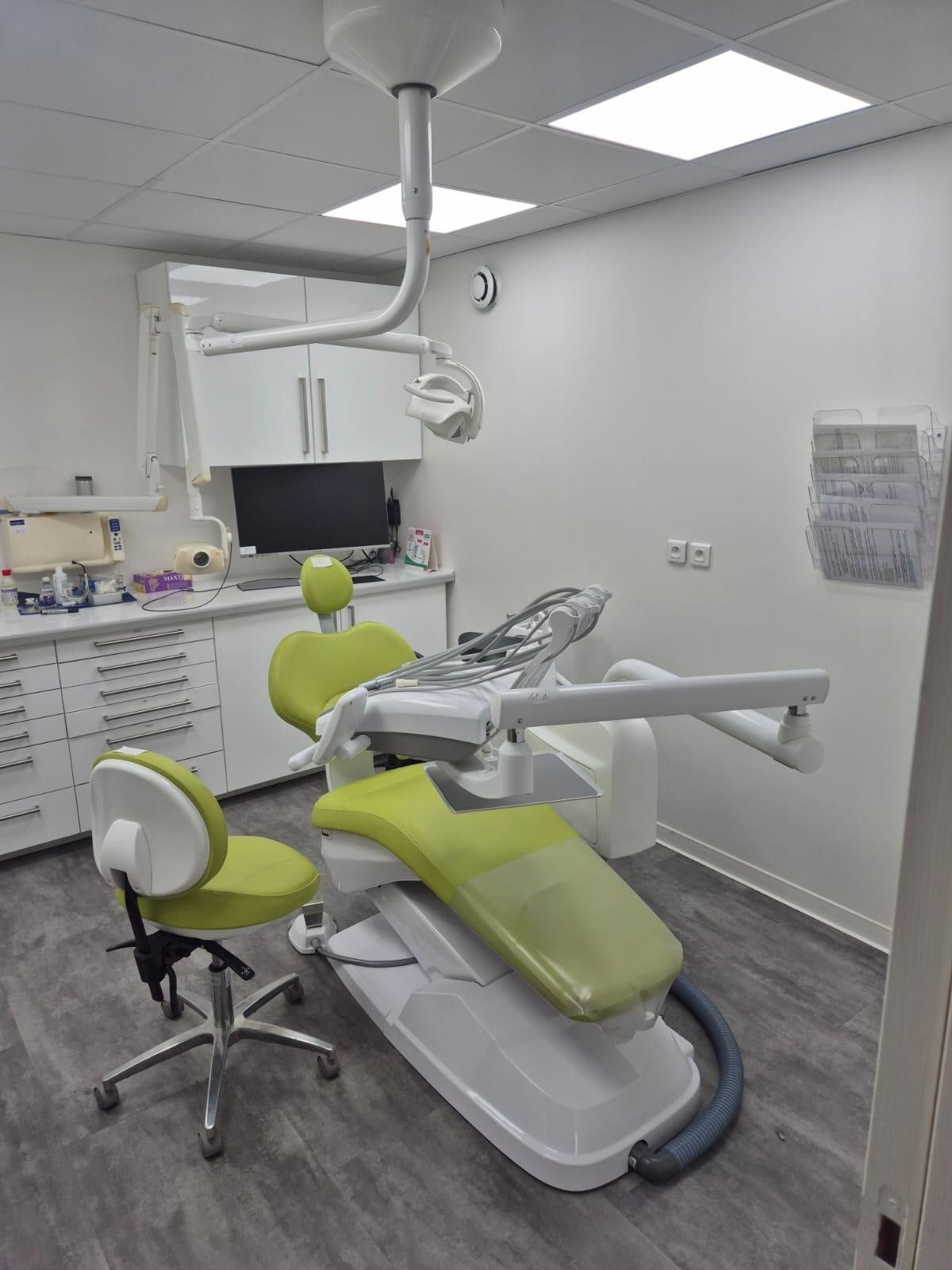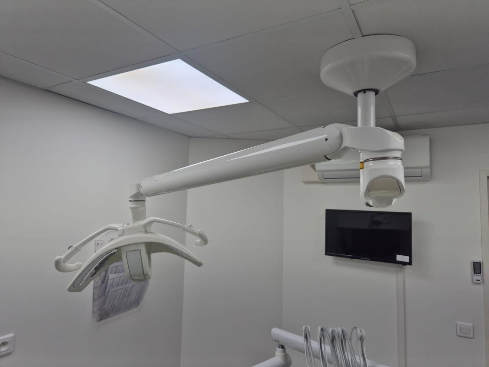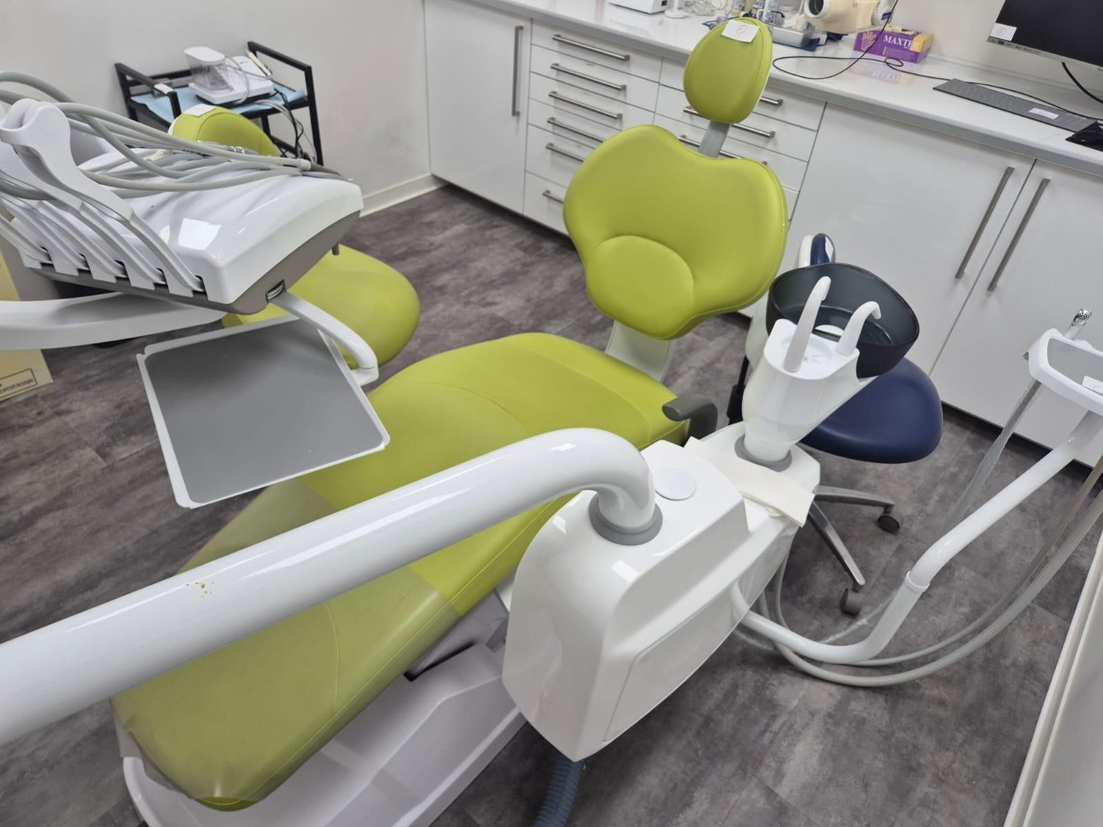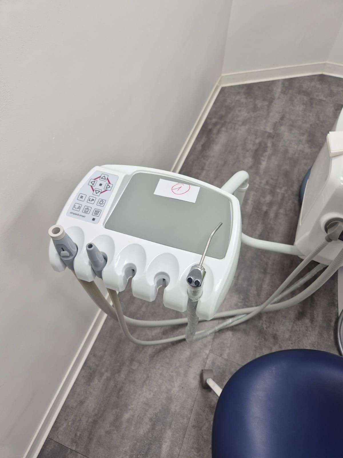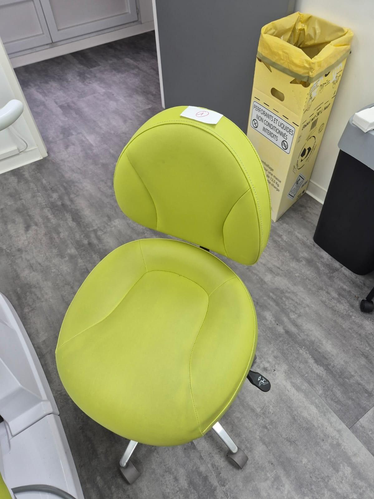 Dental chair with integrated unit comprising the following elements: instrument arm, spittoon, Faro scialytic.