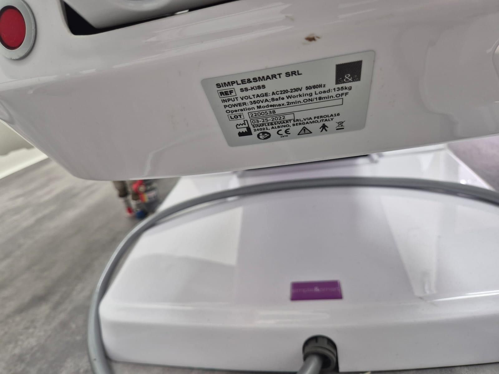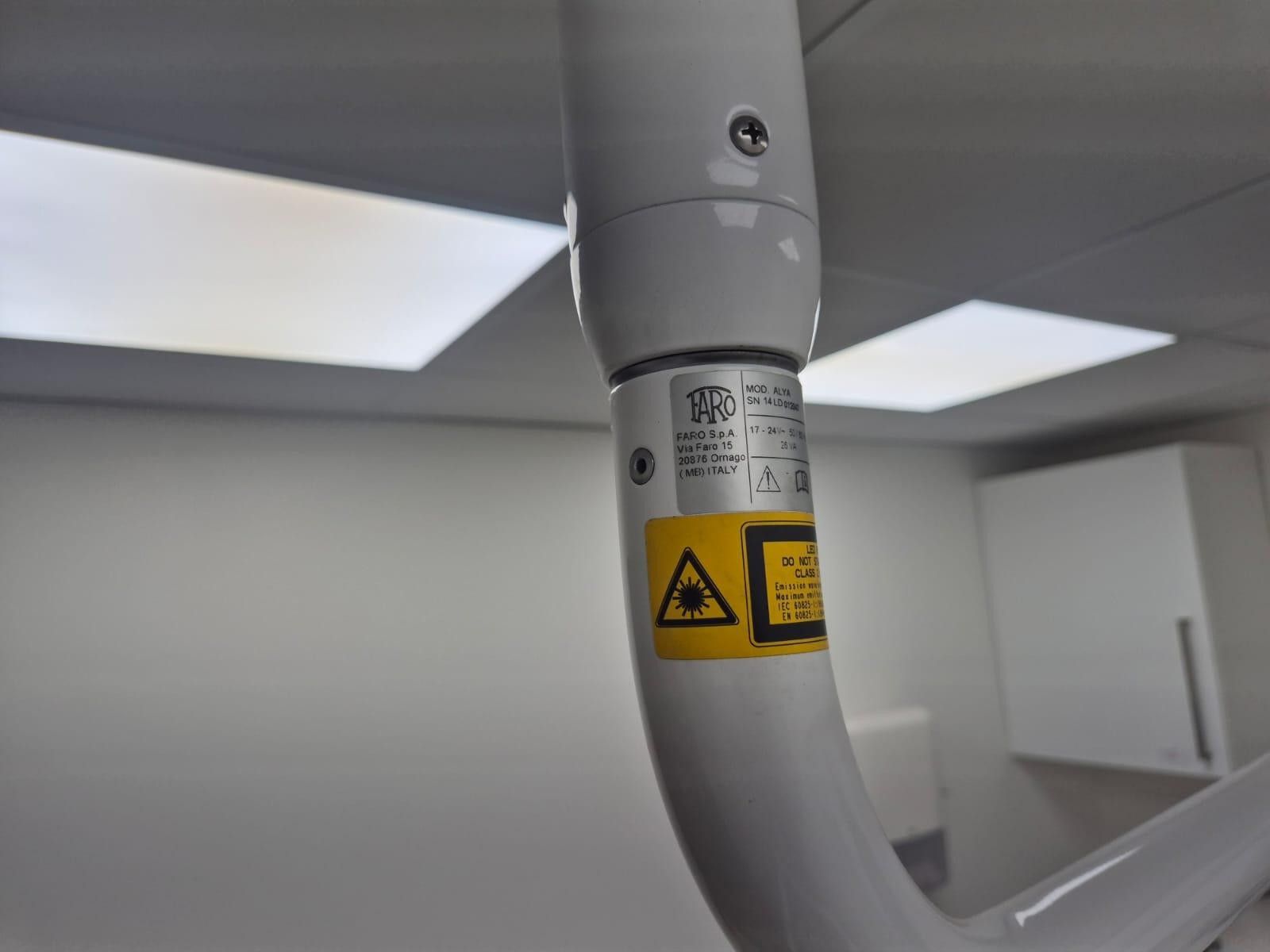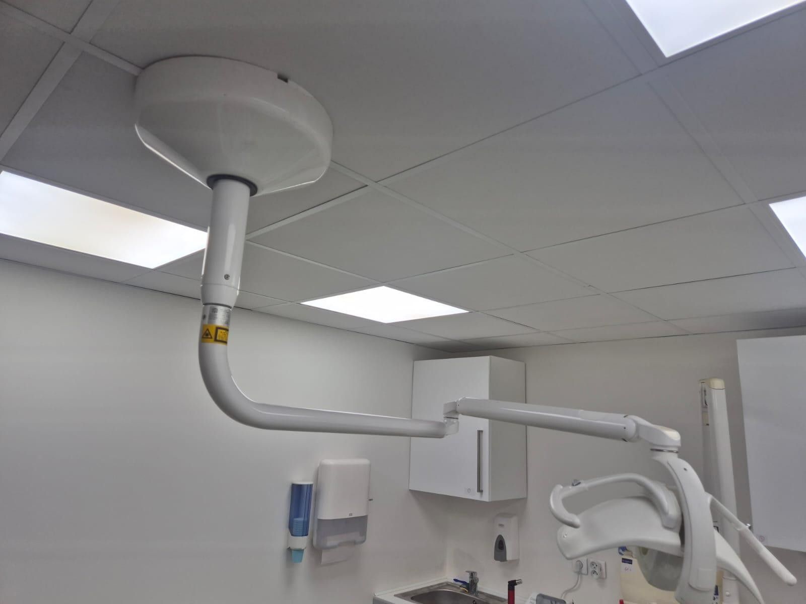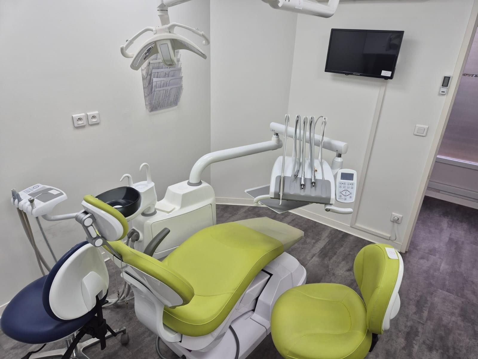 Dental chair with integrated unit comprising the following elements: instrument arm, spittoon, Faro scialytic.