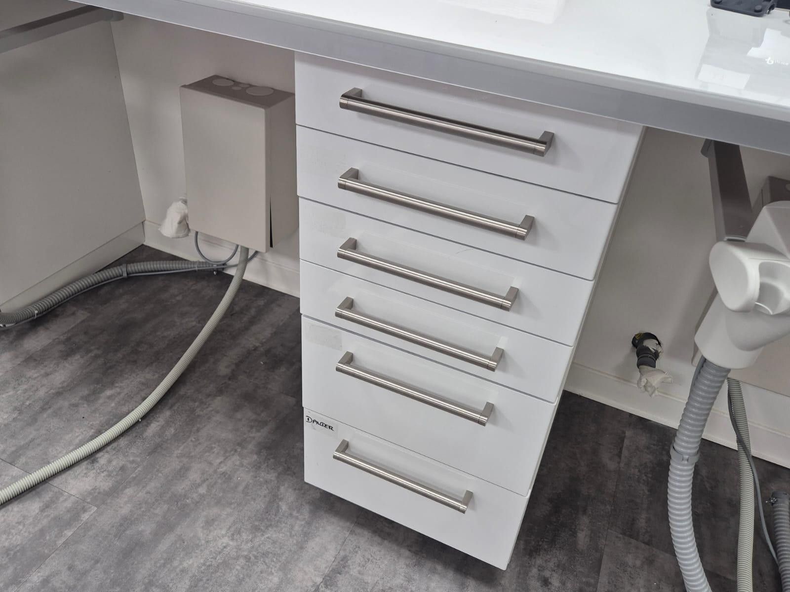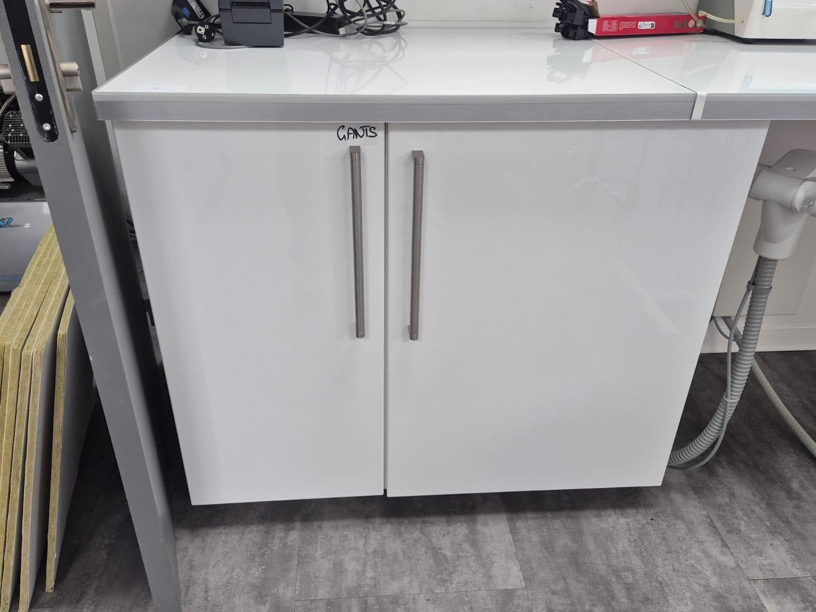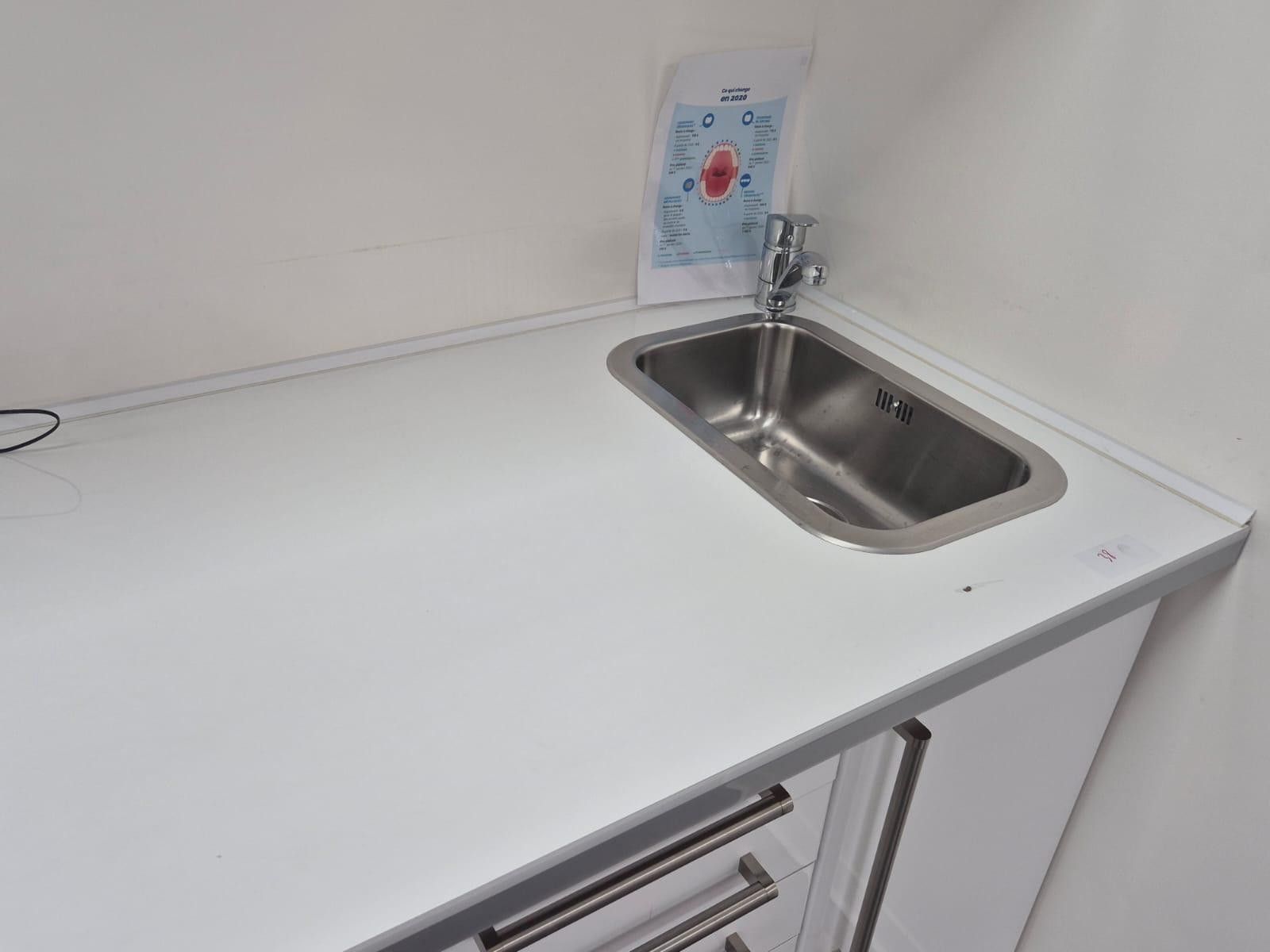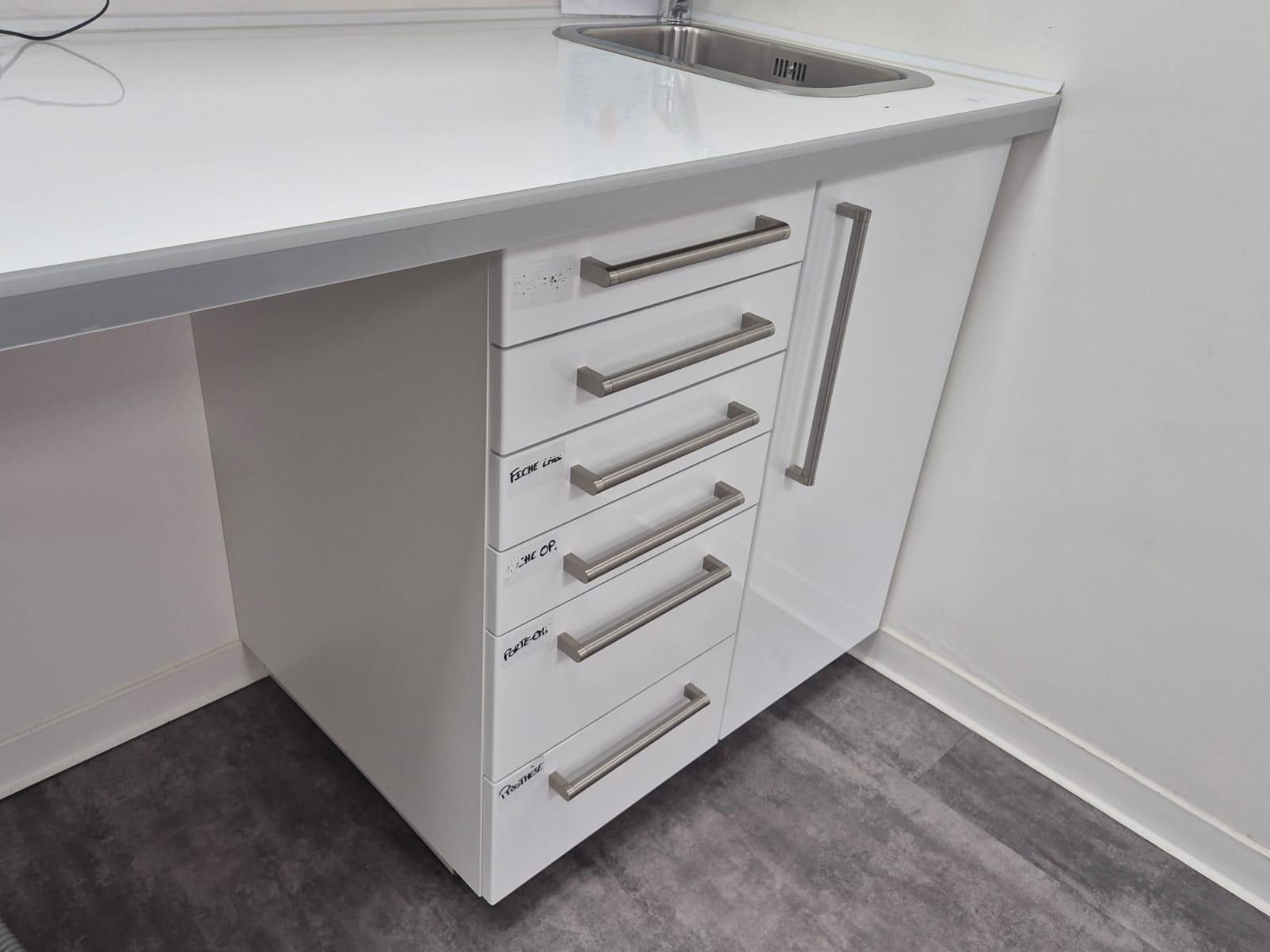 Worktop comprising a two-door, two-column base unit with six drawers and integrated sink.