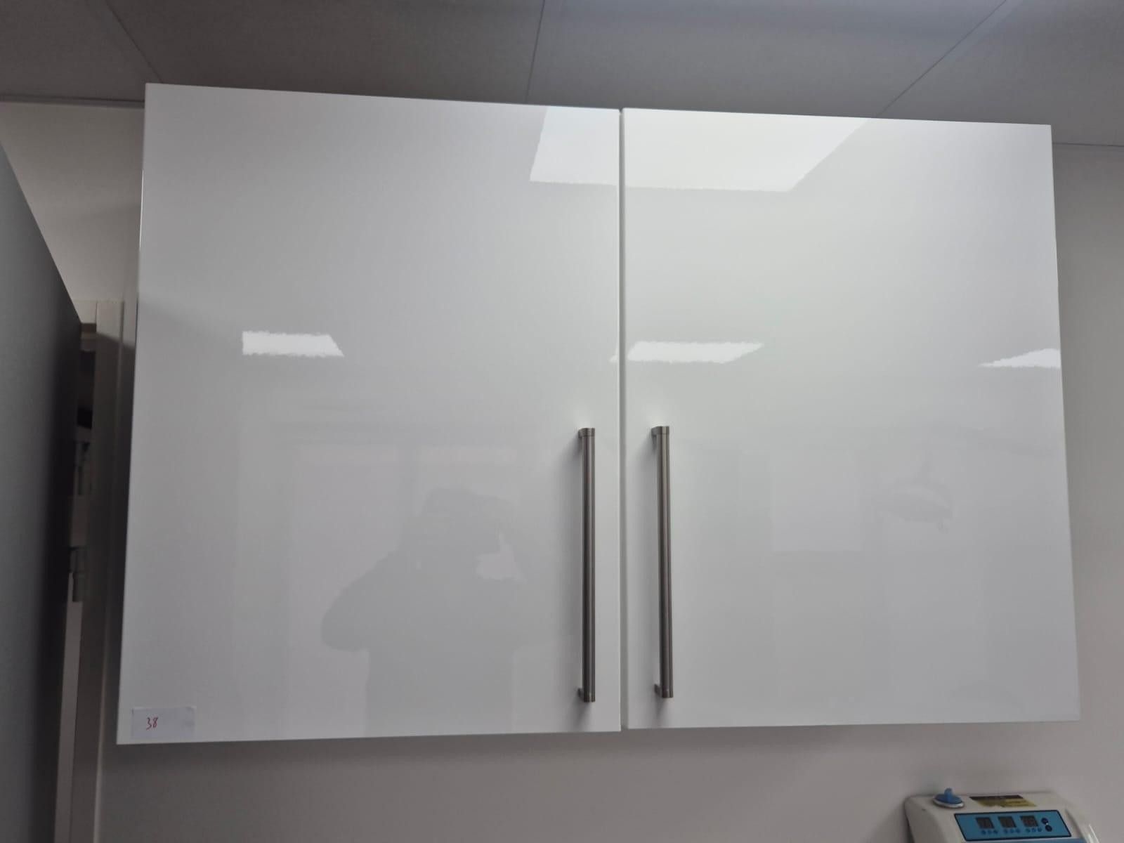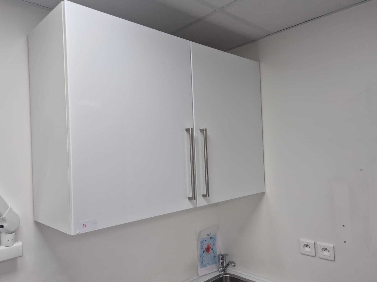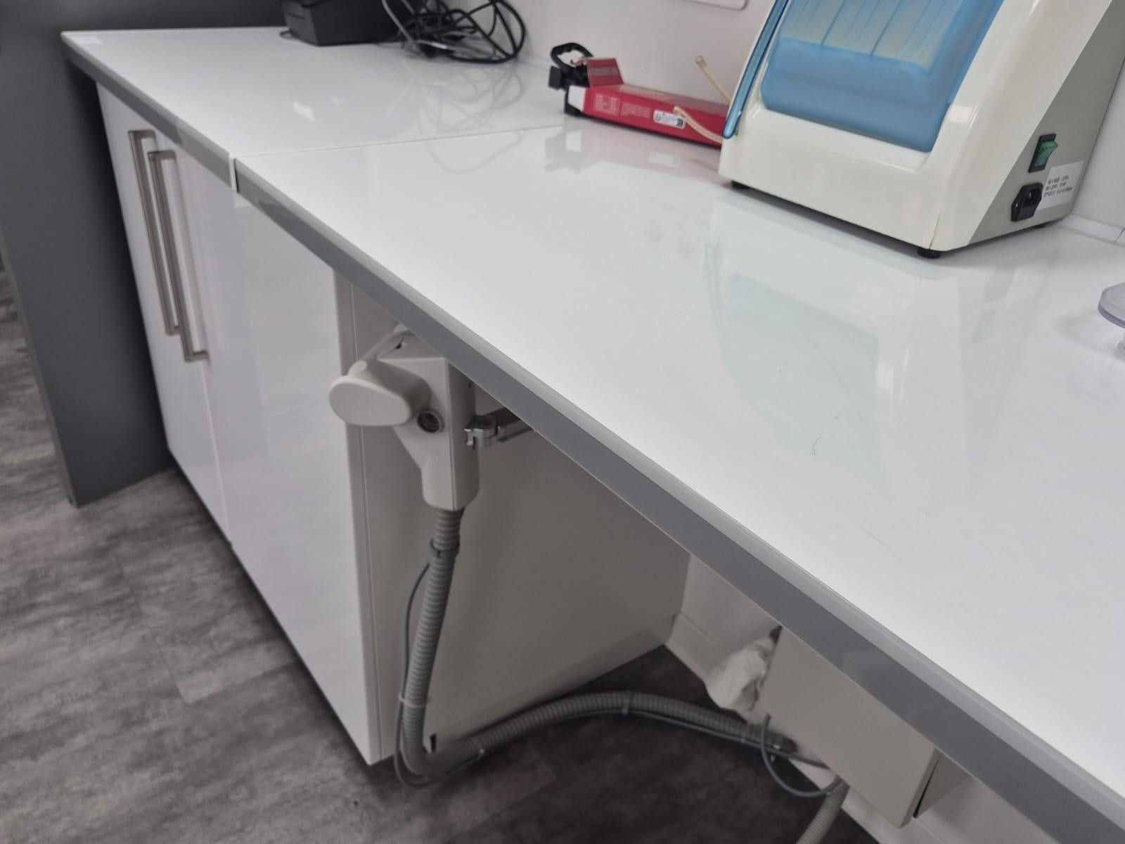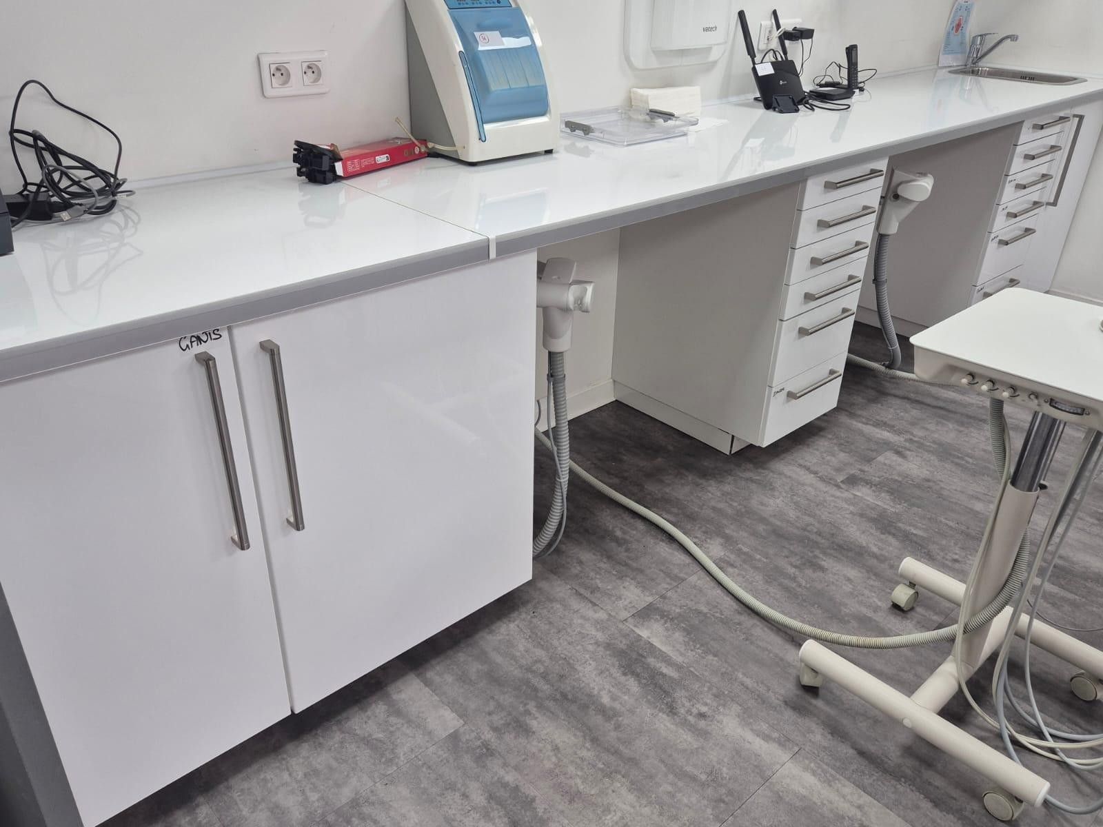 Worktop comprising a two-door, two-column base unit with six drawers and integrated sink.