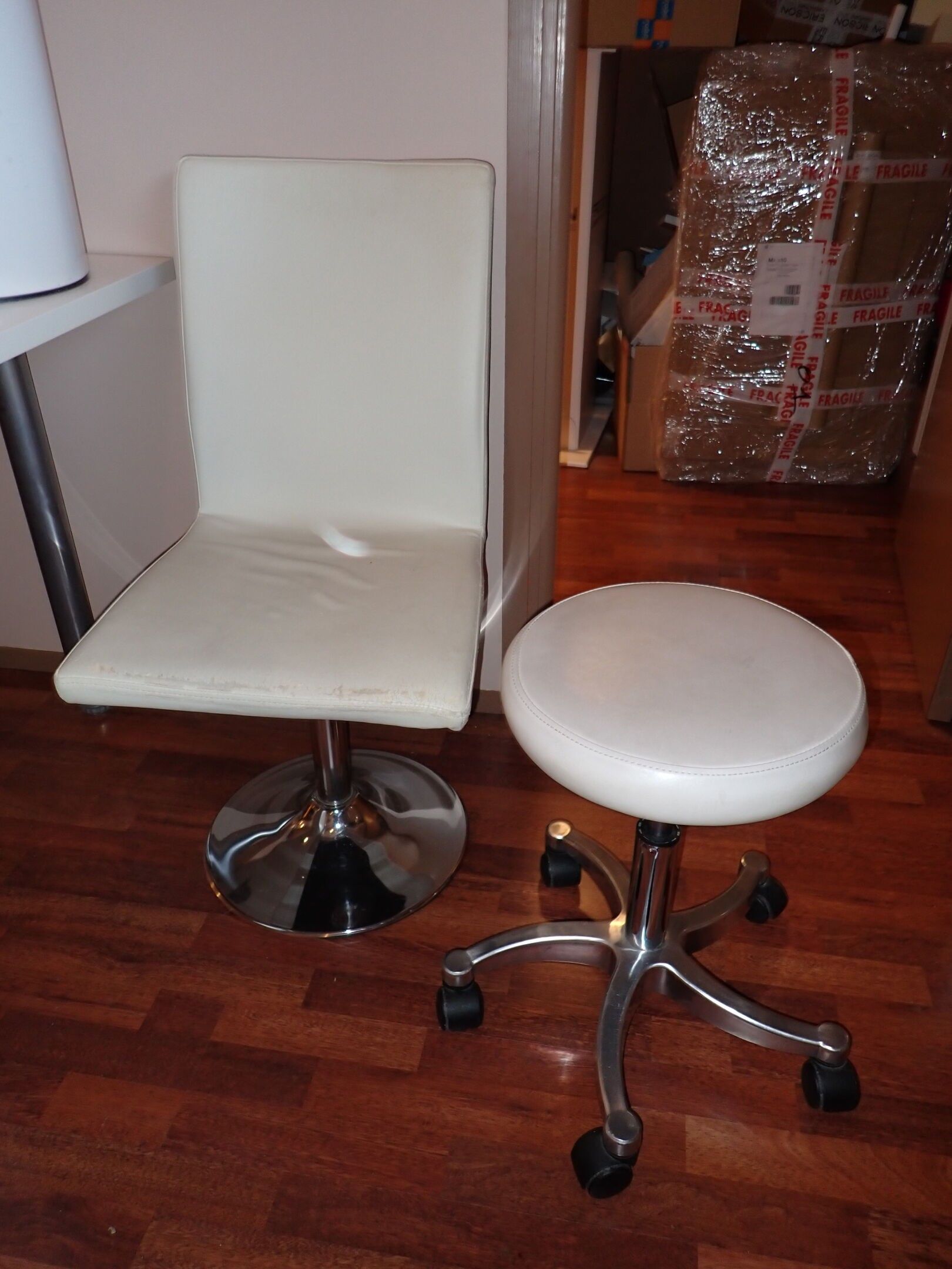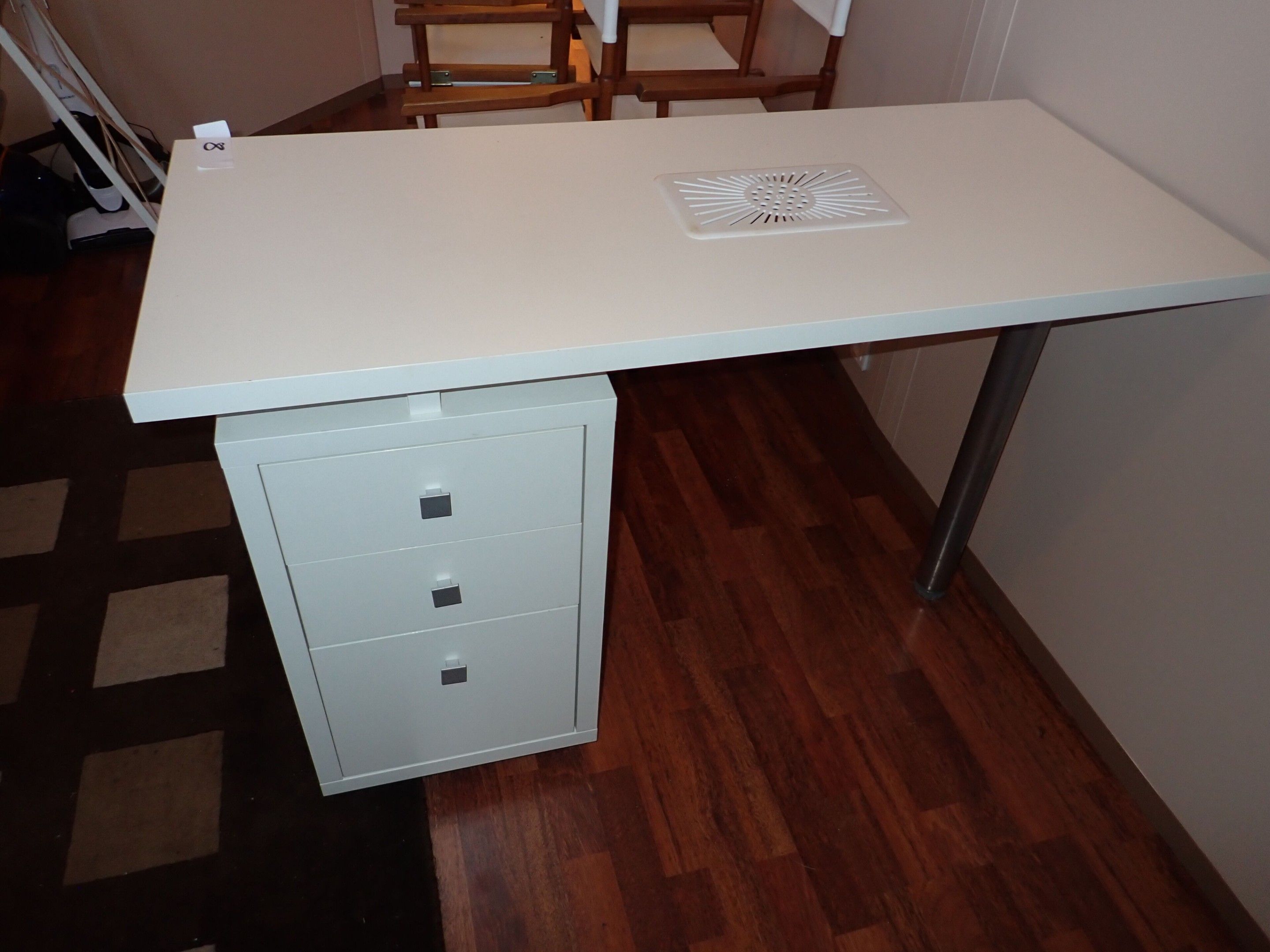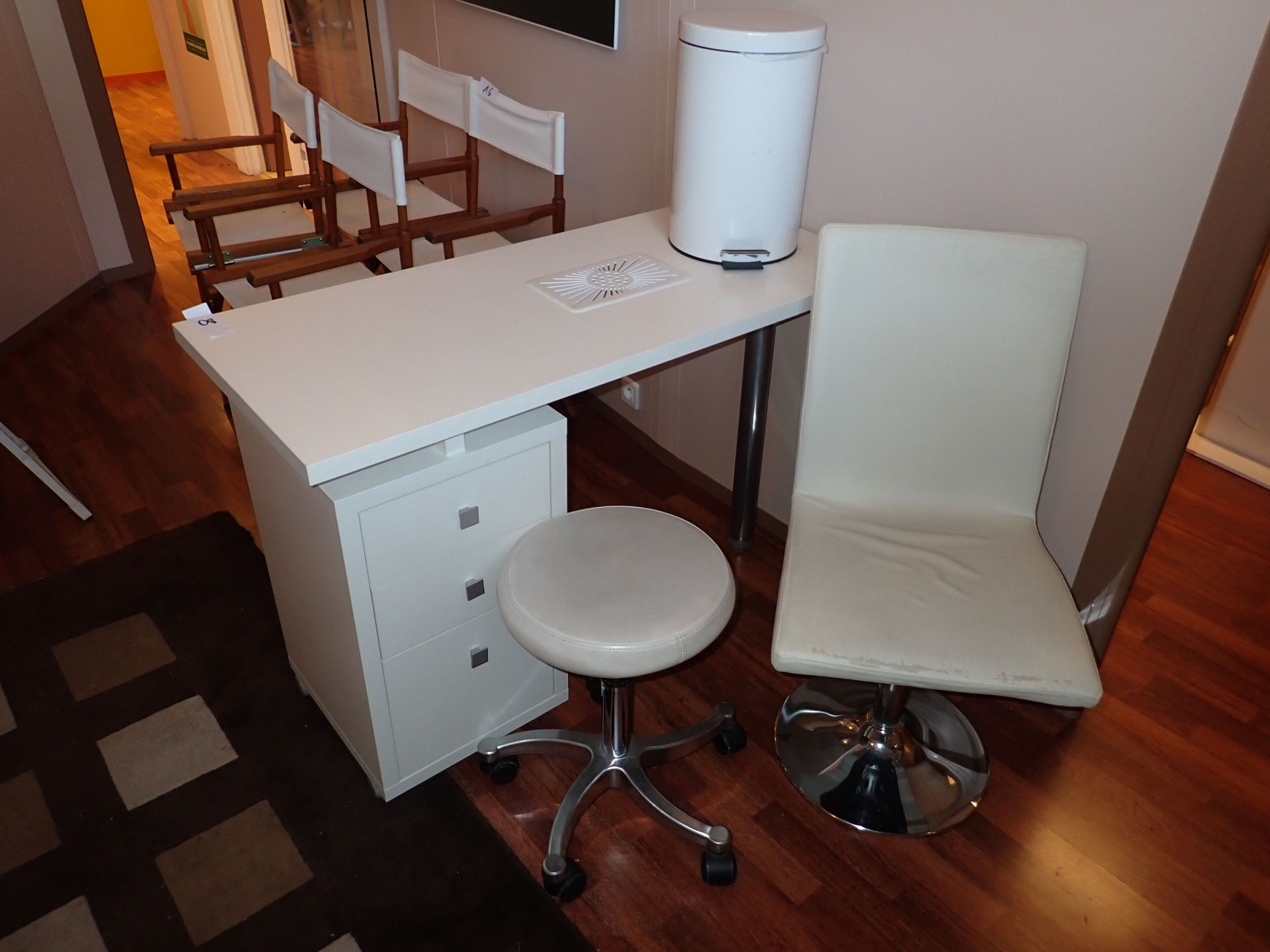 Laminated wood manicure station with 3 drawers lined with small manicure supplies 115x50xh78 with white skai stool with castors and white skai chair and wastebasket, judicial lot, Bid 60