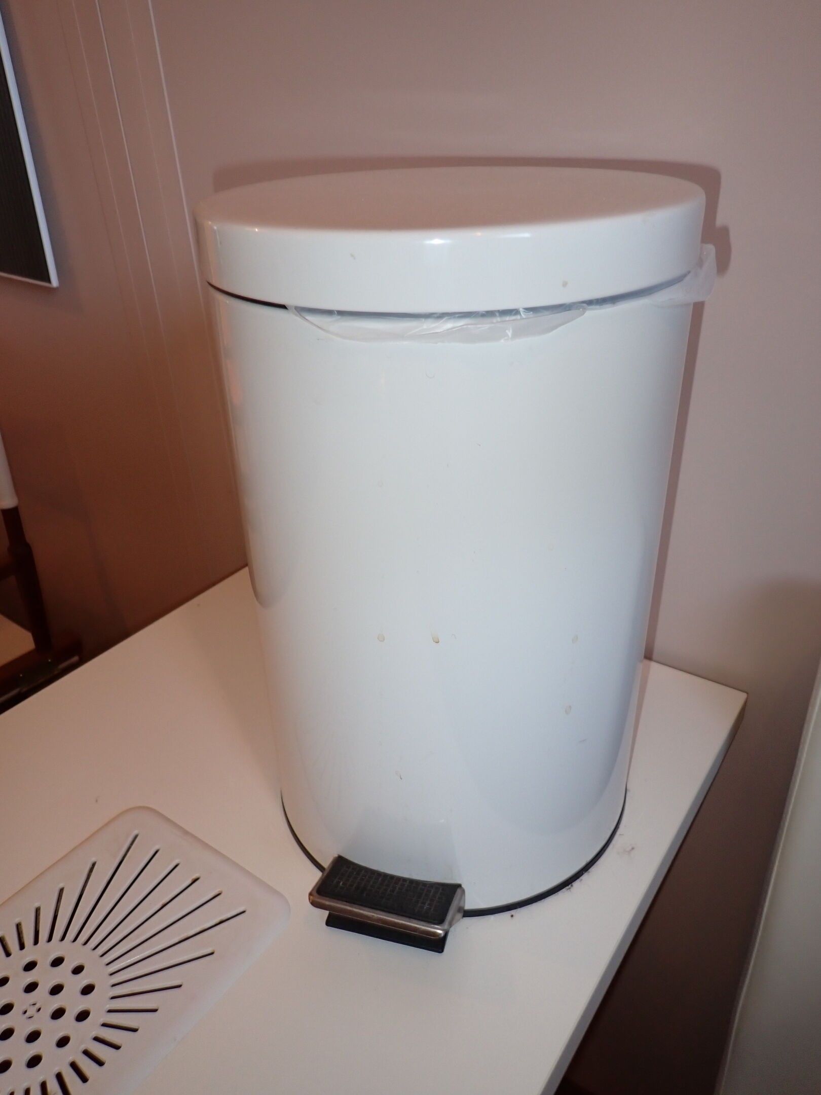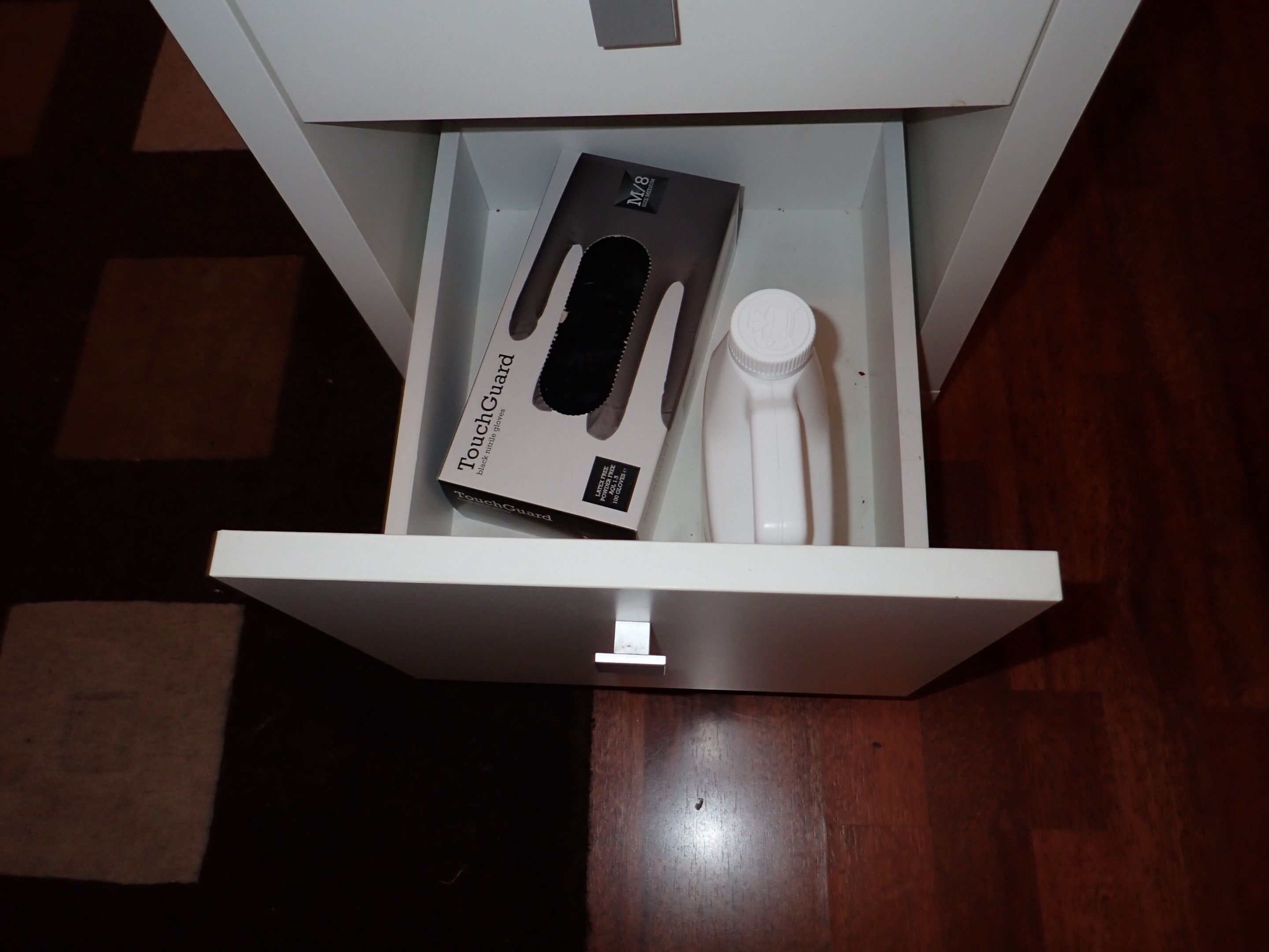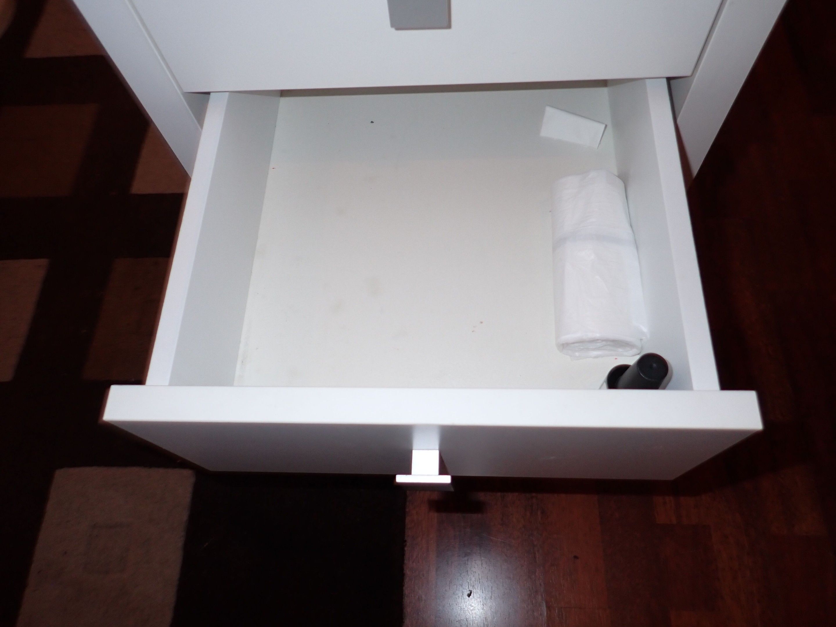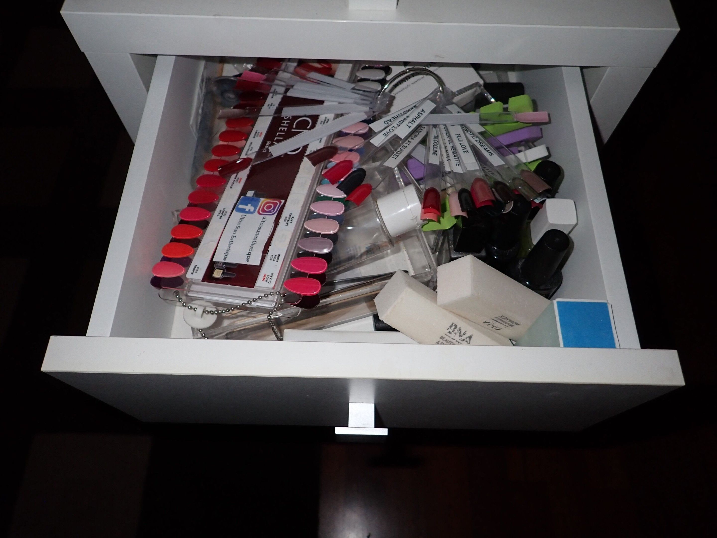 Laminated wood manicure station with 3 drawers lined with small manicure supplies 115x50xh78 with white skai stool with castors and white skai chair and wastebasket, judicial lot, Bid 60