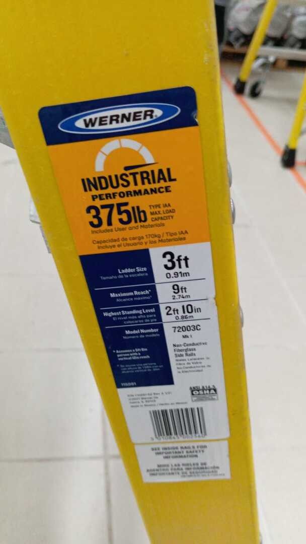 Stepladder WERNER model 72003C, 3 steps, yellow and black, equipped with 4 wheels, Capacity: 170kg, Maximum working height: 2m74 approximately - NEW end of series, collection from depot in Dampierre sur Boutonne or transport possible.