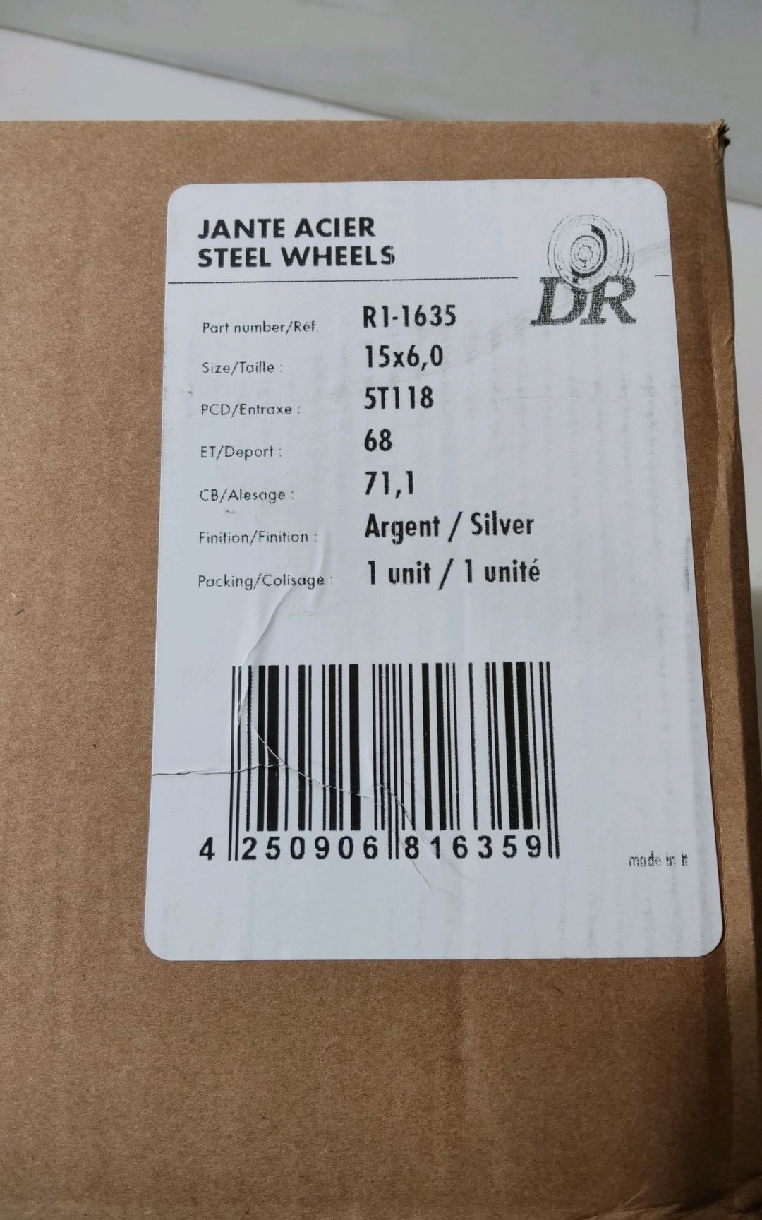 15 inch 5 hole steel rim - DR - 15x6 5x118 ET68 71.1 - Brand new - Recoverable VAT - The first photo is generic, non-contractual and provided as an example - This lot is available everywhere in France from 28,92 € - This lot is available everywhere in Europe from 54,96 €.