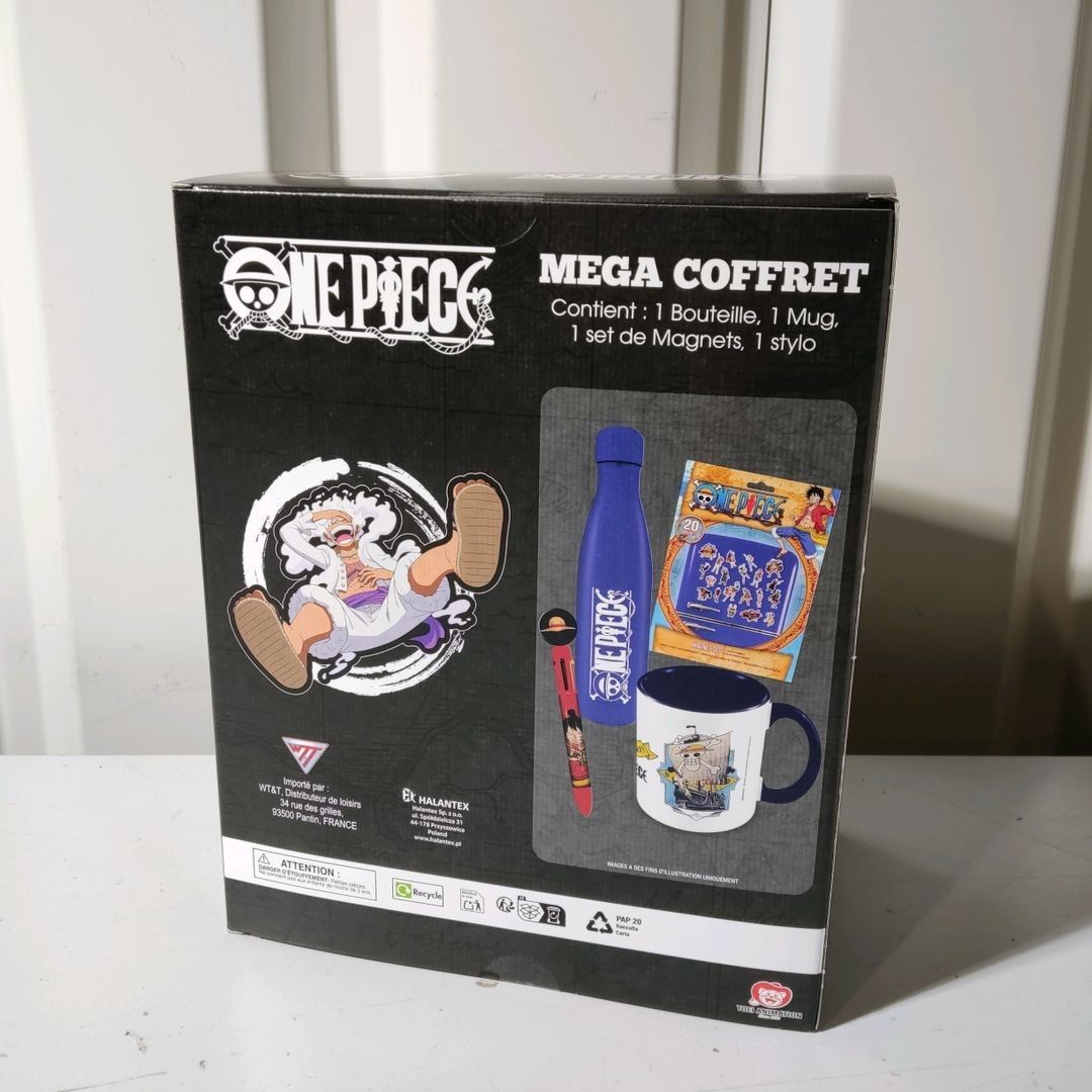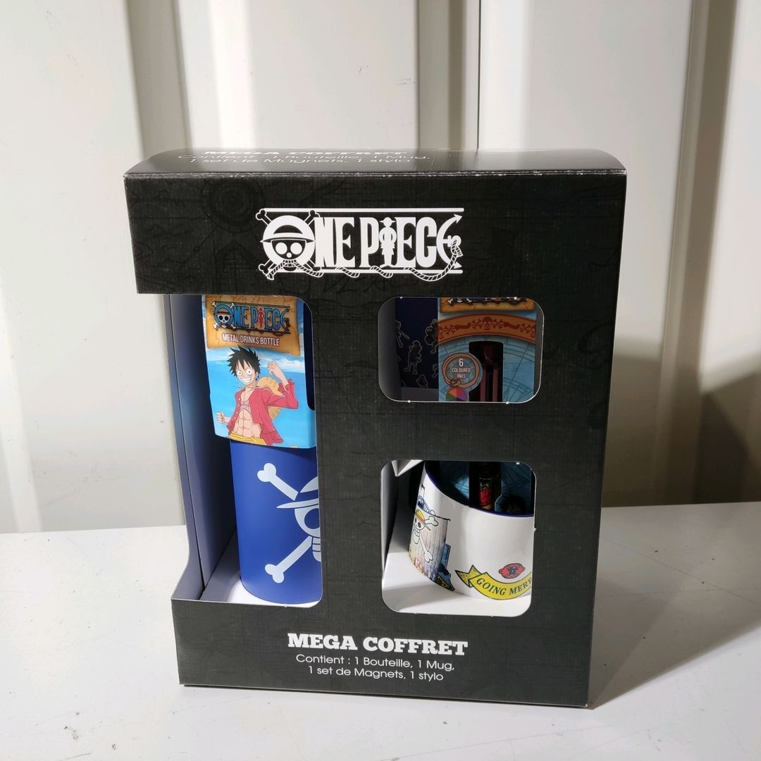Mega One Piece boxed set - Contains: 1 bottle, 1 mug, 1 set of Magnets and 1 Pen - Brand new - Recoverable VAT - This lot available everywhere in mainland France from €14.04 - This lot available everywhere in Europe from €24.00