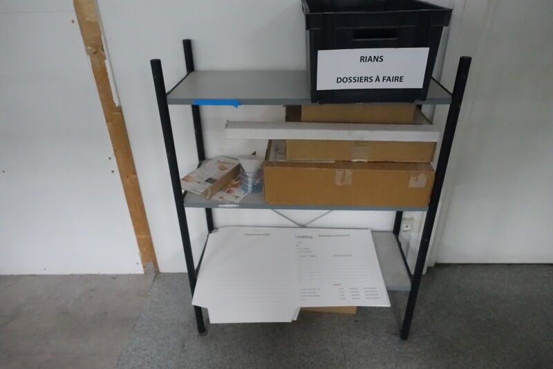 ON DESIGNATION: Two metal shelves with pvc boxes and one low…