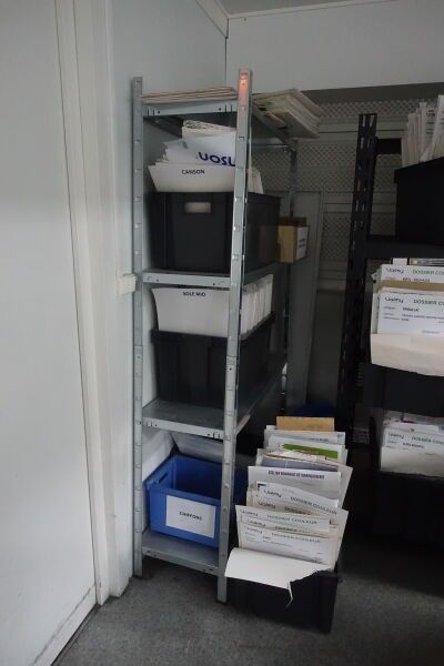 ON DESIGNATION: Two metal shelves with pvc boxes and one low shelf with contents