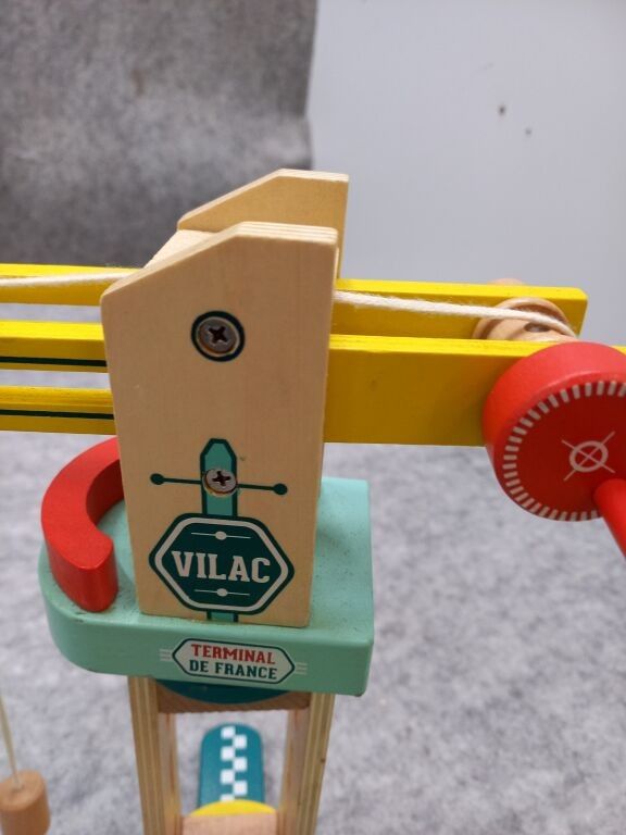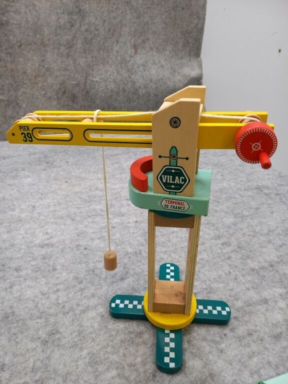 MOULIN ROTY wooden walking trolley + JANOD wooden activity table + wooden games including VILAC and LILLIPUTIENS cranes and lorries (traces of use, paint and varnish chips on some).