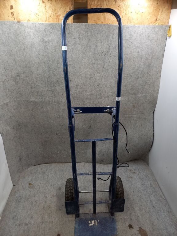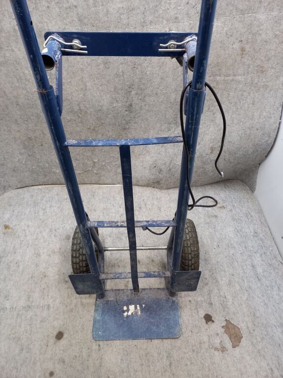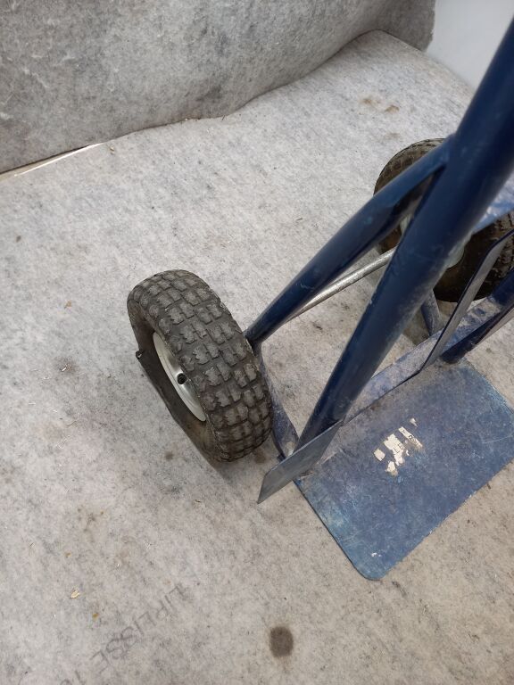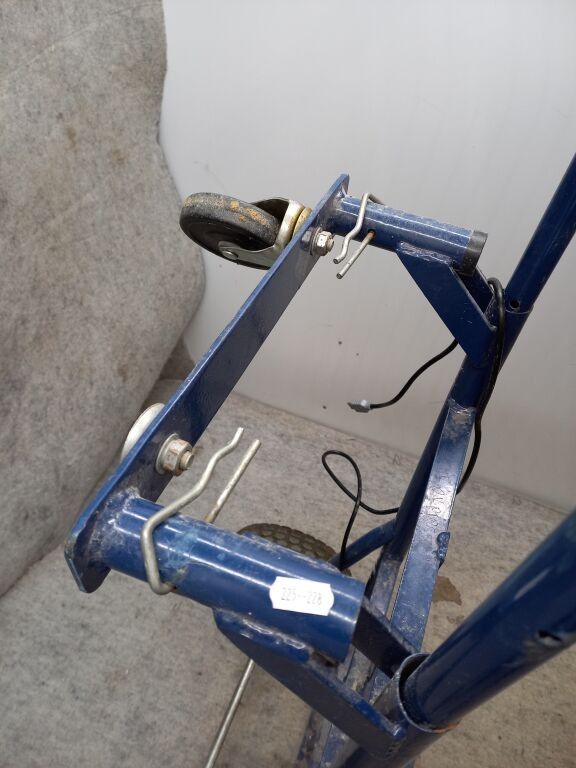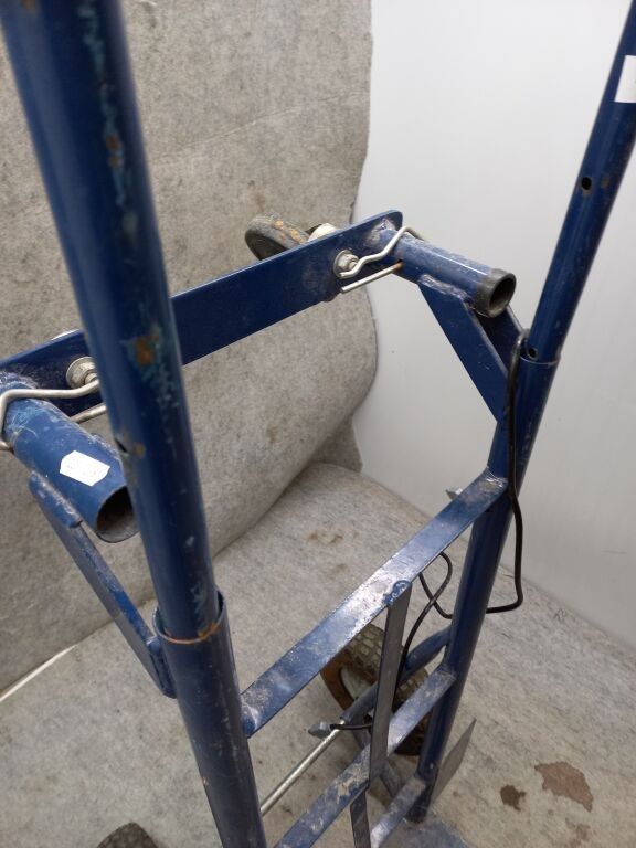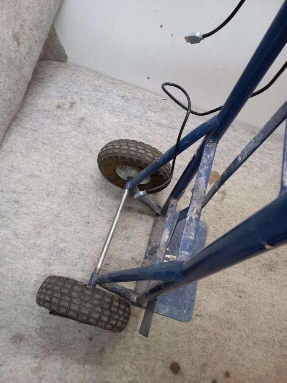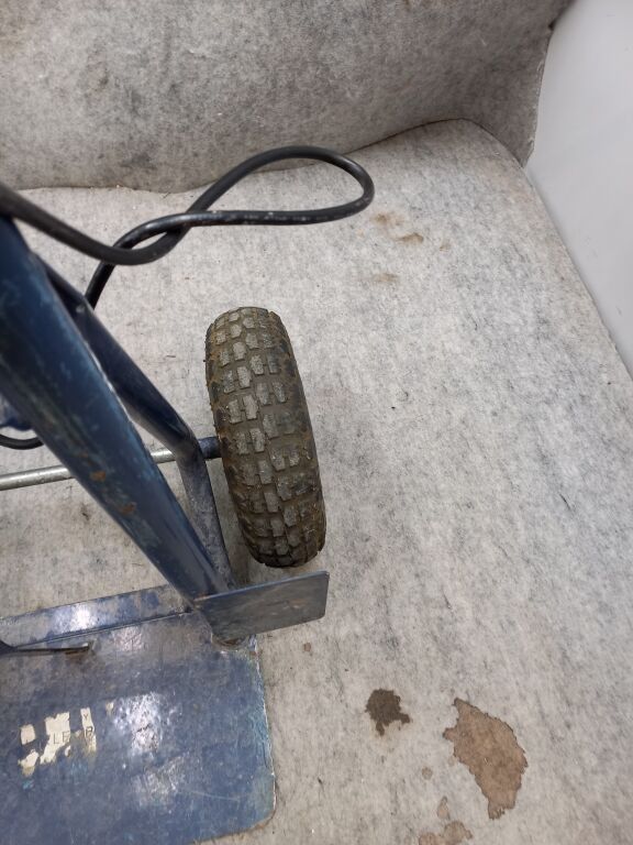 Blue trolley (wheels to be changed, rear wheel missing, signs of use)