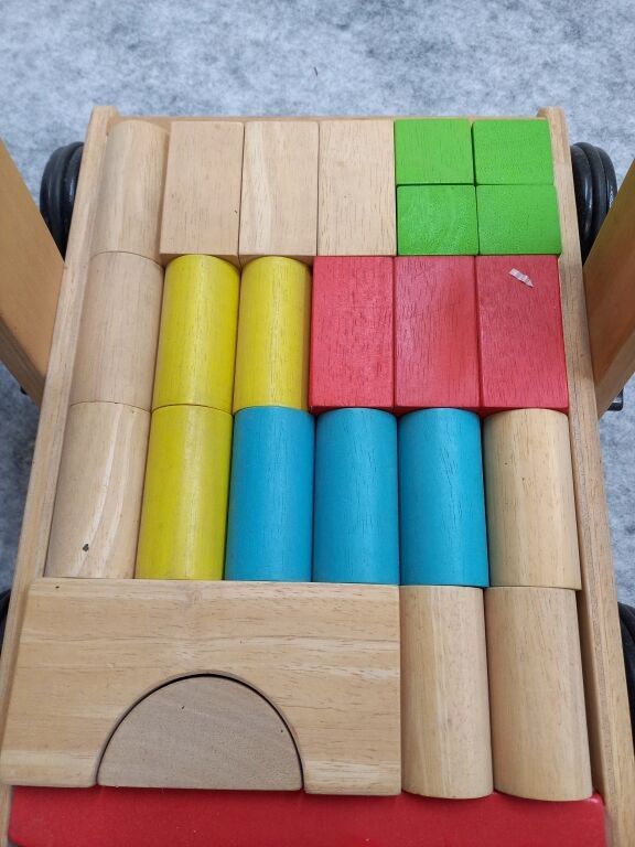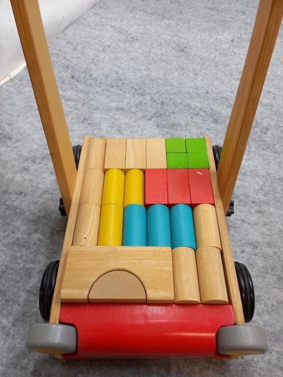 Wooden walking trolley with PLANTOYS cubes + wooden games including MOULIN ROTY (traces of use, varnish and paint chips on some)