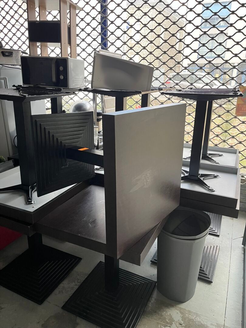 5 Terrace tables with wood-look laminate tops,