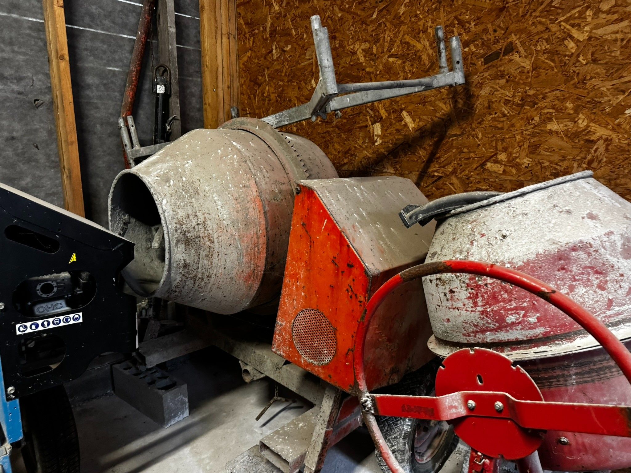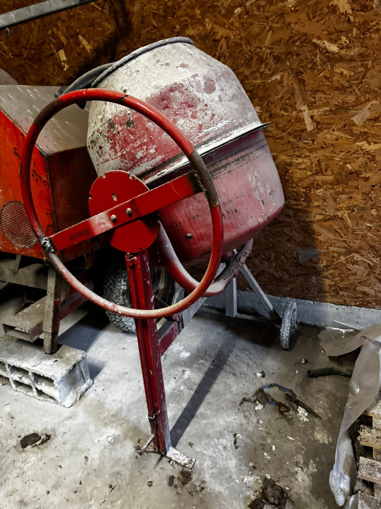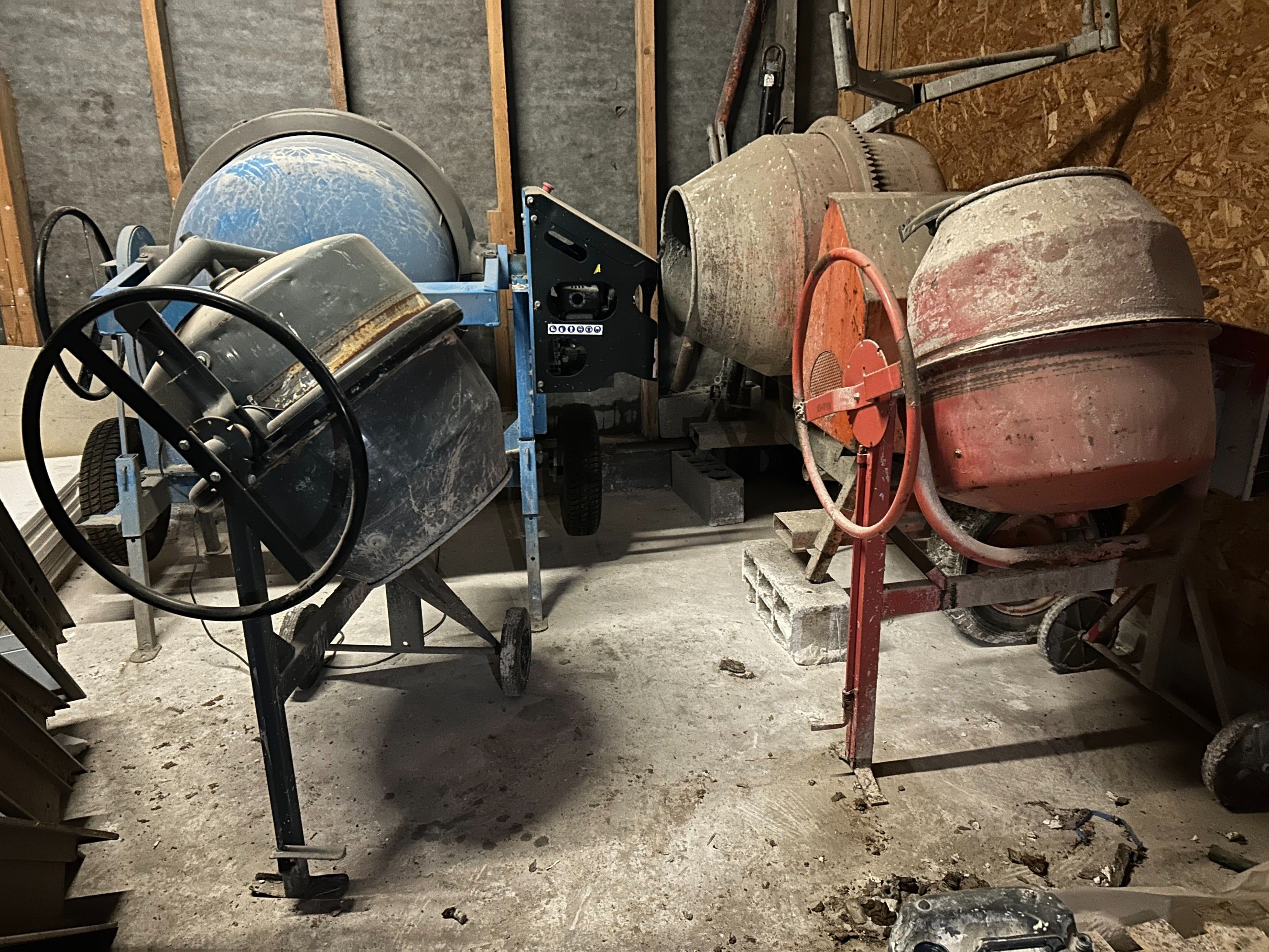 - Two old red concrete mixers, out of order.