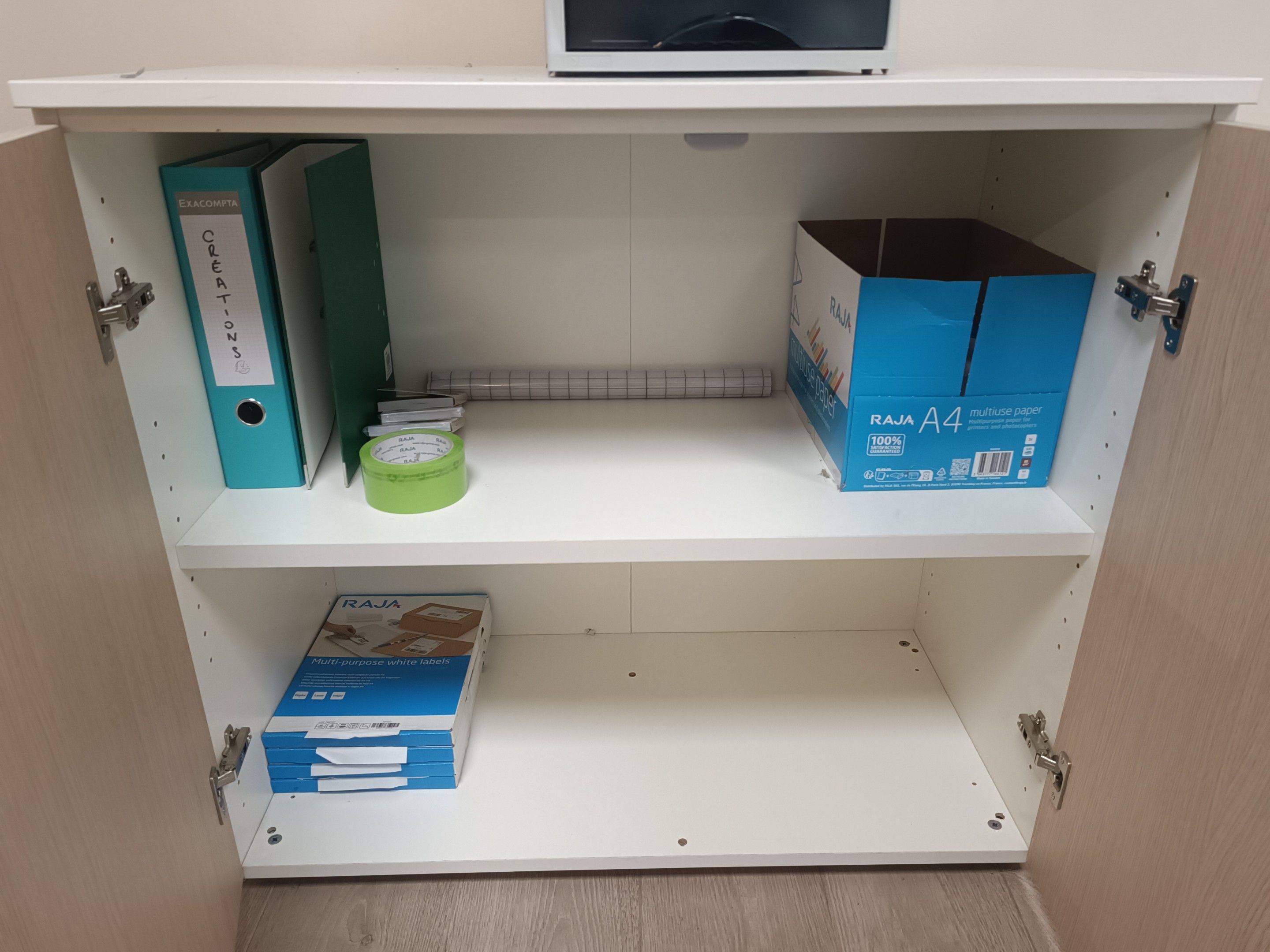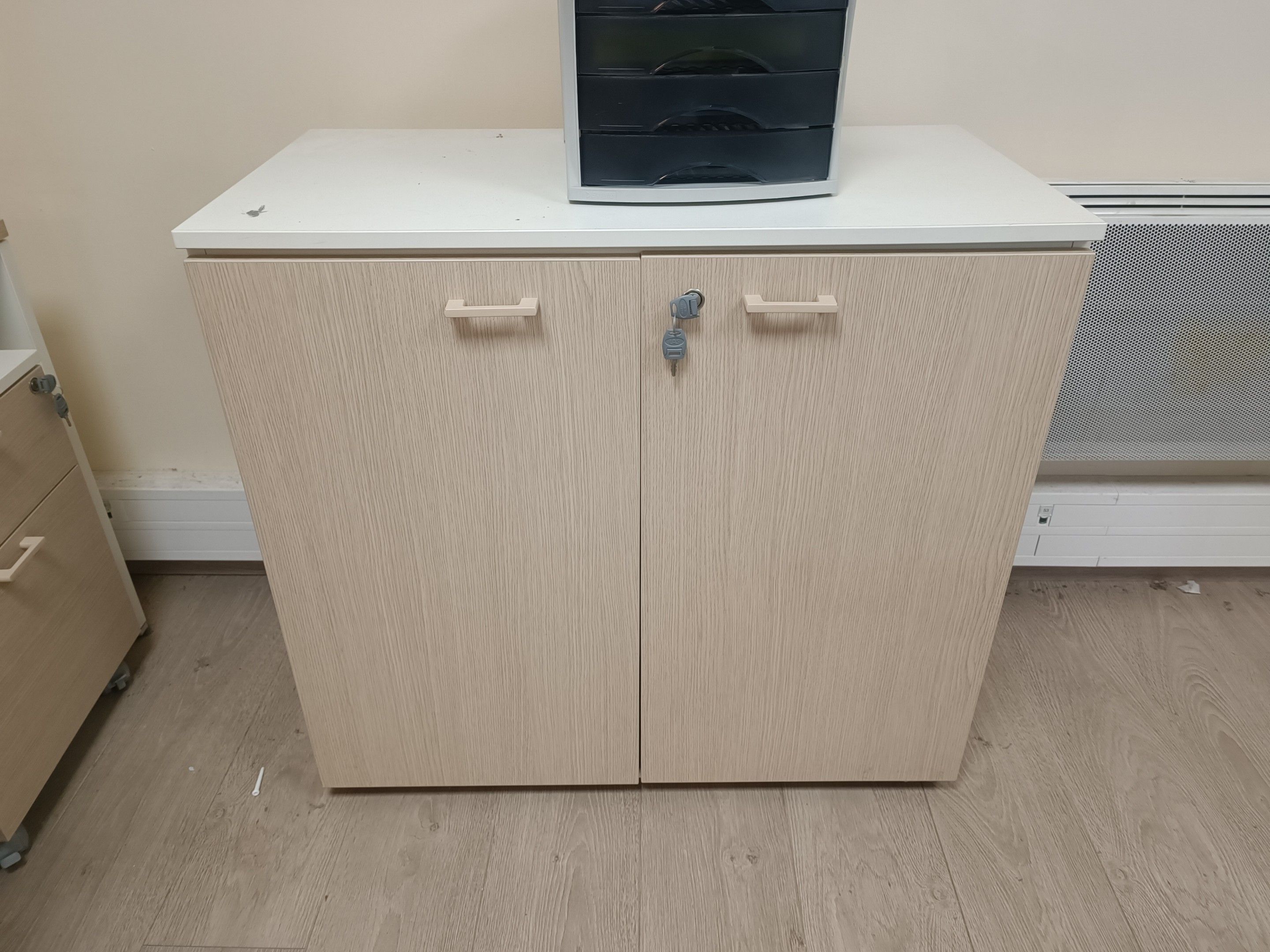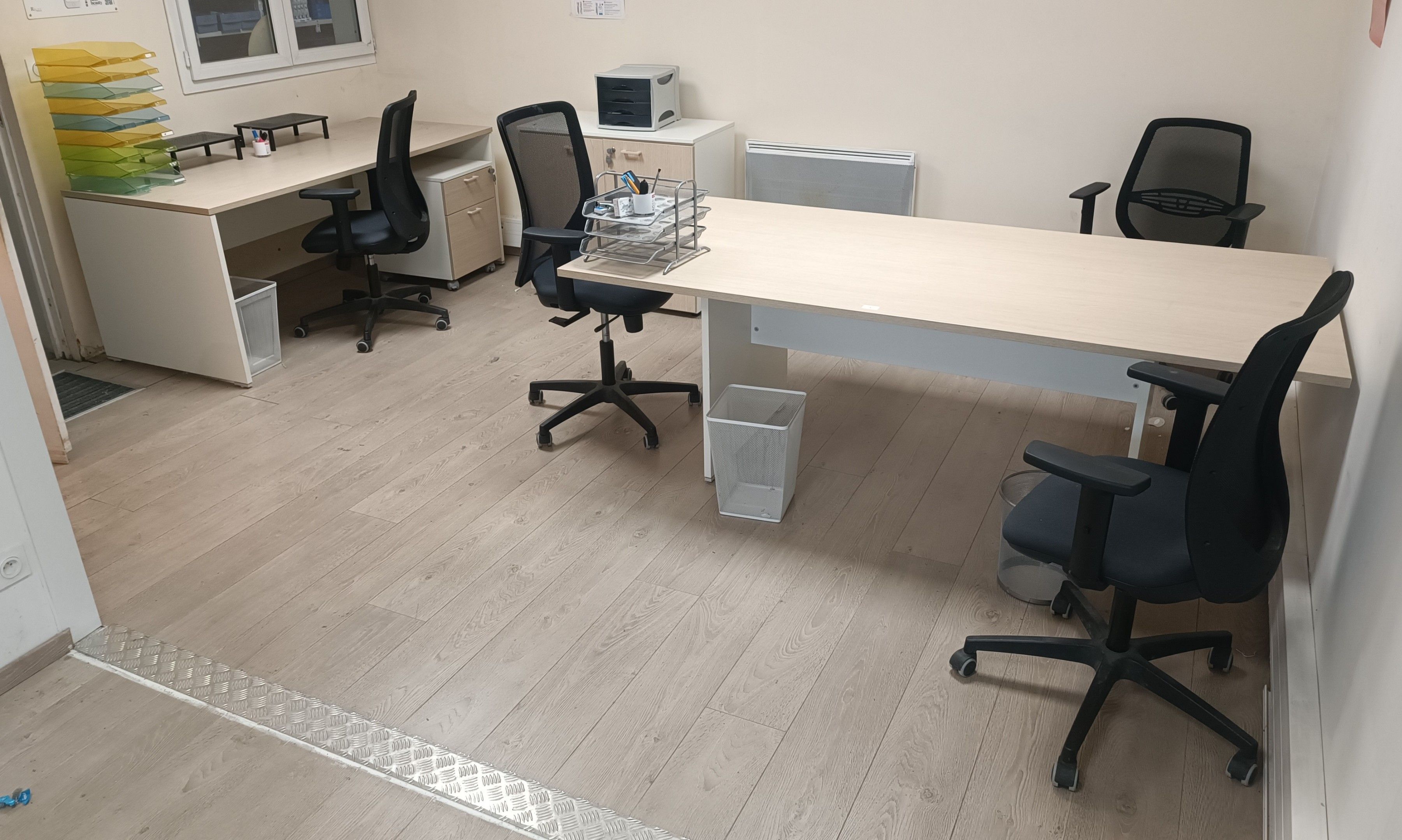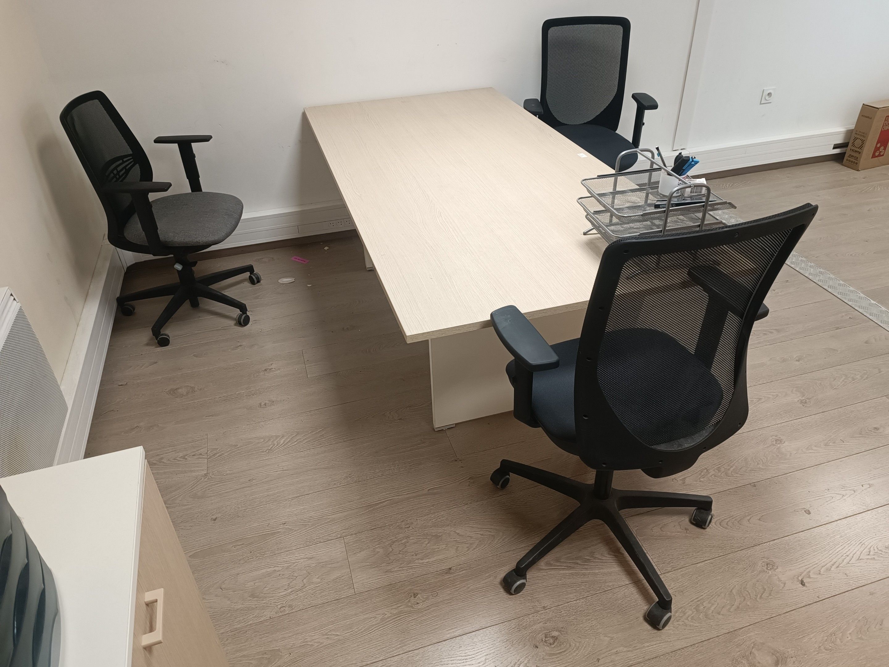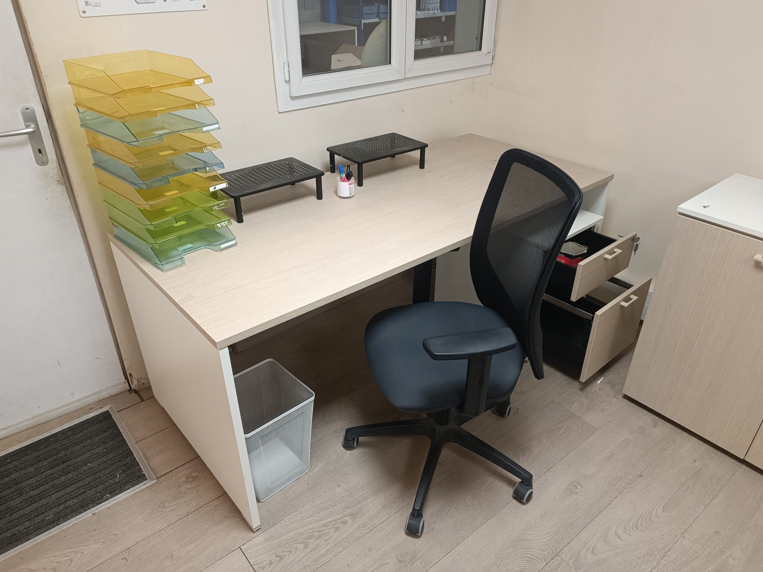2 laminated wood desks 73x210x100 and 73x180x80 with 1 pedestal / 2-door laminated wood base unit 93x90x47 / 4 office chairs / Office supplies