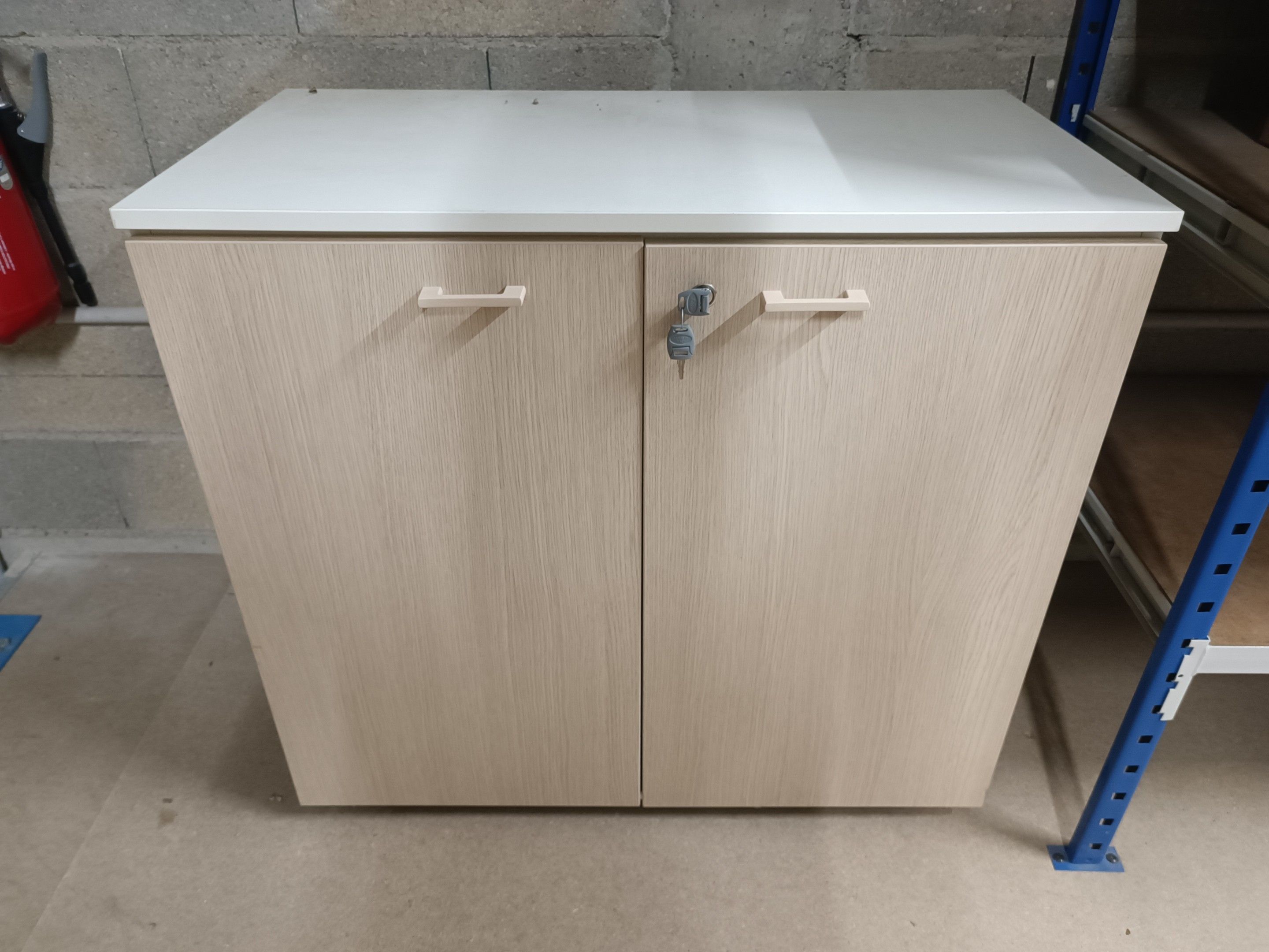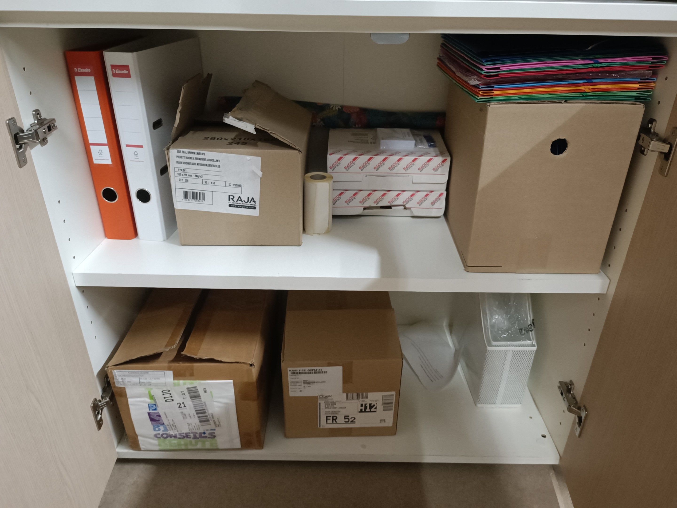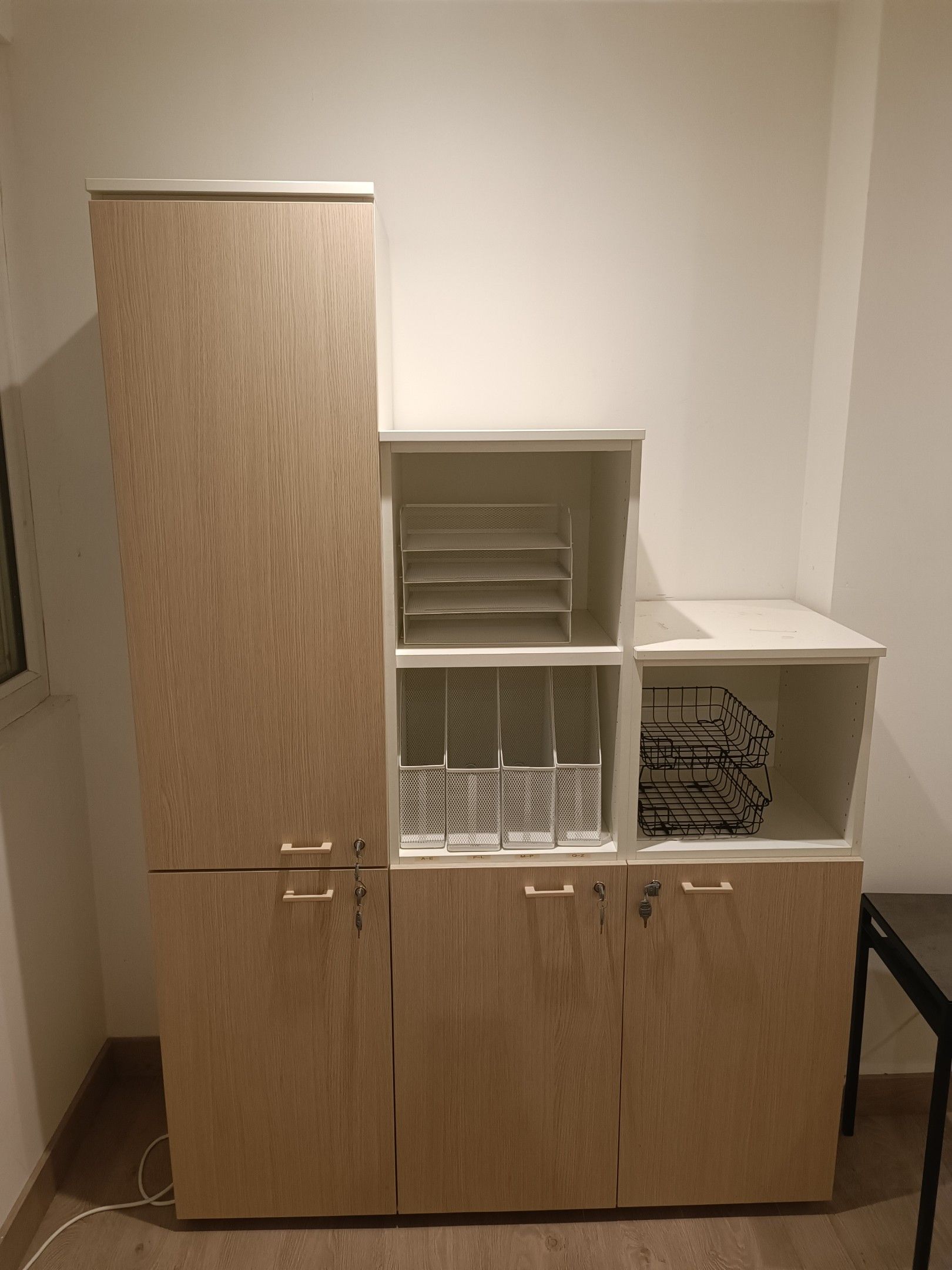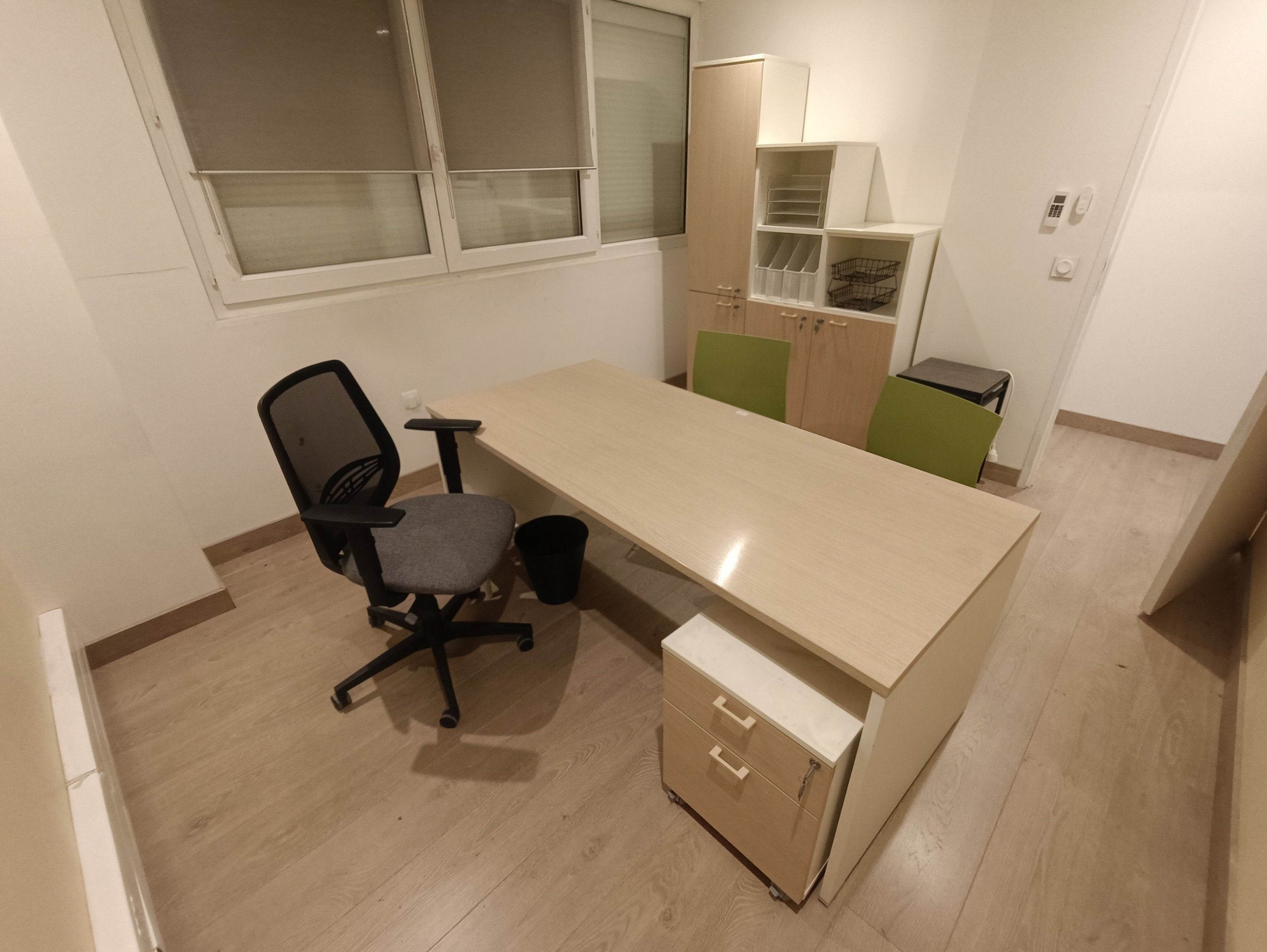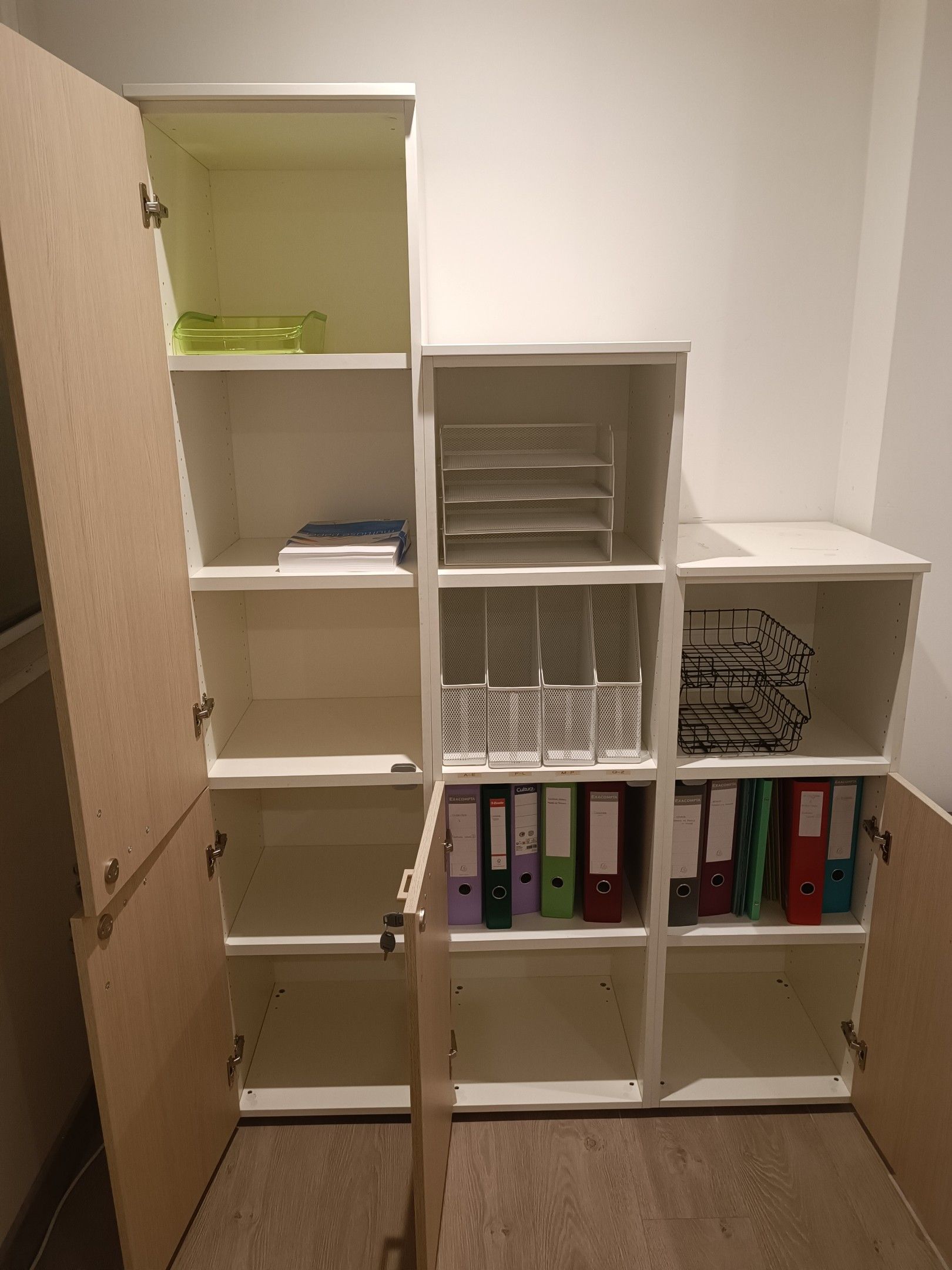 Laminated wood desk 73x180x80 with 1 pedestal / Laminated wood 2-door base unit 93x90x47 / 3 Laminated wood columns 198x45x47 with 2 doors - 160x45x47 with 1 door and 2 niches - 122x45x47 with 1 door and 1 niche / Office armchair / 2 Waiting chairs with metal base and green plastic seat / Office supplies