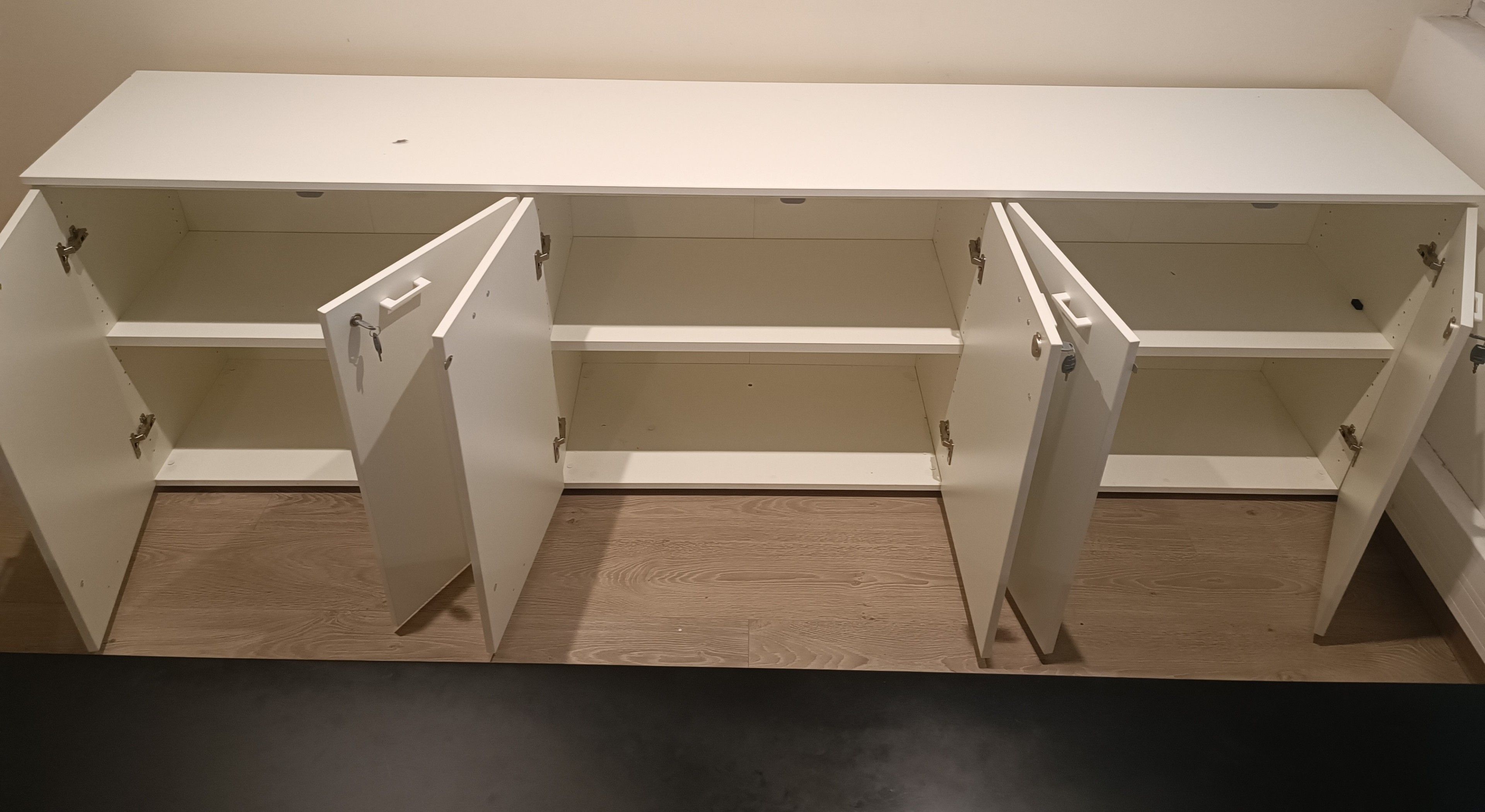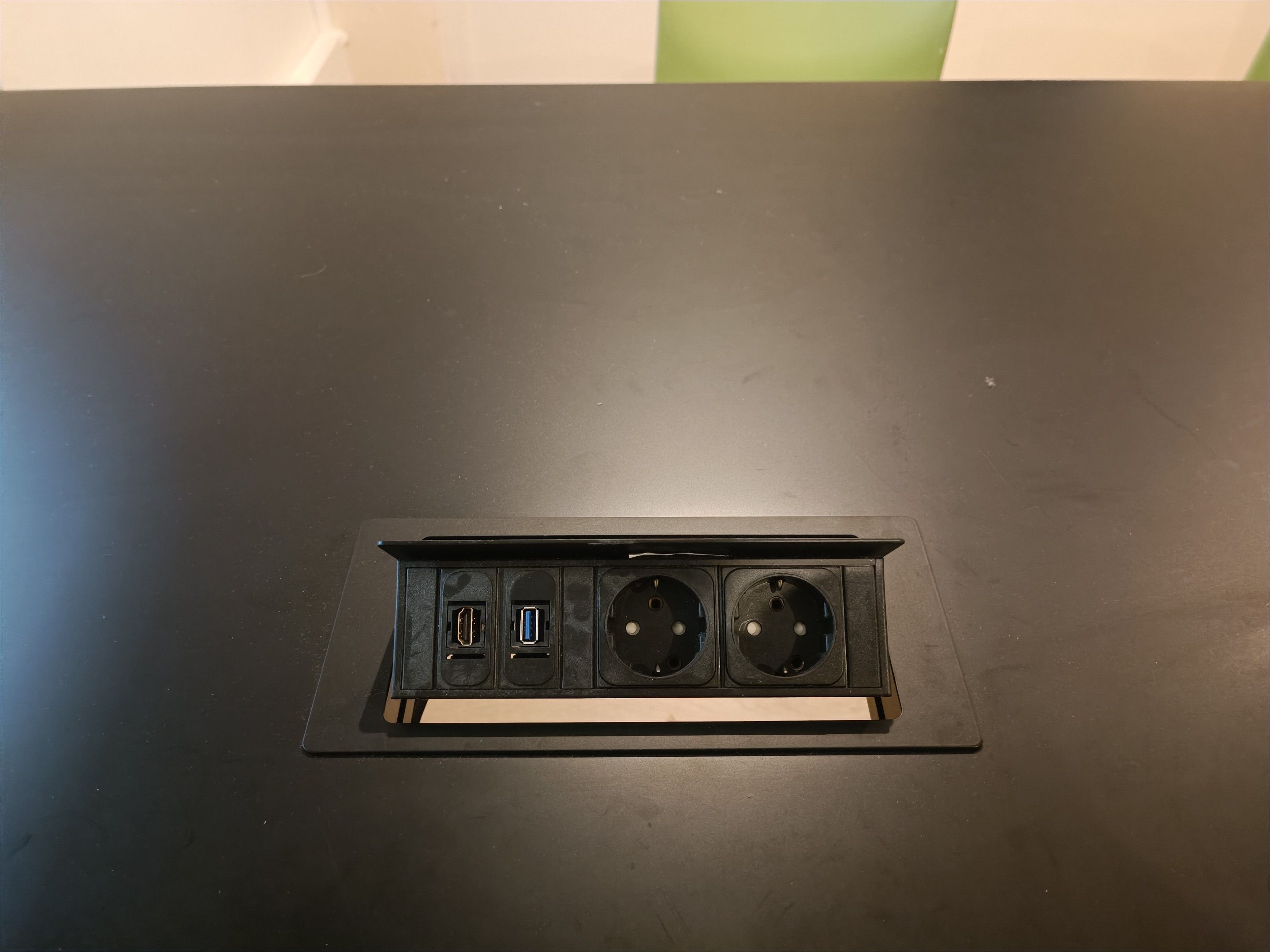 Rectangular meeting table in black resin with 4 power sockets, 2 USB sockets and 2 HDMI sockets integrated into the top 76x250x120 / 6-door base unit in laminated wood 83x270x47 / Office armchair / 2 waiting chairs with metal base and green plastic seat