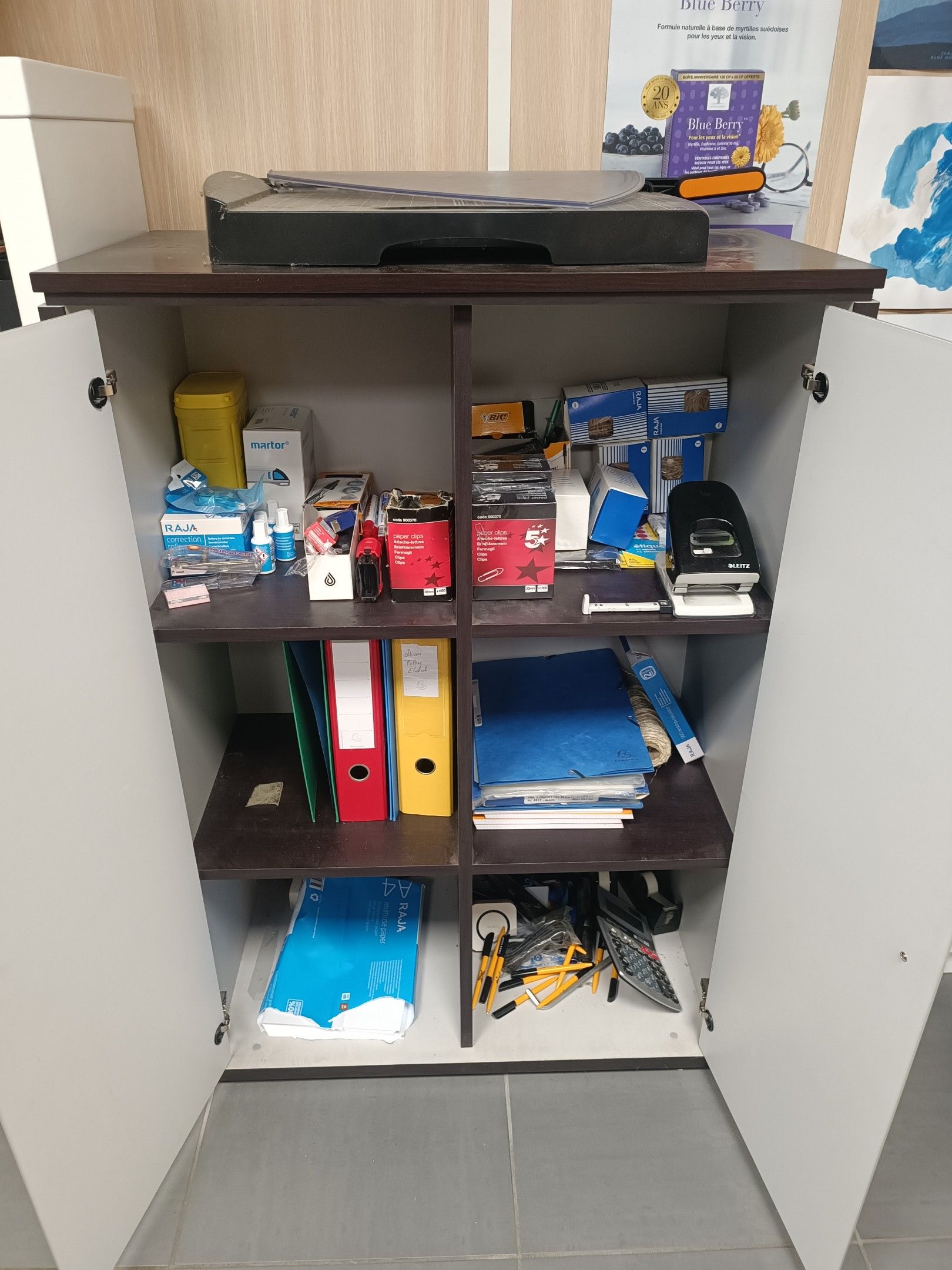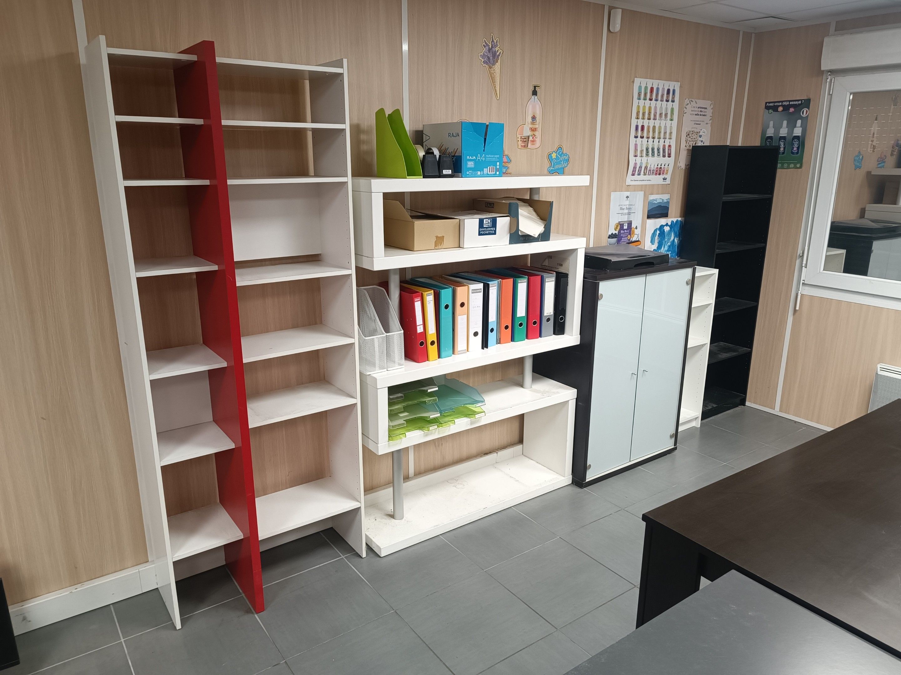4 Laminated wood desks 3X 78x160x88 and 1X 76x132x60 with 2 drawers / 4 Laminated wood shelves 1X 207x80x39, 1X 165x120x35, 1X 106x40x28 and 1X 280x60x24 / Base unit with 2 laminated wood glass doors 117x82x43 / 4 Office chairs / Office supplies
